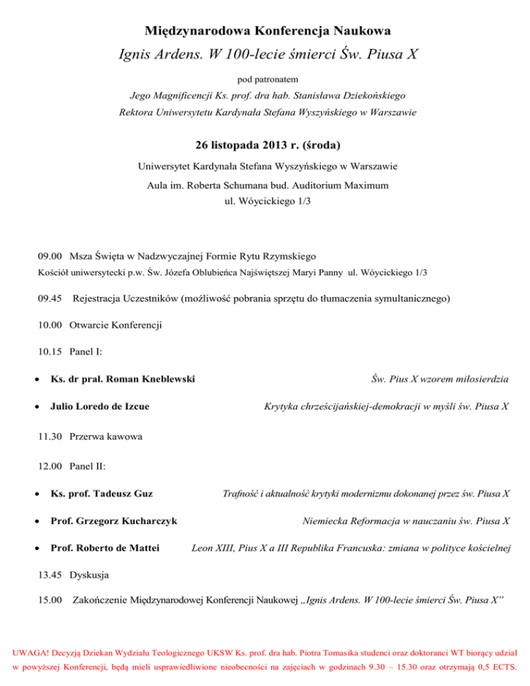 Międzynarodowa Konferencja Naukowa Ignis Ardens. W 100-lecie śmierci Św. Piusa X pod patronatem Jego Magnificencji Ks. prof. dra hab. Stanisława Dziekońskiego Rektora Uniwersytetu Kardynała Stefana Wyszyńskiego w Warszawie 26 listopada 2013 r. (środa) Uniwersytet Kardynała Stefana Wyszyńskiego w Warszawie Aula im. Roberta Schumana bud. Auditorium Maximum ul. Wóycickiego 1/3 09.00 Msza Święta w Nadzwyczajnej Formie Rytu Rzymskiego Kościół uniwersytecki p.w. Św. Józefa Oblubieńca Najświętszej Maryi Panny ul. Wóycickiego 1/3 09.45 Rejestracja Uczestników (możliwość pobrania sprzętu do tłumaczenia symultanicznego) 10.00 Otwarcie Konferencji 10.15 Panel I: Ks. dr prał. Roman Kneblewski Julio Loredo de Izcue Św. Pius X wzorem miłosierdzia Krytyka chrześcijańskiej-demokracji w myśli św. Piusa X 11.30 Przerwa kawowa 12.00 Panel II: Ks. prof. Tadeusz Guz Prof. Grzegorz Kucharczyk Prof. Roberto de Mattei Trafność i aktualność krytyki modernizmu dokonanej przez św. Piusa X Niemiecka Reformacja w nauczaniu św. Piusa X Leon XIII, Pius X a III Republika Francuska: zmiana w polityce kościelnej 13.45 Dyskusja 15.00 Zakończenie Międzynarodowej Konferencji Naukowej „Ignis Ardens. W 100-lecie śmierci Św. Piusa X” UWAGA! Decyzją Dziekan Wydziału Teologicznego UKSW Ks. prof. dra hab. Piotra Tomasika studenci oraz doktoranci WT biorący udział w powyższej Konferencji, będą mieli usprawiedliwione nieobecności na zajęciach w godzinach 9.30 – 15.30 oraz otrzymają 0,5 ECTS.