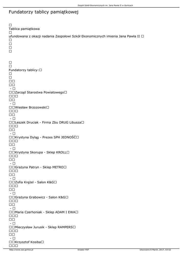 Zespół Szkół Ekonomicznych im. Jana Pawła II w Gorlicach Fundatorzy tablicy pamiątkowej Tablica pamiątkowa ufundowana z okazji nadania Zespołowi Szkół Ekonomicznych imienia Jana Pawła II Fundatorzy tablicy: - Zarząd Starostwa Powiatowego - Wiesław Brzozowski - Leszek Druciak - Firma Zbu DRUG Libusza - Krystyna Dyląg - Prezes SPH JEDNOŚĆ - Krystyna Skorupa - Sklep KROLL - Grażyna Patryn - Sklep METRO - Zofia Krężel - Salon K&G - Grażyna Grabowicz - Salon K&G - Maria Czerhoniak - Sklep ADAM I EWA - Mieczysław Jurusik - Sklep RAMPERS - Krzysztof Kosiba http://www.zse.gorlice.pl Kreator PDF Utworzono 8 March, 2017, 03:52 Zespół Szkół Ekonomicznych im. Jana Pawła II w Gorlicach - Samorząd Szkolny ZSE Gorlice - Rodzice uczniów ZSE Gorlice - Wanda Rogal - Kancelaria Podatkowa - Eugeniusz Dziurny - Dyrekcja, Nauczyciele i Pracownicy ZSE Gorlice - Adam Piechowicz - Księgarnia BAJKA - Joanna Pyrek - Sklep TĘCZA - Jan Wojnarski - Firma ANGUS SERDECZNIE DZIĘKUJEMY http://www.zse.gorlice.pl Kreator PDF Utworzono 8 March, 2017, 03:52
