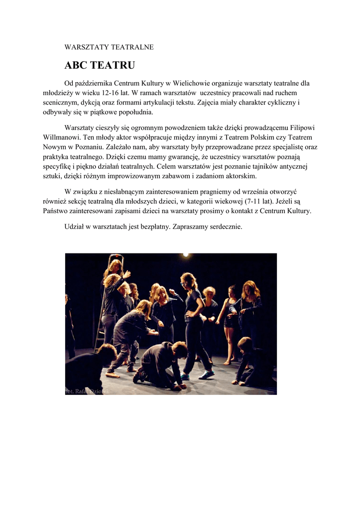 WARSZTATY TEATRALNE ABC TEATRU Od października Centrum Kultury w Wielichowie organizuje warsztaty teatralne dla młodzieży w wieku 12-16 lat. W ramach warsztatów uczestnicy pracowali nad ruchem scenicznym, dykcją oraz formami artykulacji tekstu. Zajęcia miały charakter cykliczny i odbywały się w piątkowe popołudnia. Warsztaty cieszyły się ogromnym powodzeniem także dzięki prowadzącemu Filipowi Willmanowi. Ten młody aktor współpracuje między innymi z Teatrem Polskim czy Teatrem Nowym w Poznaniu. Zależało nam, aby warsztaty były przeprowadzane przez specjalistę oraz praktyka teatralnego. Dzięki czemu mamy gwarancję, że uczestnicy warsztatów poznają specyfikę i piękno działań teatralnych. Celem warsztatów jest poznanie tajników antycznej sztuki, dzięki różnym improwizowanym zabawom i zadaniom aktorskim. W związku z niesłabnącym zainteresowaniem pragniemy od września otworzyć również sekcję teatralną dla młodszych dzieci, w kategorii wiekowej (7-11 lat). Jeżeli są Państwo zainteresowani zapisami dzieci na warsztaty prosimy o kontakt z Centrum Kultury. Udział w warsztatach jest bezpłatny. Zapraszamy serdecznie.
