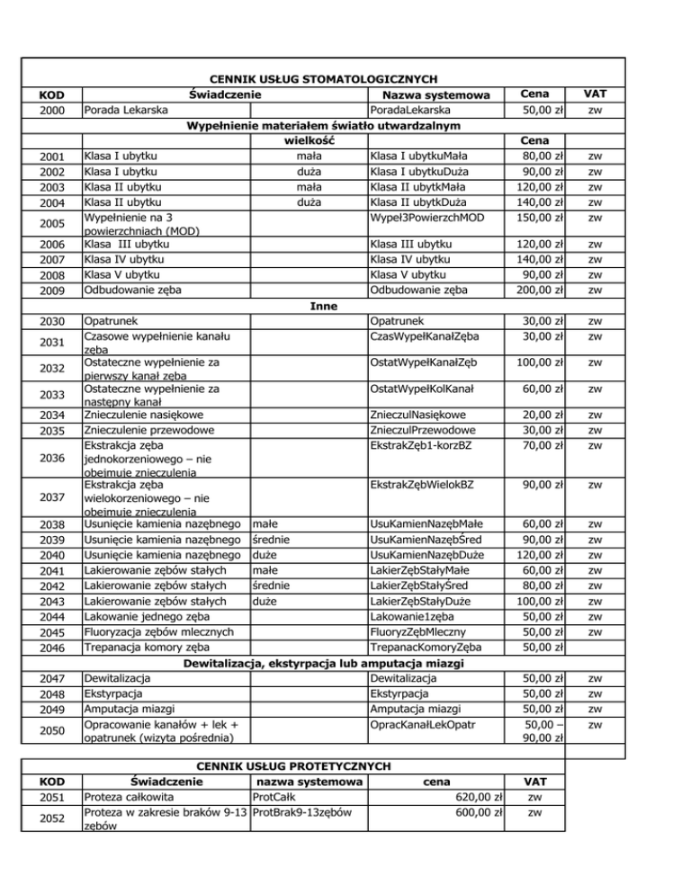 KOD 2000 2001 2002 2003 2004 2005 2006 2007 2008 2009 Porada Lekarska CENNIK USŁUG STOMATOLOGICZNYCH Świadczenie Nazwa systemowa PoradaLekarska Wypełnienie materiałem światło utwardzalnym wielkość Klasa I ubytku mała Klasa I ubytkuMała Klasa I ubytku duża Klasa I ubytkuDuża Klasa II ubytku mała Klasa II ubytkMała Klasa II ubytku duża Klasa II ubytkDuża Wypełnienie na 3 Wypeł3PowierzchMOD powierzchniach (MOD) Klasa III ubytku Klasa III ubytku Klasa IV ubytku Klasa IV ubytku Klasa V ubytku Klasa V ubytku Odbudowanie zęba Odbudowanie zęba Cena VAT 50,00 zł zw Cena 80,00 90,00 120,00 140,00 150,00 zł zł zł zł zł zw zw zw zw zw 120,00 140,00 90,00 200,00 zł zł zł zł zw zw zw zw Opatrunek CzasWypełKanałZęba 30,00 zł 30,00 zł zw zw OstatWypełKanałZęb 100,00 zł zw OstatWypełKolKanał 60,00 zł zw ZnieczulNasiękowe ZnieczulPrzewodowe EkstrakZęb1-korzBZ 20,00 zł 30,00 zł 70,00 zł zw zw zw EkstrakZębWielokBZ 90,00 zł zw Inne 2030 2031 2032 2033 2034 2035 2036 2037 2038 2039 2040 2041 2042 2043 2044 2045 2046 2047 2048 2049 2050 KOD 2051 2052 Opatrunek Czasowe wypełnienie kanału zęba Ostateczne wypełnienie za pierwszy kanał zęba Ostateczne wypełnienie za następny kanał Znieczulenie nasiękowe Znieczulenie przewodowe Ekstrakcja zęba jednokorzeniowego – nie obejmuje znieczulenia Ekstrakcja zęba wielokorzeniowego – nie obejmuje znieczulenia Usunięcie kamienia nazębnego Usunięcie kamienia nazębnego Usunięcie kamienia nazębnego Lakierowanie zębów stałych Lakierowanie zębów stałych Lakierowanie zębów stałych Lakowanie jednego zęba Fluoryzacja zębów mlecznych Trepanacja komory zęba małe średnie duże małe średnie duże UsuKamienNazębMałe UsuKamienNazębŚred UsuKamienNazębDuże LakierZębStałyMałe LakierZębStałyŚred LakierZębStałyDuże Lakowanie1zęba FluoryzZębMleczny TrepanacKomoryZęba Dewitalizacja, ekstyrpacja lub amputacja miazgi Dewitalizacja Dewitalizacja Ekstyrpacja Ekstyrpacja Amputacja miazgi Amputacja miazgi Opracowanie kanałów + lek + OpracKanałLekOpatr opatrunek (wizyta pośrednia) CENNIK USŁUG PROTETYCZNYCH Świadczenie nazwa systemowa Proteza całkowita ProtCałk Proteza w zakresie braków 9-13 ProtBrak9-13zębów zębów cena 620,00 zł 600,00 zł 60,00 90,00 120,00 60,00 80,00 100,00 50,00 50,00 50,00 zł zł zł zł zł zł zł zł zł zw zw zw zw zw zw zw zw 50,00 zł 50,00 zł 50,00 zł 50,00 – 90,00 zł zw zw zw zw VAT zw zw Proteza w zakresie braków 5-8 zębów Proteza w zakresie braków 1-4 zębów Łyżka indywidualna przy protezach częściowych Podścielenie protezy ProtBrak5-8zębów 520,00 zł zw ProtBrak1-4zębów 330,00 zł zw ŁyżIndywProtCzęśc 30,00 zł zw PodścielProtezy 200,00 zł zw NaprProtAkrylPęk 100,00 zł zw NaprProtAkrylZłam 100,00 zł zw NaprProtAkrylZęba 100,00 zł zw NaprProtAkrylKlam 100,00 zł zw KomplNaprProtAkryl 180,00 zł zw KażdyDodPktDostZęb 30,00 zł zw 2063 Naprawa protez akrylowych naprawa pęknięcia Naprawa protez akrylowych naprawa złamania Naprawa protez akrylowych dostawienie zęba Naprawa protez akrylowych dostawienie klamry Kompleksowa naprawa protez akrylowych obejmująca: naprawę pęknięcia lub złamania wraz z dostawieniem 1 zęba Każdy dodatkowy punkt do naprawy kompleksowej protez akrylowych (dostawienie zęba) Siatka wzmacniająca SiatkaWzmacniająca 180,00 zł zw 2064 Łuk metalowy ŁukMetalowy 180,00 zł zw 2065 Proteza szkieletowa ProtezaSzkieletowa 1 200,00 zł zw 2066 Szynoproteza Szynoproteza 1 200,00 zł zw KoronaPorcelPktwMo 480,00 zł zw 2068 Korona porcelanowa / pkt w moście Korona metalowa KoronaMetalowa 270,00 zł zw 2069 Korona akrylowa KoronaAkrylowa 180,00 zł zw 2070 Wkład k/k metodą bezpośrednią WkładK/KMetodąBezp 180,00 zł zw Wkład k/k metodą pośrednią WkładK/KMetodąPośr 240,00 zł zw 2072 Wkład k/k składany WkładK/Kskładany 300,00 zł zw 2073 Proteza acetalowa (DurAcetal) ProtezaAcetalowa 1 350,00 zł zw 2074 Proteza nylonowa (Valplast TCS) do 2 zębów ProtezaNylonowa2zęb ów 900,00 zł zw 2075 Proteza nylonowa (Valplast TCS) pow. 2 zębów ProtezNylon>2zębów 1 350,00 zł zw Proteza nylonowa (Valplast TCS) dost. do 3 zębów (1-3) Plamra acetalowa ProteNylonDost1-3z 600,00 zł zw PlamraAcetalowa 300,00 zł zw Proteza akrylowa na wkładach overdenture - na jednym wkładzie Dodatkowy (każdy kolejny) wkład overdenture za 1 szt ProtAkryl1WkłOverd 1 320,00 zł zw 660,00 zł zw Proteza szkieletowa na zamkach (cena podstawowa) ProtSzkieletNaZamk 1 350,00 zł zw 2053 2054 2055 2056 2057 2058 2059 2060 2061 2062 2067 2071 2076 2077 2078 2079 2080 KolejnWkładOverdent u 2081 2082 2083 2084 2085 Dodatkowo korona DodatkowoKorona 480,00 zł zw Dodatkowo zamek DodatkowoZamek 900,00 zł zw Dodatkowo frezowanie korony DodatkFrezowKorony 210,00 zł zw Dodatkowo (opcjonalnie) interlock Szyna wybielająca DodatkowInterlock 270,00 zł zw SzynaWybielająca 180,00 zł zw