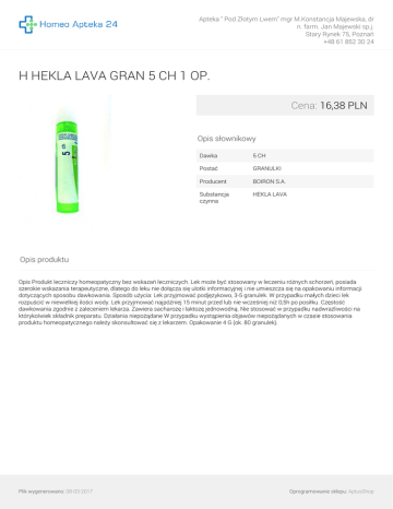 Apteka " Pod Złotym Lwem" mgr M.Konstancja Majewska, dr n. farm. Jan Majewski sp.j. Stary Rynek 75, Poznań +48 61 852 30 24 H HEKLA LAVA GRAN 5 CH 1 OP. Cena: 16,38 PLN Opis słownikowy Dawka 5 CH Postać GRANULKI Producent BOIRON S.A. Substancja czynna HEKLA LAVA Opis produktu Opis Produkt leczniczy homeopatyczny bez wskazań leczniczych. Lek może być stosowany w leczeniu różnych schorzeń, posiada szerokie wskazania terapeutyczne, dlatego do leku nie dołącza się ulotki informacyjnej i nie umieszcza się na opakowaniu informacji dotyczących sposobu dawkowania. Sposób użycia: Lek przyjmować podjęzykowo, 3-5 granulek. W przypadku małych dzieci lek rozpuścić w niewielkiej ilości wody. Lek przyjmować najpóźniej 15 minut przed lub nie wcześniej niż 0,5h po posiłku. Częstość dawkowania zgodnie z zaleceniem lekarza. Zawiera sacharozę i laktozę jednowodną. Nie stosować w przypadku nadwrażliwości na którykolwiek składnik preparatu. Działania niepożądane W przypadku wystąpienia objawów niepożądanych w czasie stosowania produktu homeopatycznego należy skonsultować się z lekarzem. Opakowanie 4 G (ok. 80 granulek). Plik wygenerowano: 08-03-2017 Powered by TCPDF (www.tcpdf.org) Oprogramowanie sklepu: AptusShop
