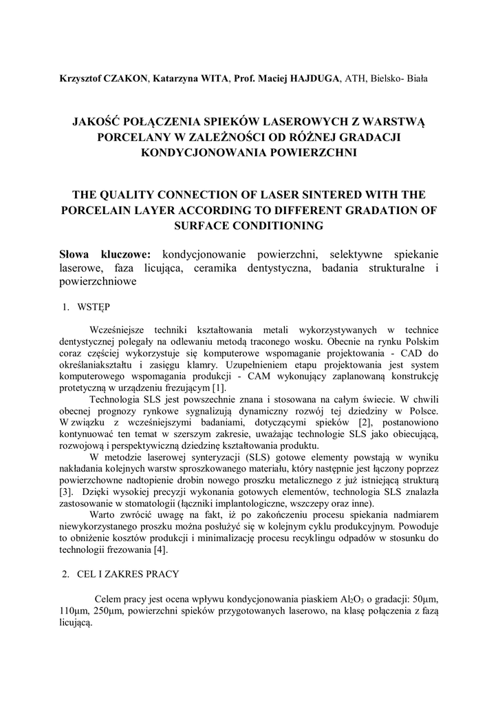 Krzysztof CZAKON, Katarzyna WITA, Prof. Maciej HAJDUGA, ATH, Bielsko- Biała JAKOŚĆ POŁĄCZENIA SPIEKÓW LASEROWYCH Z WARSTWĄ PORCELANY W ZALEŻNOŚCI OD RÓŻNEJ GRADACJI KONDYCJONOWANIA POWIERZCHNI THE QUALITY CONNECTION OF LASER SINTERED WITH THE PORCELAIN LAYER ACCORDING TO DIFFERENT GRADATION OF SURFACE CONDITIONING Słowa kluczowe: kondycjonowanie powierzchni, selektywne spiekanie laserowe, faza licująca, ceramika dentystyczna, badania strukturalne i powierzchniowe 1. WSTĘP Wcześniejsze techniki kształtowania metali wykorzystywanych w technice dentystycznej polegały na odlewaniu metodą traconego wosku. Obecnie na rynku Polskim coraz częściej wykorzystuje się komputerowe wspomaganie projektowania - CAD do określaniakształtu i zasięgu klamry. Uzupełnieniem etapu projektowania jest system komputerowego wspomagania produkcji - CAM wykonujący zaplanowaną konstrukcję protetyczną w urządzeniu frezującym [1]. Technologia SLS jest powszechnie znana i stosowana na całym świecie. W chwili obecnej prognozy rynkowe sygnalizują dynamiczny rozwój tej dziedziny w Polsce. W związku z wcześniejszymi badaniami, dotyczącymi spieków [2], postanowiono kontynuować ten temat w szerszym zakresie, uważając technologie SLS jako obiecującą, rozwojową i perspektywiczną dziedzinę kształtowania produktu. W metodzie laserowej synteryzacji (SLS) gotowe elementy powstają w wyniku nakładania kolejnych warstw sproszkowanego materiału, który następnie jest łączony poprzez powierzchowne nadtopienie drobin nowego proszku metalicznego z już istniejącą strukturą [3]. Dzięki wysokiej precyzji wykonania gotowych elementów, technologia SLS znalazła zastosowanie w stomatologii (łączniki implantologiczne, wszczepy oraz inne). Warto zwrócić uwagę na fakt, iż po zakończeniu procesu spiekania nadmiarem niewykorzystanego proszku można posłużyć się w kolejnym cyklu produkcyjnym. Powoduje to obniżenie kosztów produkcji i minimalizację procesu recyklingu odpadów w stosunku do technologii frezowania [4]. 2. CEL I ZAKRES PRACY Celem pracy jest ocena wpływu kondycjonowania piaskiem Al2O3 o gradacji: 50μm, 110μm, 250μm, powierzchni spieków przygotowanych laserowo, na klasę połączenia z fazą licującą. XII Konferencja Naukowa Majówka Młodych Biomechaników im. prof. Dagmary Tejszerskiej s. 22 Zakres pracy obejmuje wykonanie pojedynczych punktów protetycznych w postaci podbudów (tzw. czapeczek), technologią selektywnego spiekania laserowego SLS. Materiał sypki EOS CobaltChrome SP2 scalono za pomocą maszyny EOSINT M 270.Powierzchnie gotowych elementów opracowano korundem o gradacji: 50μm, 110μm, 250μm, w piaskarce Renfertbasicguattro ISpod ciśnieniem 3 Ba.Na metaliczny spiek o grubości 0,68 mm nałożono podłoże w postaci dwóch warstw opakera. Warstwę wierzchnią korony protetycznej licowano porcelaną Willi Geller Creation. Celem uzyskania jak najlepszych wyników badań proces napalania został oparty o mapę nakładania kolejnych warstw. Porcelanę nakładano w dwóch etapach. Dentynę wypalano w temperaturze 920ᵒC pod ciśnieniem 973 mB w piecu Galaxy ATC press. Tytułem oceny połączenia porcelany z warstwą wierzchnią podbudowy przeprowadzono w oparciu o standardowe badania strukturalne przy powiększeniu od 25 do 500 razy i powierzchniowe. Została przeprowadzona analiza warstwy wierzchniej w ocenie falistości i chropowatości. 3. WNIOSKI a) Badania metalograficzne potwierdzają oczekiwania odnośnie połączenia kolejnych warstw- ciągłości porcelany. b) Najlepszy efekt opracowania powierzchni dało kondycjonowanie piaskiem z przedziału 100-150μm. LITERATURA: [1] Majewski S., Pryliński M.: Materiały i technologie współczesnej protetyki stomatologicznej. Wyd. Czelej, Lublin 2013; [2] Czakon K., Wita K., Hajduga M.: Protetyczne podbudowy ze stałą warstwą ceramiczną. Akt. Probl. Biomechan. Zabrze 2014; [3] Borsuk-Nastaj B., Młynarski M.: Zastosowanie technologii selektywnego topienia laserem (SLM) w wykonawstwie stałych uzupełnień protetycznych. Protet. Stomatol. 2012; [4] Ryniewicz A. i wsp.: Badania biomateriałów metalowych do komputerowego wspomagania i wytwarzania stałych konstrukcji protetycznych. Zeszyty Nauk. Politechniki Śląskiej 2014;