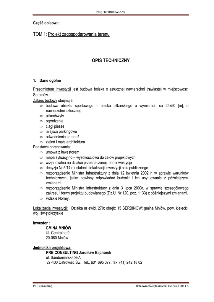 PROJEKT BUDOWLANY Część opisowa: TOM 1: Projekt zagospodarowania terenu OPIS TECHNICZNY 1. Dane ogólne Przedmiotem inwestycji jest budowa boiska o sztucznej nawierzchni trawiastej w miejscowości Serbinów. Zakres budowy obejmuje: • budowa obiektu sportowego – boiska piłkarskiego o wymiarach ca 25x50 [m], o nawierzchni sztucznej • piłkochwyty • ogrodzenie • ciągi piesze • miejsca parkingowe • odwodnienie i drenaŜ • zieleń i mała architektura Podstawa opracowania: • umowa z Inwestorem • mapa sytuacyjno – wysokościowa do celów projektowych • wizja lokalna na działce przeznaczonej pod inwestycję • decyzja Nr 5/14 o ustaleniu lokalizacji inwestycji celu publicznego • rozporządzenie Ministra Infrastruktury z dnia 12 kwietnia 2002 r. w sprawie warunków technicznych, jakim powinny odpowiadać budynki i ich usytuowanie z późniejszymi zmianami. • rozporządzenie Ministra Infrastruktury z dnia 3 lipca 2003r. w sprawie szczegółowego zakresu i formy projektu budowlanego (Dz.U. Nr 120, poz. 1133) z późniejszymi zmianami. • Polskie Normy. Lokalizacja inwestycji: Działka nr ewid. 270; obręb: 15 SERBINÓW; gmina Mniów, pow. kielecki, woj. świętokrzyskie Inwestor : GMINA MNIÓW Ul. Centralna 9 20-080 Mniów Jednostka projektowa: PRB CONSULTING Jarosław Bąchorek ul. Sandomierska 26A 27-400 Ostrowiec Św. tel., 601 695 077, fax. (41) 242 18 02 PRB Consulting Ostrowiec Świętokrzyski; kwiecień 2014 r. PROJEKT BUDOWLANY 2. Charakterystyka przedmiotowego terenu Opracowany teren działki oznaczony symbolem A-B-C-D-A nie jest objęty ustaleniami Ŝadnego planu zagospodarowania, przeznaczenie zgodnie z wydaną decyzją o ustaleniu lokalizacji inwestycji celu publicznego mającej na celu zaspokojenie potrzeb wspólnoty w zakresie kultury fizycznej i urządzeń sportowych. 3. Istniejący stan zagospodarowania - zabudowa działki, infrastruktura techniczna, komunikacja • działka przeznaczona pod inwestycję zabudowana jest dwoma utwardzeniami terenu w postaci płyt betonowych skorodowanych i uszkodzonych, istnieje ocembrowanie studni w postaci kręgów betonowych oraz urządzenie dwusłupowe sieci nn. Przez południową część działki przebiega wodociąg /W90/ zgodnie z mapą do celów projektowych. • Nieruchomość posiada dostępność komunikacyjną od drogi publicznej o kategorii powiatowej poprzez istniejący zjazd. Zjazd spełnia wymagane parametry dla zjazdu publicznego zgodnie z załączonym pismem znak: PZD.DM.5563.42/2014 z dnia 12.03.2014r. • działka znajduje się w zasięgu obszaru wyposaŜonego w ogólnogminne systemy sieci infrastruktury technicznej. Projektowany zakres inwestycji nie wymaga realizacji elementów infrastruktury technicznej poza zakres istniejących urządzeń w tym zakresie. Odprowadzenie wód opadowych - powierzchniowe. • naturalny spadek terenu w kierunku południowo-wschodnim • odpady stałe – gromadzone w śmietnikach metalowych i opróŜniane okresowo przez koncesjonowany zakład. 4. Granice terenu inwestycji Granica opracowania – część działki oznaczone symbolem A-B-C-D-A zlokalizowane jest na działce nr. ewid 270 Obręb 15 SERBINÓW, gm. Mniów, pow. kielecki, woj. świętokrzyskie Przedmiotowa część działki : • od południa graniczy z działką nr 435 /droga powiatowa nr 0467T/ • od zachodu graniczy z działką nr 266/3 stanowiącą drogę dojazdową do działek sąsiednich • od północy graniczy z działką nr 269 niezabudowaną • od wschodu graniczy z działką nr 269/1 zabudowana budynkiem mieszkalnym parterowym oraz budynkami gospodarczymi. 5. Nowoprojektowane elementy zagospodarowania działki Projektuje się budowę elementów tj: • budowa obiektu sportowego – boiska piłkarskiego o wymiarach ca 25x50 [m], o nawierzchni sztucznej • piłkochwyty • ogrodzenie • ciągi piesze • miejsca parkingowe • odwodnienie i drenaŜ • zieleń i mała architektura PRB Consulting Ostrowiec Świętokrzyski; kwiecień 2014 r. PROJEKT BUDOWLANY NaleŜy rozebrać kolidujące elementy zagospodarowania w postaci utwardzeń terenu ze skorodowanego betonu oraz usunąć do utylizacji. NaleŜy zwrócić szczególną uwagę na zabezpieczenie terenu prowadzonych prac, w szczególności rozbiórkowych ze względu na bliskość drogi powiatowej. Wszelkie prace prowadzić w moŜliwie najmniej kolidujący sposób. Po zdjęciu warstwy humusu naleŜy wykonać wykopy oraz nasypy zagęszczone z piasku pod warstwy konstrukcyjne podbudowy zgodnie z profilami terenowymi. Zdjęty humus naleŜy wykorzystać do budowy wierzchniej warstwy /ca 15 cm/ nasypów przeznaczonych do obsiania trawą, po zdjęciu naleŜy humus dać na odkład a następnie wbudować. Sposób postępowania z usuwanymi lub przemieszczanymi, w związku z realizacją inwestycji, odpadami/ masami ziemi lub skalnymi, gruzem/ wymaga uzgodnienia – zgodnie z wymogami ustawy z dnia 14 grudnia 2012r. o odpadach (Dz. U. z 2013 r. poz.21). Wykonawca po uzgodnieniu z Inwestorem musi przekazać Inwestorowi wszelkie dokumenty zgodnie z wymogami ustawy z dnia 14 grudnia 2012r. o odpadach (Dz. U. z 2013 r. poz.21). dotyczące wbudowania lub utylizacji materiałów rozbiórkowych lub mas ziemnych związanych z niwelacją terenu do rzędnych projektowanych. Boisko do piłki noŜnej. Informacje ogólne. Boisko o wymiarach: szer. 25,00 [m] dł. 50,00 [m] powierzchnia: 1250,00 [m2]. Boisko o nawierzchni z trawy syntetycznej o dł. włókna 6cm. Wokół boiska zaprojektowano obrzeŜa betonowe z nakłądką elastyczną 8x(25+4)x100cm na ławie betonowej z oporem. Boisko posiadać będzie system drenaŜu wgłębnego. Wody opadowe z drenaŜu boiska odprowadzane będą do studni zbiorczych wg opracowania branŜowego. Trawa syntetyczna. Zaprojektowano nawierzchnię boiska z trawy syntetycznej o dł. włókna 6cm i parametrach nie gorszych niŜ przedstawione poniŜej wg przykładowego systemu „monofilament”. Trawa piłkarska o wysokości włókna mini