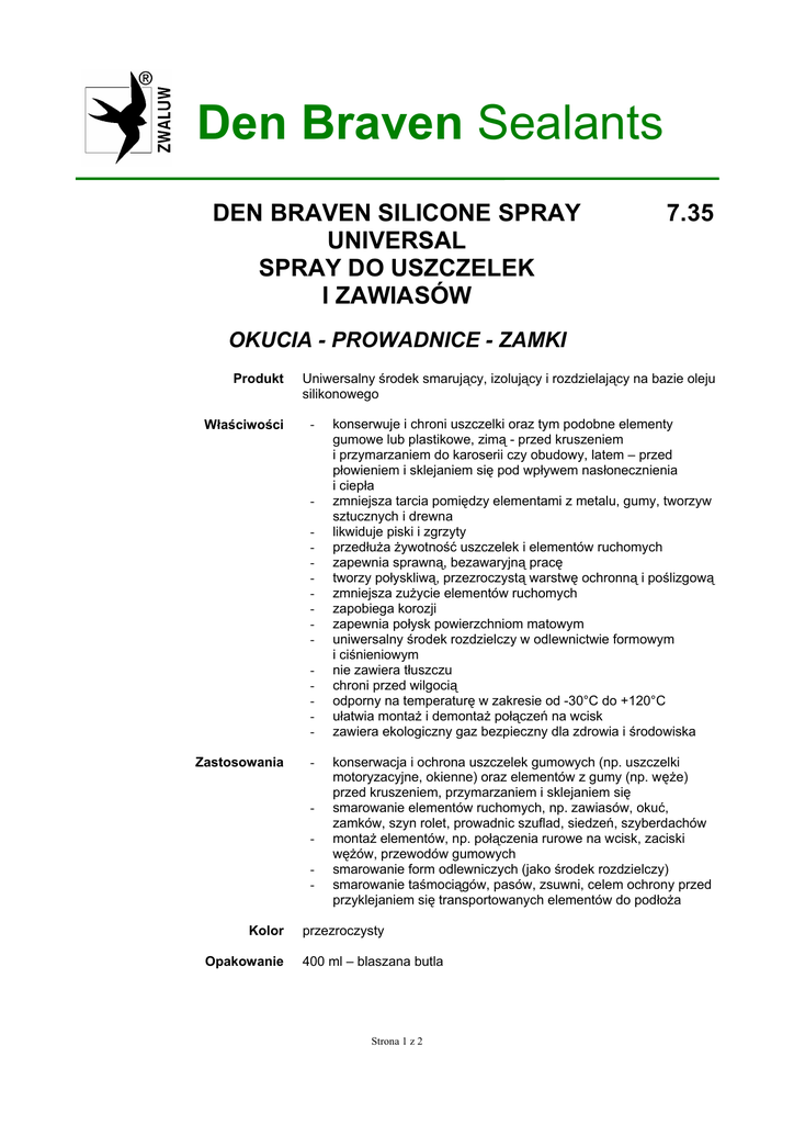 Den Braven Sealants DEN BRAVEN SILICONE SPRAY UNIVERSAL SPRAY DO USZCZELEK I ZAWIASÓW 7.35 OKUCIA - PROWADNICE - ZAMKI Produkt Właściwości Uniwersalny środek smarujący, izolujący i rozdzielający na bazie oleju silikonowego - Zastosowania - Kolor Opakowanie konserwuje i chroni uszczelki oraz tym podobne elementy gumowe lub plastikowe, zimą - przed kruszeniem i przymarzaniem do karoserii czy obudowy, latem – przed płowieniem i sklejaniem się pod wpływem nasłonecznienia i ciepła zmniejsza tarcia pomiędzy elementami z metalu, gumy, tworzyw sztucznych i drewna likwiduje piski i zgrzyty przedłuża żywotność uszczelek i elementów ruchomych zapewnia sprawną, bezawaryjną pracę tworzy połyskliwą, przezroczystą warstwę ochronną i poślizgową zmniejsza zużycie elementów ruchomych zapobiega korozji zapewnia połysk powierzchniom matowym uniwersalny środek rozdzielczy w odlewnictwie formowym i ciśnieniowym nie zawiera tłuszczu chroni przed wilgocią odporny na temperaturę w zakresie od -30°C do +120°C ułatwia montaż i demontaż połączeń na wcisk zawiera ekologiczny gaz bezpieczny dla zdrowia i środowiska konserwacja i ochrona uszczelek gumowych (np. uszczelki motoryzacyjne, okienne) oraz elementów z gumy (np. węże) przed kruszeniem, przymarzaniem i sklejaniem się smarowanie elementów ruchomych, np. zawiasów, okuć, zamków, szyn rolet, prowadnic szuflad, siedzeń, szyberdachów montaż elementów, np. połączenia rurowe na wcisk, zaciski wężów, przewodów gumowych smarowanie form odlewniczych (jako środek rozdzielczy) smarowanie taśmociągów, pasów, zsuwni, celem ochrony przed przyklejaniem się transportowanych elementów do podłoża przezroczysty 400 ml – blaszana butla Strona 1 z 2 DEN BRAVEN SILICONE SPRAY UNIVERSAL – SPRAY DO USZCZELEK I ZAWIASÓW, 7.35 Okres trwałości 24 miesiące. Zamknięte opakowanie przechowywać w temperaturze od +5°C do +25°C. Odporny w transporcie do –15°C. DANE TECHNICZNE Baza Odporność termiczna Zawartość silikonu Ściekanie olej silikonowy od –30°C do +120°C 11 % (ujęcie wagowe w stosunku do całkowitej pojemności produktu) nie występuje; środek dobrze przyczepny także do pionowych powierzchni PODŁOŻA Rodzaje powierzchni Przygotowanie Stan podłoża metale, tworzywa sztuczne, guma, drewno Podłoże należy oczyścić, odtłuścić i przetrzeć suchą ściereczką. Powierzchnia czysta i sucha SPOSÓB UŻYCIA Temperatura otoczenia Zalecenia Czyszczenie Ograniczenia Bezpieczeństwo ogólne ATEST od +5°C do +35°C Pojemnik przed użyciem silnie wstrząsnąć. Spryskiwać z odległości 10-20 cm. Nadmiar smaru usunąć suchą szmatką. Do czyszczenia rąk, narzędzi czy powierzchni zaleca się użyć specjalne ściereczki czyszczące Den Braven Bravo. Ewentualnie do mycia narzędzi po zakończeniu pracy można stosować terpentynę, benzynę ekstrakcyjną lub środek Den Braven MEK Cleaner. Do mycia rąk można także użyć środek Den Braven Handfris. Z uwagi na elektrostatyczny charakter środka, powierzchnie spryskane środkiem mogą lekko przyciągać kurz. Patrz: Karta charakterystyki substancji niebezpiecznej 7.35 UWAGA: Przechowywać poza zasięgiem dzieci. Państwowy Zakład Higieny Odpowiedzialność: Podane informacje są wynikiem badań i doświadczeń Den Braven Sealants, co jest podstawą ich rzetelności i wiarygodności. Producent nie mógł przewidzieć jednak wszystkich możliwości zastosowania swoich produktów, a ponieważ sposób użycia produktów jest całkowicie poza jego kontrolą, użytkownik bierze na siebie odpowiedzialność za właściwy wybór i zastosowanie produktu. Producent nie bierze na siebie odpowiedzialności za występujące uszkodzenia lub zły stan podłoża, które mogą być wynikiem czynników atmosferycznych, przygotowania wstępnego lub wad konstrukcyjnych. 24/11/2006 Strona 2 z 2