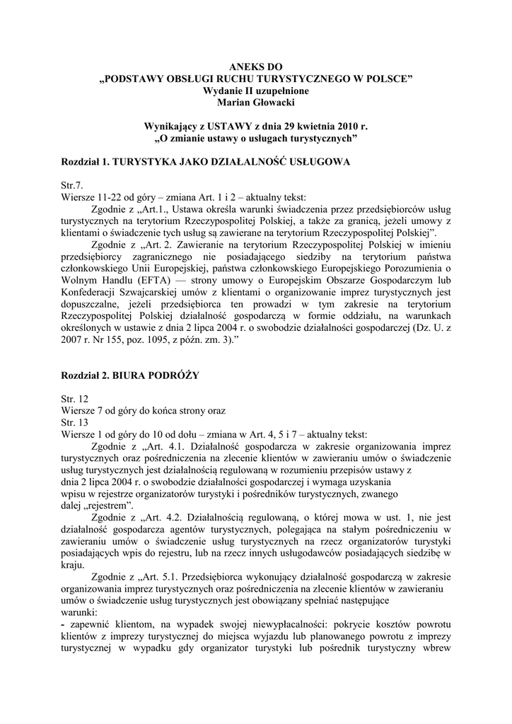 ANEKS DO „PODSTAWY OBSŁUGI RUCHU TURYSTYCZNEGO W POLSCE” Wydanie II uzupełnione Marian Głowacki Wynikający z USTAWY z dnia 29 kwietnia 2010 r. „O zmianie ustawy o usługach turystycznych” Rozdział 1. TURYSTYKA JAKO DZIAŁALNOŚĆ USŁUGOWA Str.7. Wiersze 11-22 od góry – zmiana Art. 1 i 2 – aktualny tekst: Zgodnie z „Art.1., Ustawa określa warunki świadczenia przez przedsiębiorców usług turystycznych na terytorium Rzeczypospolitej Polskiej, a także za granicą, jeżeli umowy z klientami o świadczenie tych usług są zawierane na terytorium Rzeczypospolitej Polskiej”. Zgodnie z „Art. 2. Zawieranie na terytorium Rzeczypospolitej Polskiej w imieniu przedsiębiorcy zagranicznego nie posiadającego siedziby na terytorium państwa członkowskiego Unii Europejskiej, państwa członkowskiego Europejskiego Porozumienia o Wolnym Handlu (EFTA) — strony umowy o Europejskim Obszarze Gospodarczym lub Konfederacji Szwajcarskiej umów z klientami o organizowanie imprez turystycznych jest dopuszczalne, jeżeli przedsiębiorca ten prowadzi w tym zakresie na terytorium Rzeczypospolitej Polskiej działalność gospodarczą w formie oddziału, na warunkach określonych w ustawie z dnia 2 lipca 2004 r. o swobodzie działalności gospodarczej (Dz. U. z 2007 r. Nr 155, poz. 1095, z późn. zm. 3).” Rozdział 2. BIURA PODRÓŻY Str. 12 Wiersze 7 od góry do końca strony oraz Str. 13 Wiersze 1 od góry do 10 od dołu – zmiana w Art. 4, 5 i 7 – aktualny tekst: Zgodnie z „Art. 4.1. Działalność gospodarcza w zakresie organizowania imprez turystycznych oraz pośredniczenia na zlecenie klientów w zawieraniu umów o świadczenie usług turystycznych jest działalnością regulowaną w rozumieniu przepisów ustawy z dnia 2 lipca 2004 r. o swobodzie działalności gospodarczej i wymaga uzyskania wpisu w rejestrze organizatorów turystyki i pośredników turystycznych, zwanego dalej „rejestrem”. Zgodnie z „Art. 4.2. Działalnością regulowaną, o której mowa w ust. 1, nie jest działalność gospodarcza agentów turystycznych, polegająca na stałym pośredniczeniu w zawieraniu umów o świadczenie usług turystycznych na rzecz organizatorów turystyki posiadających wpis do rejestru, lub na rzecz innych usługodawców posiadających siedzibę w kraju. Zgodnie z „Art. 5.1. Przedsiębiorca wykonujący działalność gospodarczą w zakresie organizowania imprez turystycznych oraz pośredniczenia na zlecenie klientów w zawieraniu umów o świadczenie usług turystycznych jest obowiązany spełniać następujące warunki: - zapewnić klientom, na wypadek swojej niewypłacalności: pokrycie kosztów powrotu klientów z imprezy turystycznej do miejsca wyjazdu lub planowanego powrotu z imprezy turystycznej w wypadku gdy organizator turystyki lub pośrednik turystyczny wbrew obowiązkowi nie zapewnia tego powrotu, a także zapewnić klientom zwrot wpłat wniesionych tytułem zapłaty za imprezę turystyczną w wypadku gdy z przyczyn dotyczących organizatora turystyki lub pośrednika turystycznego oraz osób, które działają w ich imieniu impreza turystyczna nie zostanie zrealizowana, a także zapewnić klientom zwrot części wpłat wniesionych tytułem zapłaty za imprezę turystyczną, odpowiadającą części imprezy turystycznej, która nie zostanie zrealizowana z przyczyn dotyczących organizatora turystyki lub pośrednika turystycznego oraz osób, które działają w ich imieniu, przez: a) zawarcie umowy gwarancji bankowej lub ubezpieczeniowej, lub b) zawarcie umowy ubezpieczenia na rzecz klientów, lub c) przyjmowanie wpłat klientów wyłącznie na rachunek powierniczy, jeżeli wykonuje usługi turystyczne wyłącznie na terenie kraju i złoży marszałkowi województwa oświadczenie o przyjmowaniu wpłat na rachunek powierniczy; - składać marszałkowi województwa oryginały lub potwierdzone przez podmioty, które je podpisały, odpisy kolejnych umów, o których mowa wyżej, nie później niż 14 dni przed upływem terminu obowiązywania umowy poprzedniej; przedsiębiorcy zaprzestający działalności gospodarczej są zwolnieni z tego obowiązku, jeżeli zawiadomią marszałka województwa o zaprzestaniu działalności organizatora turystyki lub pośrednika turystycznego.” Do Art. 4.1. dodano 1a i 1b, w brzmieniu: „1a. W wypadku przedsiębiorcy zagranicznego posiadającego siedzibę na terytorium państwa członkowskiego Unii Europejskiej, państwa członkowskiego Europejskiego Porozumienia o Wolnym Handlu (EFTA) -strony umowy o Europejskim Obszarze Gospodarczym lub Konfederacji Szwajcarskiej za spełnienie warunku prowadzenia działalności, o którym mowa w ust. 1 pkt 2, uznaje się posiadanie zabezpieczenia finansowego w formie, która jest uznawana w państwie, w którym przedsiębiorca posiada siedzibę. 1b. W wypadku gdy równoważność zabezpieczenia finansowego, o którym mowa w ust. 1a, jest niższa niż minimalna wysokość zabezpieczenia wymaganego od przedsiębiorcy posiadającego siedzibę lub oddział na terytorium Rzeczypospolitej Polskiej, określona w przepisach wydanych na podstawie art. 10, przedsiębiorca, o którym mowa w ust. 1a, przedstawia dodatkową gwarancję bankową lub ubezpieczeniową wyrównującą wysokość posiadanego zabezpieczenia finansowego do minimalnej wysokości zabezpieczenia, wymaganego od przedsiębiorcy posiadającego siedzibę lub oddział na terytorium Rzeczypospolitej Polskiej.”, Zgodnie z Art.7: „1. Organem właściwym do prowadzenia rejestru jest marszałek województwa właściwy ze względu na siedzibę przedsiębiorcy, a w wypadku przedsiębiorcy zagranicznego, który utworzył oddział na terytorium Rzeczypospolitej Polskiej zgodnie z przepisami ustawy z dnia 2 lipca 2004 r. o swobodzie działalności gospodarczej, organem właściwym do prowadzenia rejestru jest marszałek województwa właściwy ze względu na siedzibę oddziału. 2. W wypadku przedsiębiorcy posiadającego siedzibę i prowadząc