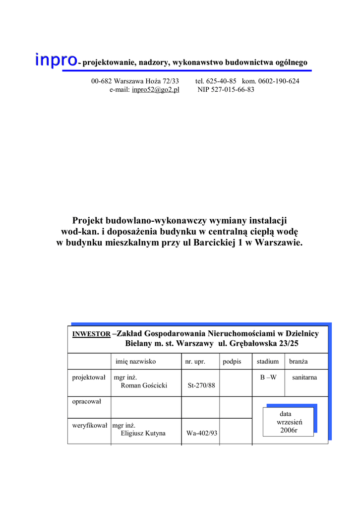 Projekt budowlano-wykonawczy wymiany instalacji wod
