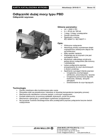 KARTA KATALOGOWA WYROBU Aktualizacja: 2010-02-11 Strona 1/2 Odłączniki duŜej mocy typu PBD Odłączniki szynowe Główne parametry: • • • • • Un = 2000 V DC In = 20 kA do 160 kA 1-bieg./ 2-bieg./ przełączalne Zaciski aluminiowe Zgodność z normą IEC 60947-3 / IEC 60077-1 Opis: • • • • • • • Widoczne rozłączenie Absorbują zmiany wymiarowe dzięki rozpręŜeniom (elastyczne złącza nie są konieczne) Mały spadek napięcia Wspierają się na szynach (nie jest wymagana rama) MoŜliwość całkowitego przykrycia jednej strony rozłącznika (dla ochrony i oddzielenia) Łatwe podłączenie poprzez przyspawanie do szyn aluminiowych o duŜym przekroju Spełnienie wymagań klienta poprzez: o Urządzenia uruchamiające (silnikowe, pneumatyczne, ręczne) o Urządzenia pomocnicze (łączniki krańcowe, blokady, skrzynki sterujące) o Dostosowanie do szyn łączących. Technologia • • • • • • Zaciski miedziane albo kombinowane jako opcja Wszystkie styki są posrebrzone i lutowane w wysokiej temperaturze (specjalny proces) Mechanicznie niezaleŜne ruchome zestyki z mocnymi spręŜynami Kontakt elektryczny za pomocą nakładek stykowych, punkt do punktu Mechanizm operacyjny z zamkniętym systemem przegubowym Na Ŝyczenie: budowa dwubiegunowa albo przełączalna poprzez połączenie boczne dwóch rozłączników JEAN MUELLER POLSKA Sp. z o.o. 02-293 Warszawa, ul. Krótka 4 tel. 22 751 79 01, fax 22 751 79 03 e-mail: [email protected] www.jeanmueller.pl KARTA KATALOGOWA WYROBU Aktualizacja: 2010-02-11 Strona 2/2 Odłączniki duŜej mocy typu PBD Odłączniki szynowe Główne parametry techniczne Parametry elektryczne Przyrost temperatury przy prądzie znamionowym (przy maks. temperaturze otoczenia 40°C) Spadek napięcia przy prądzie znamionowym Wytrzymałość zwarciowa (po konfiguracji obwodu) Wytrzymałość dielektryczna - pomiędzy częściami pod napięciem w pozycji otwarcia - pomiędzy częściami pod napięciem a ziemią - pomiędzy stykami pomocniczymi a ziemią - pomiędzy silnikiem (AC) a ziemią Parametry mechaniczne Zapewniona odkształcalność standardowa (wzdłuŜna (dL) / poprzeczna (dT) / osiowa (dA)) (moŜliwe większe wartości na Ŝyczenie) Wytrzymałość mechaniczna (przy zachowaniu instrukcji dotyczących konserwacji). WyŜsza wytrzymałość na Ŝyczenie Typowy czas trwania operacji otwarcia albo zamknięcia - operacja silnikowa - operacja pneumatyczna Wytrzymałość punktowa na temperaturę na częściach pod napięciem bez szkody dla urządzenia poniŜej 65°C poniŜej 60 mV 8 x ( prąd znamionowy) 10 kV - 50 Hz - 1 min 10 kV - 50 Hz - 1 min 2.5 kV -50 Hz -1 mn 2 kV -50 Hz -1 mn 20 / 20 / 20 mm 1000 cykli poniŜej 20 sekund poniŜej 1 sekundy 140°C JEAN MUELLER POLSKA Sp. z o.o. 02-293 Warszawa, ul. Krótka 4 tel. 22 751 79 01, fax 22 751 79 03 e-mail: [email protected] www.jeanmueller.pl