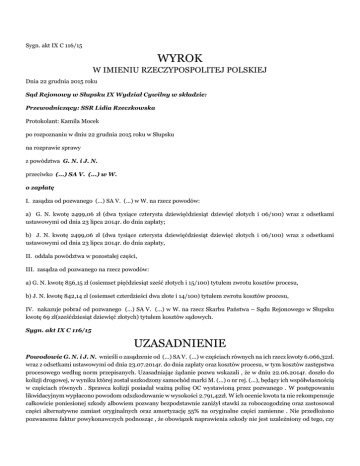 Sygn. akt IX C 116/15 WYROK W IMIENIU RZECZYPOSPOLITEJ POLSKIEJ Dnia 22 grudnia 2015 roku Sąd Rejonowy w Słupsku IX Wydział Cywilny w składzie: Przewodniczący: SSR Lidia Rzeczkowska Protokolant: Kamila Mocek po rozpoznaniu w dniu 22 grudnia 2015 roku w Słupsku na rozprawie sprawy z powództwa G. N. i J. N. przeciwko (...) SA V. (...) w W. o zapłatę I. zasądza od pozwanego (...) SA V. (...) w W. na rzecz powodów: a) G. N. kwotę 2499,06 zł (dwa tysiące czterysta dziewięćdziesiąt dziewięć złotych i 06/100) wraz z odsetkami ustawowymi od dnia 23 lipca 2014r. do dnia zapłaty; b) J. N. kwotę 2499,06 zł (dwa tysiące czterysta dziewięćdziesiąt dziewięć złotych i 06/100) wraz z odsetkami ustawowymi od dnia 23 lipca 2014r. do dnia zapłaty, II. oddala powództwa w pozostałej części, III. zasądza od pozwanego na rzecz powodów: a) G. N. kwotę 856,15 zł (osiemset pięćdziesiąt sześć złotych i 15/100) tytułem zwrotu kosztów procesu, b) J. N. kwotę 842,14 zł (osiemset czterdzieści dwa złote i 14/100) tytułem zwrotu kosztów procesu, IV. nakazuje pobrać od pozwanego (...) SA V. (...) w W. na rzecz Skarbu Państwa – Sądu Rejonowego w Słupsku kwotę 69 zł(sześćdziesiąt dziewięć złotych) tytułem kosztów sądowych. Sygn. akt IX C 116/15 UZASADNIENIE Powodowie G. N. i J. N. wnieśli o zasądzenie od (...) SA V. (...) w częściach równych na ich rzecz kwoty 6.066,32zł. wraz z odsetkami ustawowymi od dnia 23.07.2014r. do dnia zapłaty oraz kosztów procesu, w tym kosztów zastępstwa procesowego według norm przepisanych. Uzasadniając żądanie pozwu wskazali , że w dniu 22.06.2014r. doszło do kolizji drogowej, w wyniku której został uszkodzony samochód marki M. (...) o nr rej. (...), będący ich współwłasnością w częściach równych . Sprawca kolizji posiadał ważną polisę OC wystawioną przez pozwanego . W postępowaniu likwidacyjnym wypłacono powodom odszkodowanie w wysokości 2.791,42zł. W ich ocenie kwota ta nie rekompensuje całkowicie poniesionej szkody albowiem pozwany bezpodstawnie zaniżył stawki za roboczogodzinę oraz zastosował części alternatywne zamiast oryginalnych oraz amortyzację 55% na oryginalne części zamienne . Nie przedłożono pozwanemu faktur powykonawczych podnosząc , że obowiązek naprawienia szkody nie jest uzależniony od tego, czy poszkodowany dokonał naprawy pojazdu. Wartość szkody wyceniono na kwotę 8.857,75zł. ( na podstawie kalkulacji sporządzonej na prywatne zlecenie ) i niniejszym pozwem dochodzą dopłaty należnego odszkodowania . (...) SA V. (...) w W. wniosło o oddalenie powództwa w całości i zasądzenie solidarnie od powodów na rzecz pozwanego kosztów postępowania , w tym zastępstwa procesowego wg norm przepisanych . Zarzuciło powodom, że nie udowodnili poniesienia kosztów naprawy jakich się domagają . Przedstawiona prywatna opinia nie ma waloru dowodowego w rozumieniu art.227 kpc . W ocenie pozwanego ustalone w trakcie postępowania likwidacyjnego koszty przywrócenia pojazdu powodów do stanu sprzed kolizji są celowe i ekonomicznie uzasadnione i tylko takie należą się powodom w ramach obowiązku naprawienia szkody . Nadto z uwagi na wiek pojazdu ( eksploatowany od 2008 roku ) dokonanie naprawy tylko i wyłącznie w oparciu o części oryginalne spowoduje wzrost wartości rynkowej pojazdu w porównaniu do tej , jaką posiadał przez zdarzeniem powodującym szkodę . Sąd ustalił : W dniu 22.06.2014r. w miejscowości R. na skrzyżowaniu dróg doszło do kolizji drogowej . Kierujący pojazdem F. (...) o nr rej. (...) wymusił pierwszeństwo przejazdu wobec jadącego od strony miejscowości G. w stronę Zębowa pojazdu M. (...) o nr rej. (...) , którym kierował G. N. . W wyniku owego wymuszenia doszło do zderzenia pojazdów . W aucie sprawcy został połamany przedni zderzak i uszkodzona przednia prawa lampa . W aucie M. (...) uszkodzeniu uległy : lewy błotnik przedni , lewa lampa przednia , zderzak przedni , stwierdzono ocieranie o błotnik drzwi lewych przednich przy otwieraniu . G. N. i J. N. są współwłaścicielami samochodu M. (...) o nr rej. (...) /częściowo bezsporne, nadto dowód: kserokopia dowodu rejestracyjnego, oświadczenie uczestników kolizji , szkic sytuacyjny w aktach szkody / Pojazd sprawcy szkody objęty był ubezpieczeniem z tytułu OC posiadaczy pojazdów mechanicznych w (...) SA V. (...) . W dniu 26.06.2014r., po dokonanych przez przedstawiciela ubezpieczyciela oględzinach pojazdu , ustalono wartość kosztów jego naprawy na kwotę 2.791,42zł. W rozliczeniu zastosowano stawki godzinowe w wysokości 49zł., zastosowano urealnienie w wysokości 55% , przyjęto ceny części M. . Pozwany wypłacił powodom tytułem odszkodowania w/w kwotę 2.791,42zł. /bezsporne, nadto dowód: analiza kosztów naprawy, decyzja w aktach szkody / Pismem z dnia 20.08.2014r. pełnomocnik powodów domagał się dopłaty odszkodowania w kwocie 6.066,33zł. w oparciu o załączoną kalkulację naprawy nr (...) sporządzoną na zlecenie G. N. . Pozwany nie uczynił zadość zgłoszonemu roszczeniu uzależniając wypłacenie wyższego odszkodowania od udokumentowania , że koszty naprawy uszkodzeń są wyższe od wypłaconego odszkodowania , w tym przedłożenia faktury powykonawczej . /dowód: pismo pełnomocnika powodów z powoda z 20.08.2014r. i kalkulacja naprawy , pismo pozwanego z 10.09.2014r. w aktach szkody / Celowe i ekonomicznie uzasadnione koszty przywrócenia pojazdu powodów do stanu stanu sprzed szkody z dnia 22.06.2014r. , uwzględniające ceny części zamiennych oryginalnych jakości O i Q oraz przeciętne stawki za roboczogodzinę z daty szkody , wynoszą 7.789,54zł. brutto . /dowód: opinia biegłego sądowego W. B. – k.73-85, opinia uzupełniająca –k.115 / Sąd zważył : Kwestię odpowiedzialności odszkodowawczej z tytułu szkód komunikacyjnych regulują przepisy ustawy z dnia 22 maja 2003 roku o ubezpieczeniach obowiązko