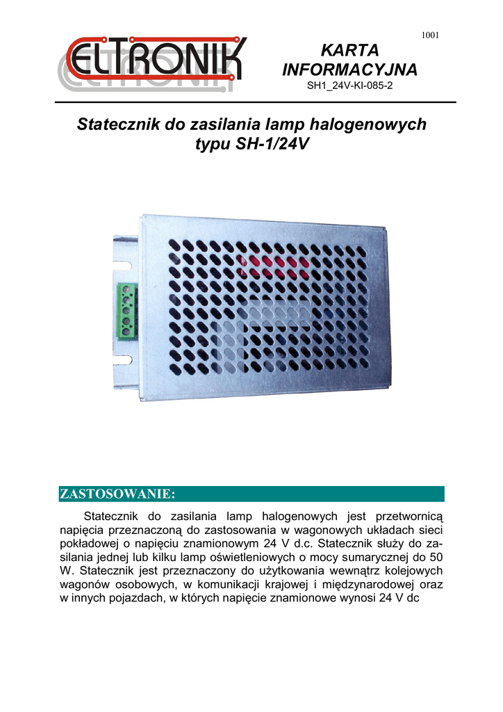 1001 KARTA INFORMACYJNA SH1_24V-KI-085-2 Statecznik do zasilania lamp halogenowych typu SH-1/24V ZASTOSOWANIE: Q Statecznik do zasilania lamp halogenowych jest przetwornicą napięcia przeznaczoną do zastosowania w wagonowych układach sieci pokładowej o napięciu znamionowym 24 V d.c. Statecznik służy do zasilania jednej lub kilku lamp oświetleniowych o mocy sumarycznej do 50 W. Statecznik jest przeznaczony do użytkowania wewnątrz kolejowych wagonów osobowych, w komunikacji krajowej i międzynarodowej oraz w innych pojazdach, w których napięcie znamionowe wynosi 24 V dc 1001 OPIS: Przetwornica jest wykonana z wykorzystaniem tranzystorów polowych i specjalizowanych układów scalonych. Napięcie wejściowe 24 V d.c. jest przetwarzane na prąd zmienny o przebiegu zbliżonym do prostokątnego. To napięcie jest transformowane za pomocą transformatora impulsowego na odpowiednio niższe, które następnie jest prostowane za pomocą prostownika. Napięcie wyjściowe jest utrzymywane na stałym poziomie poprzez układ elektroniczny, wpływający na szerokość impulsu sterującego (modulator szerokości impulsów) PWM. Regulacja wypełnienia impulsów wyjściowych i stabilizacja napięcia wyjściowego odbywa się za pomocą układu scalonego, zasilanego napięciem 24 V. Statecznik jest wyposażony w elektroniczne zabezpieczenie przeciwzwarciowe. Zwarcie zacisków wyjściowych nie spowoduje uszkodzenia statecznika. Po ustąpieniu zwarcia statecznik ponownie dostarcza napięcie znamionowe na wyjściu. Podczas eksploatacji statecznik SH-1 nie wymaga żadnych zabiegów eksploatacyjnych. WYJ WEJ 12V 24V _ _ + + DANE TECHNICZNE: znamionowe napięcie zasilania ……………………………..………….24 V d.c. dopuszczalny zakres zmian napięcia zasilania ………….…. od 18 V do 33 V moc znamionowa wyjściowa ……………………….………….……….. 50 W napięcie wyjściowe……………………………..….od 11,6 V d.c. do 12,0 V d.c. częstotliwość pracy ……………………………………….…………… 30 kHz pobór prądu bez obciążenia ……………………………...…………… 20 mA sprawność dla mocy znamionowej ………………….………………… 75 % masa …………………………………………………………………….…≤ 350 g napięcie tętnień na wyjściu ………………………………………….… 15 mV wymiary …………………………………….……….150 mm x 80 mm x 50 mm stopień ochrony ………………………….………………….………………. IP20 warunki środowiskowe ………………………….………..T3 wg PN-EN 50155 Warunki Techniczne Wykonania i Odbioru ............………….SH-WTO-205-0 PPPiH ELTRONIK Sp. z o.o. ul. Lelewela 4B 61-409 POZNAŃ tel. (+48) 61 830 42 01, 61 839 92 44, 61 839 92 49, fax. 61 830 65 02 http://www.eltronik.pl e-mail: [email protected]