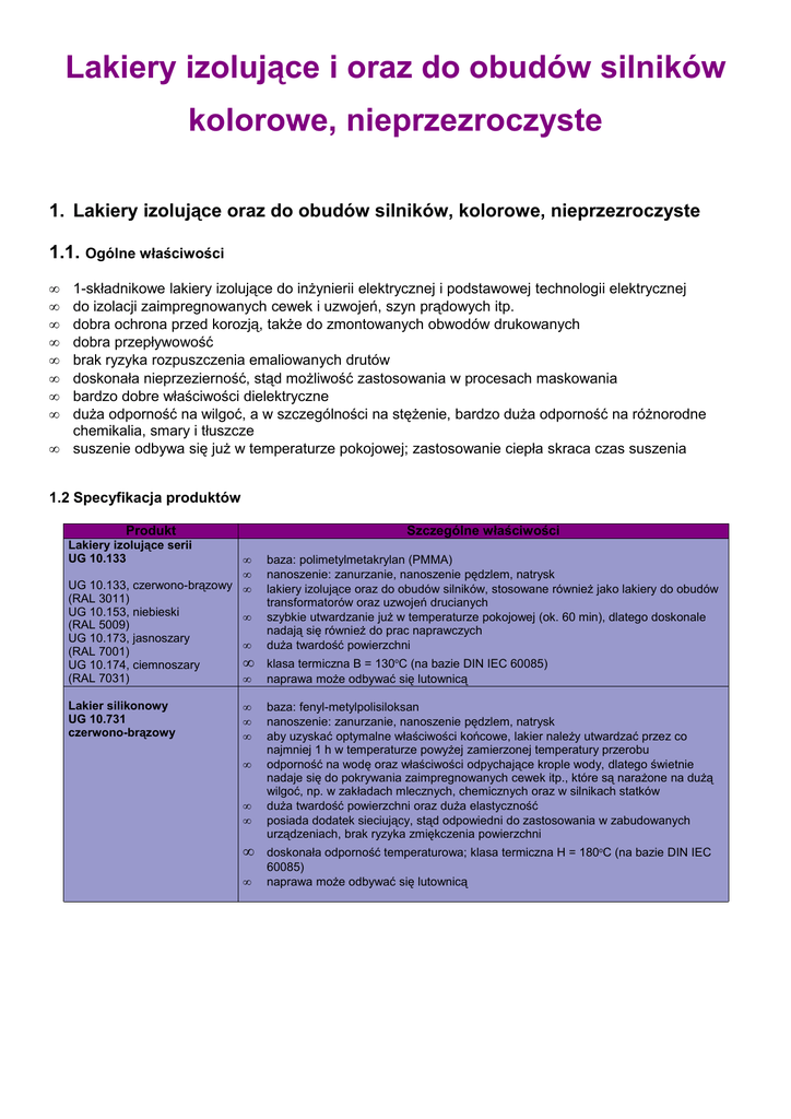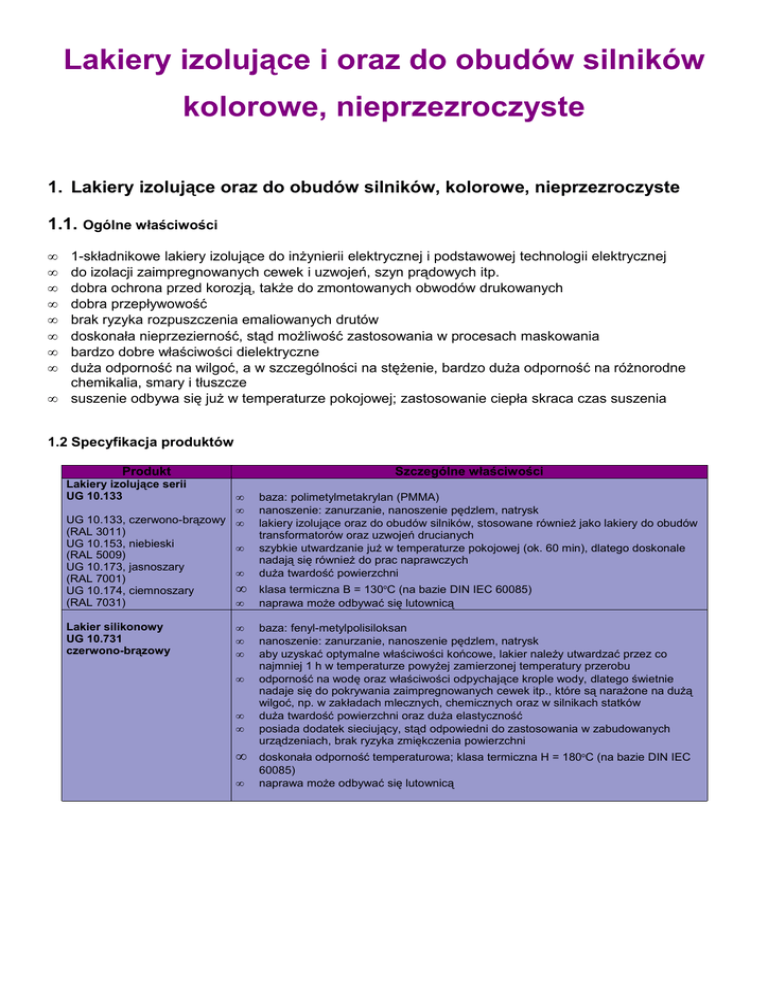 Lakiery izolujące i oraz do obudów silników kolorowe, nieprzezroczyste 1. Lakiery izolujące oraz do obudów silników, kolorowe, nieprzezroczyste 1.1. Ogólne właściwości • • • • • • • • • 1-składnikowe lakiery izolujące do inżynierii elektrycznej i podstawowej technologii elektrycznej do izolacji zaimpregnowanych cewek i uzwojeń, szyn prądowych itp. dobra ochrona przed korozją, także do zmontowanych obwodów drukowanych dobra przepływowość brak ryzyka rozpuszczenia emaliowanych drutów doskonała nieprzezierność, stąd możliwość zastosowania w procesach maskowania bardzo dobre właściwości dielektryczne duża odporność na wilgoć, a w szczególności na stężenie, bardzo duża odporność na różnorodne chemikalia, smary i tłuszcze suszenie odbywa się już w temperaturze pokojowej; zastosowanie ciepła skraca czas suszenia 1.2 Specyfikacja produktów Produkt Szczególne właściwości Lakiery izolujące serii UG 10.133 • • UG 10.133, czerwono-brązowy • (RAL 3011) UG 10.153, niebieski • (RAL 5009) UG 10.173, jasnoszary • (RAL 7001) • UG 10.174, ciemnoszary (RAL 7031) • Lakier silikonowy UG 10.731 czerwono-brązowy • • • • • • • • baza: polimetylmetakrylan (PMMA) nanoszenie: zanurzanie, nanoszenie pędzlem, natrysk lakiery izolujące oraz do obudów silników, stosowane również jako lakiery do obudów transformatorów oraz uzwojeń drucianych szybkie utwardzanie już w temperaturze pokojowej (ok. 60 min), dlatego doskonale nadają się również do prac naprawczych duża twardość powierzchni klasa termiczna B = 130oC (na bazie DIN IEC 60085) naprawa może odbywać się lutownicą baza: fenyl-metylpolisiloksan nanoszenie: zanurzanie, nanoszenie pędzlem, natrysk aby uzyskać optymalne właściwości końcowe, lakier należy utwardzać przez co najmniej 1 h w temperaturze powyżej zamierzonej temperatury przerobu odporność na wodę oraz właściwości odpychające krople wody, dlatego świetnie nadaje się do pokrywania zaimpregnowanych cewek itp., które są narażone na dużą wilgoć, np. w zakładach mlecznych, chemicznych oraz w silnikach statków duża twardość powierzchni oraz duża elastyczność posiada dodatek sieciujący, stąd odpowiedni do zastosowania w zabudowanych urządzeniach, brak ryzyka zmiękczenia powierzchni doskonała odporność temperaturowa; klasa termiczna H = 180oC (na bazie DIN IEC 60085) naprawa może odbywać się lutownicą