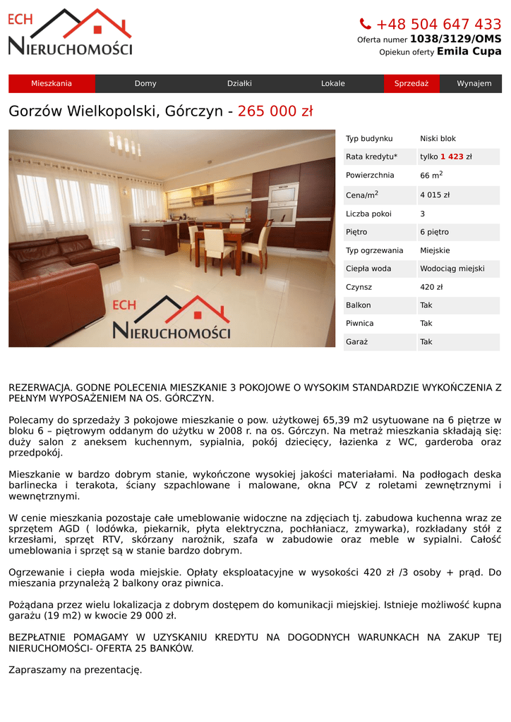 +48504647433 Ofertanumer1038/3129/OMS OpiekunofertyEmilaCupa Mieszkania Domy Działki Lokale Sprzedaż Wynajem GorzówWielkopolski,Górczyn-265000zł Typbudynku Niskiblok Ratakredytu* tylko1423zł Powierzchnia 66m2 Cena/m2 4015zł Liczbapokoi 3 Piętro 6piętro Typogrzewania Miejskie Ciepławoda Wodociągmiejski Czynsz 420zł Balkon Tak Piwnica Tak Garaż Tak REZERWACJA.GODNEPOLECENIAMIESZKANIE3POKOJOWEOWYSOKIMSTANDARDZIEWYKOŃCZENIAZ PEŁNYMWYPOSAŻENIEMNAOS.GÓRCZYN. Polecamydosprzedaży3pokojowemieszkanieopow.użytkowej65,39m2usytuowanena6piętrzew bloku6–piętrowymoddanymdoużytkuw2008r.naos.Górczyn.Nametrażmieszkaniaskładająsię: duży salon z aneksem kuchennym, sypialnia, pokój dziecięcy, łazienka z WC, garderoba oraz przedpokój. Mieszkanie w bardzo dobrym stanie, wykończone wysokiej jakości materiałami. Na podłogach deska barlinecka i terakota, ściany szpachlowane i malowane, okna PCV z roletami zewnętrznymi i wewnętrznymi. Wceniemieszkaniapozostajecałeumeblowaniewidocznenazdjęciachtj.zabudowakuchennawrazze sprzętem AGD ( lodówka, piekarnik, płyta elektryczna, pochłaniacz, zmywarka), rozkładany stół z krzesłami, sprzęt RTV, skórzany narożnik, szafa w zabudowie oraz meble w sypialni. Całość umeblowaniaisprzętsąwstaniebardzodobrym. Ogrzewanie i ciepła woda miejskie. Opłaty eksploatacyjne w wysokości 420 zł /3 osoby + prąd. Do mieszaniaprzynależą2balkonyorazpiwnica. Pożądanaprzezwielulokalizacjazdobrymdostępemdokomunikacjimiejskiej.Istniejemożliwośćkupna garażu(19m2)wkwocie29000zł. BEZPŁATNIE POMAGAMY W UZYSKANIU KREDYTU NA DOGODNYCH WARUNKACH NA ZAKUP TEJ NIERUCHOMOŚCI-OFERTA25BANKÓW. Zapraszamynaprezentację. ul.MieszkaI-go2/3,66-400GorzówWlkp.,telefon:+48504647443,e-mail:[email protected]