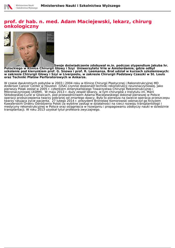 Ministerstwo Nauki i Szkolnictwa Wyższego prof. dr hab. n. med. Adam Maciejewski, lekarz, chirurg onkologiczny Swoje doświadczenie zdobywał m.in. podczas stypendium Jakuba hr. Potockiego w Klinice Chirurgii Głowy i Szyi Uniwersytetu Vrie w Amsterdamie, gdzie odbył szkolenie pod kierunkiem prof. G. Snowa i prof. R. Leemansa. Brał udział w kursach szkoleniowych: w zakresie Chirurgii Głowy i Szyi w Liverpoolu, w zakresie Chirurgii Podstawy Czaszki w St. Louis oraz Techniki Płatów Perforatorowych w Ankarze. W czasie dwukrotnych pobytów w 2003 i 2004 roku w Klinice Chirurgii Plastycznej i Rekonstrukcyjnej MD Anderson Cancer Center w Houston (USA) czynnie doskonalił techniki rekonstrukcji neuronaczyniowej. Jako pierwszy Polak został w 2005 r. członkiem Amerykańskiego Towarzystwa Chirurgii Rekonstrukcyjnej i Mikronaczyniowej (ASRM). W maju 2013 r. duży zespół lekarzy, w tym chirurgów z Instytutu im. Marii Skłodowskiej-Curie w Gliwicach, pod przewodnictwem Adama Maciejewskiego dokonał pierwszej w Polsce operacji przeszczepienia twarzy pobranej od zmarłego dawcy. Była to pierwsza na świecie operacja przeszczepu twarzy ratująca życie pacjenta. 27 lutego 2014 r. prezydent Bronisław Komorowski odznaczył go Krzyżem Kawalerskim Orderu Odrodzenia Polski za wybitne zasługi w działalności na rzecz rozwoju transplantologii i medycyny rekonstrukcyjnej w Polsce oraz osiągnięcia w rozwijaniu i propagowaniu zdobyczy nauki w dziedzinie transplantacji. W roku 2013 uzyskał tytuł profesora zwyczajnego. Powered by TCPDF (www.tcpdf.org)