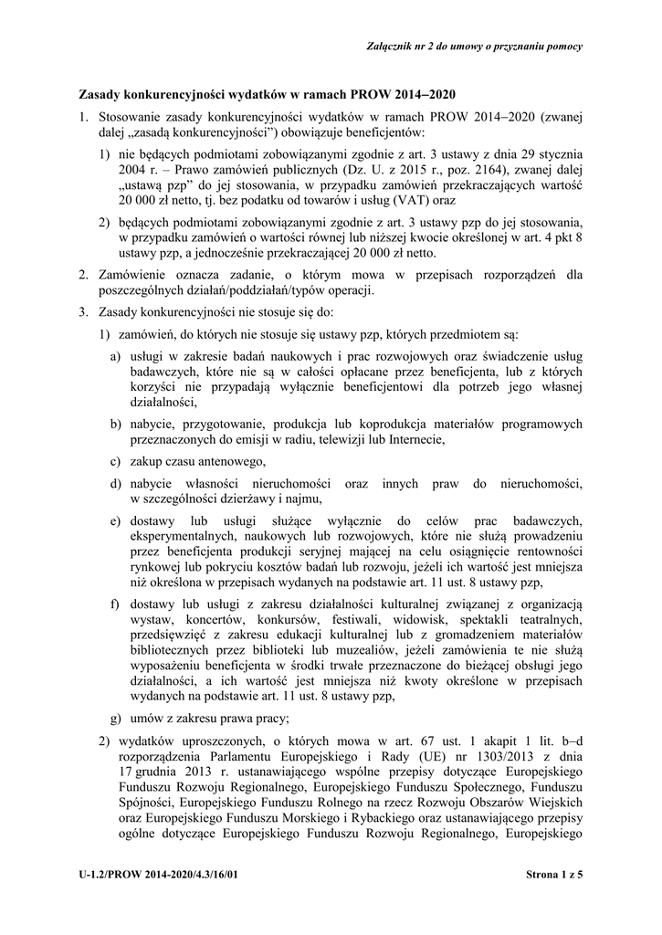 Załącznik nr 2 do umowy o przyznaniu pomocy Zasady konkurencyjności wydatków w ramach PROW 20142020 1. Stosowanie zasady konkurencyjności wydatków w ramach PROW 20142020 (zwanej dalej „zasadą konkurencyjności”) obowiązuje beneficjentów: 1) nie będących podmiotami zobowiązanymi zgodnie z art. 3 ustawy z dnia 29 stycznia 2004 r. – Prawo zamówień publicznych (Dz. U. z 2015 r., poz. 2164), zwanej dalej „ustawą pzp” do jej stosowania, w przypadku zamówień przekraczających wartość 20 000 zł netto, tj. bez podatku od towarów i usług (VAT) oraz 2) będących podmiotami zobowiązanymi zgodnie z art. 3 ustawy pzp do jej stosowania, w przypadku zamówień o wartości równej lub niższej kwocie określonej w art. 4 pkt 8 ustawy pzp, a jednocześnie przekraczającej 20 000 zł netto. 2. Zamówienie oznacza zadanie, o którym mowa w przepisach rozporządzeń dla poszczególnych działań/poddziałań/typów operacji. 3. Zasady konkurencyjności nie stosuje się do: 1) zamówień, do których nie stosuje się ustawy pzp, których przedmiotem są: a) usługi w zakresie badań naukowych i prac rozwojowych oraz świadczenie usług badawczych, które nie są w całości opłacane przez beneficjenta, lub z których korzyści nie przypadają wyłącznie beneficjentowi dla potrzeb jego własnej działalności, b) nabycie, przygotowanie, produkcja lub koprodukcja materiałów programowych przeznaczonych do emisji w radiu, telewizji lub Internecie, c) zakup czasu antenowego, d) nabycie własności nieruchomości w szczególności dzierżawy i najmu, oraz innych praw do nieruchomości, e) dostawy lub usługi służące wyłącznie do celów prac badawczych, eksperymentalnych, naukowych lub rozwojowych, które nie służą prowadzeniu przez beneficjenta produkcji seryjnej mającej na celu osiągnięcie rentowności rynkowej lub pokryciu kosztów badań lub rozwoju, jeżeli ich wartość jest mniejsza niż określona w przepisach wydanych na podstawie art. 11 ust. 8 ustawy pzp, f) dostawy lub usługi z zakresu działalności kulturalnej związanej z organizacją wystaw, koncertów, konkursów, festiwali, widowisk, spektakli teatralnych, przedsięwzięć z zakresu edukacji kulturalnej lub z gromadzeniem materiałów bibliotecznych przez biblioteki lub muzealiów, jeżeli zamówienia te nie służą wyposażeniu beneficjenta w środki trwałe przeznaczone do bieżącej obsługi jego działalności, a ich wartość jest mniejsza niż kwoty określone w przepisach wydanych na podstawie art. 11 ust. 8 ustawy pzp, g) umów z zakresu prawa pracy; 2) wydatków uproszczonych, o których mowa w art. 67 ust. 1 akapit 1 lit. bd rozporządzenia Parlamentu Europejskiego i Rady (UE) nr 1303/2013 z dnia 17 grudnia 2013 r. ustanawiającego wspólne przepisy dotyczące Europejskiego Funduszu Rozwoju Regionalnego, Europejskiego Funduszu Społecznego, Funduszu Spójności, Europejskiego Funduszu Rolnego na rzecz Rozwoju Obszarów Wiejskich oraz Europejskiego Funduszu Morskiego i Rybackiego oraz ustanawiającego przepisy ogólne dotyczące Europejskiego Funduszu Rozwoju Regionalnego, Europejskiego U-1.2/PROW 2014-2020/4.3/16/01 Strona 1 z 5 Załącznik nr 2 do umowy o przyznaniu pomocy Funduszu Społecznego, Funduszu Spójności i Europejskiego Funduszu Morskiego i Rybackiego oraz uchylającego rozporządzenie Rady (WE) nr 1083/2006 (Dz. Urz. UE L 347 z 20.12.2013, str. 320); 3) wydatków ponoszonych w ramach tzw. projektów grantowych, o których mowa w przepisach o rozwoju lokalnym z udziałem lokalnej społeczności; 4. Wartość zamówienia ustala się z należytą starannością, biorąc pod uwagę łączne spełnienie następujących kryteriów: a) sumowaniu podlegają usługi, dostawy i roboty budowlane tego samego rodzaju i o tym samym przeznaczeniu; b) możliwe jest udzielenie zamówienia w tym samym czasie; c) możliwe jest wykonanie zamówienia przez jednego wykonawcę dostaw, usług lub robót budowlanych (zwanego dalej „wykonawcą”). 5. W celu spełnienia zasady konkurencyjności należy: 1) upublicznić zapytanie ofertowe zgodnie z warunkami, o których mowa w ust. 8, przy czym zapytanie ofertowe zawiera co najmniej: a) opis przedmiotu zamówienia, – jednoznaczny i wyczerpujący, za pomocą dostatecznie dokładnych i zrozumiałych określeń, uwzględniający wszystkie wymagania i okoliczności mogące mieć wpływ na sporządzenie oferty, – który nie powinien odnosić się do określonego wyrobu lub źródła, szczególnych sposobów postępowania lub znaków towarowych, patentów, rodzajów lub specyficznego pochodzenia, chyba że takie odniesienie jest uzasadnione przedmiotem zamówienia i został określony zakres równoważności, b) warunki udziału w postępowaniu, c) kryteria oceny oferty oraz informację o wagach punktowych lub procentowych przypisanych do poszczególnych kryteriów oceny oferty, d) opis sposobu przyznawania punktacji za spełnienie danego kryterium oceny oferty, e) termin składania ofert, przy czym termin na złożenie oferty powinien wynosić nie mniej niż 7 dni kalendarzowych w przypadku dostaw i usług, a 14 dni kalendarzowych w przypadku robót budowlanych od dnia upublicznienia zapytania ofertowego, f) warunki wykluczenia, o którym mowa w ust. 6, g) termin realizacji zamówienia; 2) wybrać najkorzystniejszą spośród wszystkich złożonych ofert1 w oparciu o ustalone w zapytaniu ofertowym kryteria oceny. 6. Zamówienia udzielane przez beneficjenta nie mogą być udzielane podmiotom powiązanym z nim osobowo lub kapitałowo. Przez powiązania kapitałowe lub osobowe rozumie się wzajemne powiązania między beneficjentem lub osobami upoważnionymi do zaciągania zobowiązań w imieniu beneficjenta lub osobami wykonującymi w imieniu beneficjenta czynności związane z przygotowaniem i przeprowadzeniem procedury wyboru wykonawcy, a wykonawcą, polegające w szczególności na: 1 W przypadku gdy beneficjent dopuszcza składanie ofert częściow
