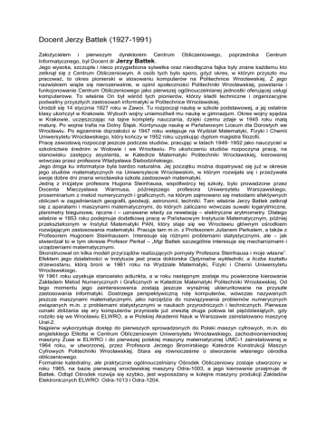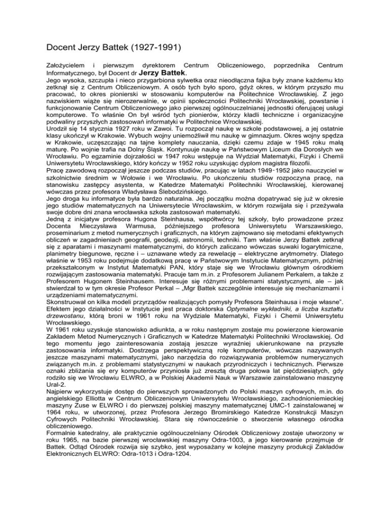 Docent Jerzy Battek (1927-1991) Założycielem i pierwszym dyrektorem Centrum Obliczeniowego, poprzednika Centrum Informatycznego, był Docent dr Jerzy Battek. Jego wysoka, szczupła i nieco przygarbiona sylwetka oraz nieodłączna fajka były znane każdemu kto zetknął się z Centrum Obliczeniowym. A osób tych było sporo, gdyż okres, w którym przyszło mu pracować, to okres pionierski w stosowaniu komputerów na Politechnice Wrocławskiej. Z jego nazwiskiem wiąże się nierozerwalnie, w opinii społeczności Politechniki Wrocławskiej, powstanie i funkcjonowanie Centrum Obliczeniowego jako pierwszej ogólnouczelnianej jednostki oferującej usługi komputerowe. To właśnie On był wśród tych pionierów, którzy kładli techniczne i organizacyjne podwaliny przyszłych zastosowań informatyki w Politechnice Wrocławskiej. Urodził się 14 stycznia 1927 roku w Zawoi. Tu rozpoczął naukę w szkole podstawowej, a jej ostatnie klasy ukończył w Krakowie. Wybuch wojny uniemożliwił mu naukę w gimnazjum. Okres wojny spędza w Krakowie, uczęszczając na tajne komplety nauczania, dzięki czemu zdaje w 1945 roku małą maturę. Po wojnie trafia na Dolny Śląsk. Kontynuuje naukę w Państwowym Liceum dla Dorosłych we Wrocławiu. Po egzaminie dojrzałości w 1947 roku wstępuje na Wydział Matematyki, Fizyki i Chemii Uniwersytetu Wrocławskiego, który kończy w 1952 roku uzyskując dyplom magistra filozofii. Pracę zawodową rozpoczął jeszcze podczas studiów, pracując w latach 1949‑1952 jako nauczyciel w szkolnictwie średnim w Wołowie i we Wrocławiu. Po ukończeniu studiów rozpoczyna pracę, na stanowisku zastępcy asystenta, w Katedrze Matematyki Politechniki Wrocławskiej, kierowanej wówczas przez profesora Władysława Ślebodzińskiego. Jego droga ku informatyce była bardzo naturalna. Jej początku można dopatrywać się już w okresie jego studiów matematycznych na Uniwersytecie Wrocławskim, w którym rozwijała się i przeżywała swoje dobre dni znana wrocławska szkoła zastosowań matematyki. Jedną z inicjatyw profesora Hugona Steinhausa, współtwórcy tej szkoły, było prowadzone przez Docenta Mieczysława Warmusa, późniejszego profesora Uniwersytetu Warszawskiego, proseminarium z metod numerycznych i graficznych, na którym zajmowano się metodami efektywnych obliczeń w zagadnieniach geografii, geodezji, astronomii, techniki. Tam właśnie Jerzy Battek zetknął się z aparatami i maszynami matematycznymi, do których zaliczano wówczas suwaki logarytmiczne, planimetry biegunowe, ręczne i – uznawane wtedy za rewelację – elektryczne arytmometry. Dlatego właśnie w 1953 roku podejmuje dodatkową pracę w Państwowym Instytucie Matematycznym, później przekształconym w Instytut Matematyki PAN, który staje się we Wrocławiu głównym ośrodkiem rozwijającym zastosowania matematyki. Pracuje tam m.in. z Profesorem Julianem Perkalem, a także z Profesorem Hugonem Steinhausem. Interesuje się różnymi problemami statystycznymi, ale – jak stwierdzał to w tym okresie Profesor Perkal – „Mgr Battek szczególnie interesuje się mechanizmami i urządzeniami matematycznymi. Skonstruował on kilka modeli przyrządów realizujących pomysły Profesora Steinhausa i moje własne”. Efektem jego działalności w Instytucie jest praca doktorska Optymalne wykładniki, a liczba kształtu drzewostanu, którą broni w 1961 roku na Wydziale Matematyki, Fizyki i Chemii Uniwersytetu Wrocławskiego. W 1961 roku uzyskuje stanowisko adiunkta, a w roku następnym zostaje mu powierzone kierowanie Zakładem Metod Numerycznych i Graficznych w Katedrze Matematyki Politechniki Wrocławskiej. Od tego momentu jego zainteresowania zostają jeszcze wyraźniej ukierunkowane na przyszłe zastosowania informatyki. Dostrzega perspektywiczną rolę komputerów, wówczas nazywanych jeszcze maszynami matematycznymi, jako narzędzia do rozwiązywania problemów numerycznych związanych m.in. z problemami statystycznymi w naukach przyrodniczych i technicznych. Pierwsze oznaki zbliżania się ery komputerów przyniosła już zresztą druga połowa lat pięćdziesiątych, gdy rodziło się we Wrocławiu ELWRO, a w Polskiej Akademii Nauk w Warszawie zainstalowano maszynę Ural-2. Najpierw wykorzystuje dostęp do pierwszych sprowadzonych do Polski maszyn cyfrowych, m.in. do angielskiego Elliotta w Centrum Obliczeniowym Uniwersytetu Wrocławskiego, zachodnioniemieckiej maszyny Zuse w ELWRO i do pierwszej polskiej maszyny matematycznej UMC-1 zainstalowanej w 1964 roku, w utworzonej, przez Profesora Jerzego Bromirskiego Katedrze Konstrukcji Maszyn Cyfrowych Politechniki Wrocławskiej. Stara się równocześnie o stworzenie własnego ośrodka obliczeniowego. Formalnie katedralny, ale praktycznie ogólnouczelniany Ośrodek Obliczeniowy zostaje utworzony w roku 1965, na bazie pierwszej wrocławskiej maszyny Odra-1003, a jego kierowanie przejmuje dr Battek. Odtąd Ośrodek rozwija się szybko, jest wyposażany w kolejne maszyny produkcji Zakładów Elektronicznych ELWRO: Odra-1013 i Odra-1204. W 1968 roku zostaje mianowany docentem. Było to wyrazem uznania nie tylko jego talentów i zasług organizacyjnych oraz prowadzenia intensywnego szkolenia pracowników, ale także osiągnięć na polu zastosowań matematyki w problematyce wydobycia i transportu węgla brunatnego, które prowadził od początku lat 60. na zlecenie Dolnośląskiego Biura Projektów Górniczych. Wyniki, jakie uzyskał w tym zakresie zostały wyróżnione nagrodą Zjednoczenia Przemysłu Węgla Brunatnego już w 1964 roku. W 1968 roku wyjeżdża na dziewięciomiesięczny staż do ZSRR, a w 1970 roku odbywa czteromiesięczny staż ONZ w USA i Wielkiej Brytanii. W 1971 roku Ośrodek zostaje przekształcony w Centrum Obliczeniowe, jako samodzielną jednostkę organizacyjną. Docent Jerzy Battek pozostaje dyrektorem Centrum aż do 1983 roku, kiedy choroba zmusza Go do urlopu zdrowotnego. Pod Jego kierownictwem Centrum Oblic