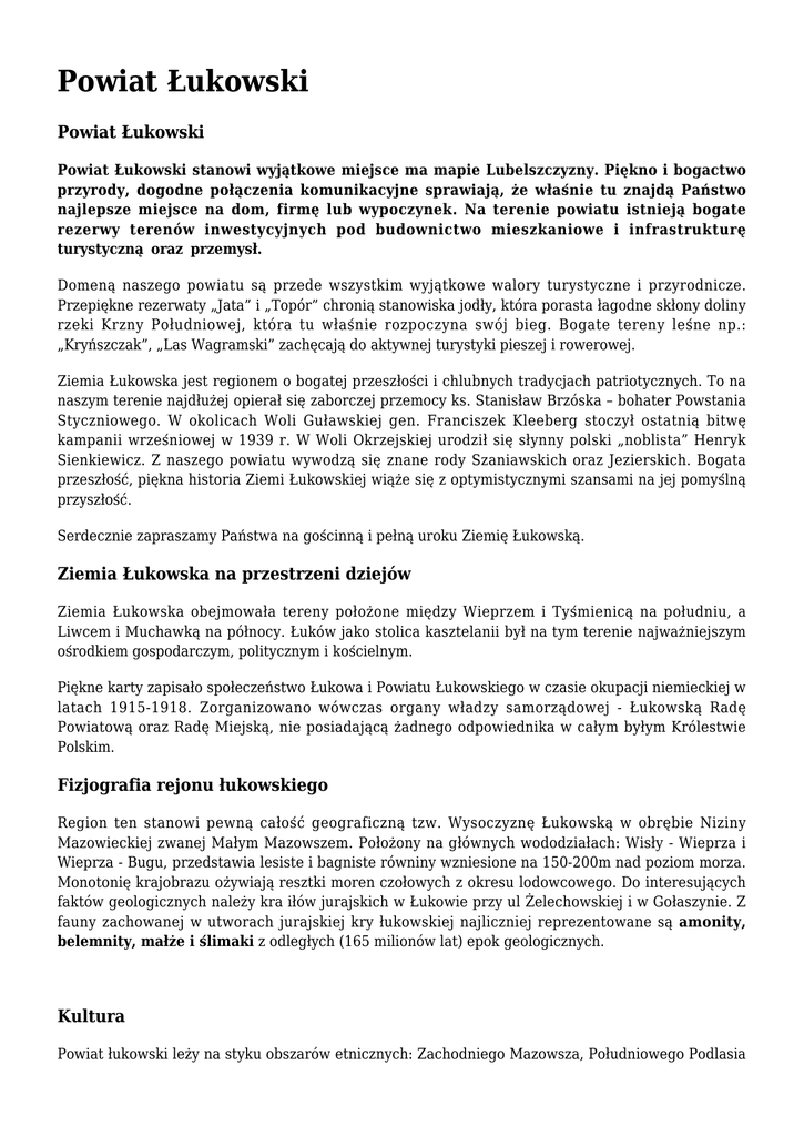 Powiat Łukowski Powiat Łukowski Powiat Łukowski stanowi wyjątkowe miejsce ma mapie Lubelszczyzny. Piękno i bogactwo przyrody, dogodne połączenia komunikacyjne sprawiają, że właśnie tu znajdą Państwo najlepsze miejsce na dom, firmę lub wypoczynek. Na terenie powiatu istnieją bogate rezerwy terenów inwestycyjnych pod budownictwo mieszkaniowe i infrastrukturę turystyczną oraz przemysł. Domeną naszego powiatu są przede wszystkim wyjątkowe walory turystyczne i przyrodnicze. Przepiękne rezerwaty „Jata” i „Topór” chronią stanowiska jodły, która porasta łagodne skłony doliny rzeki Krzny Południowej, która tu właśnie rozpoczyna swój bieg. Bogate tereny leśne np.: „Kryńszczak”, „Las Wagramski” zachęcają do aktywnej turystyki pieszej i rowerowej. Ziemia Łukowska jest regionem o bogatej przeszłości i chlubnych tradycjach patriotycznych. To na naszym terenie najdłużej opierał się zaborczej przemocy ks. Stanisław Brzóska – bohater Powstania Styczniowego. W okolicach Woli Guławskiej gen. Franciszek Kleeberg stoczył ostatnią bitwę kampanii wrześniowej w 1939 r. W Woli Okrzejskiej urodził się słynny polski „noblista” Henryk Sienkiewicz. Z naszego powiatu wywodzą się znane rody Szaniawskich oraz Jezierskich. Bogata przeszłość, piękna historia Ziemi Łukowskiej wiąże się z optymistycznymi szansami na jej pomyślną przyszłość. Serdecznie zapraszamy Państwa na gościnną i pełną uroku Ziemię Łukowską. Ziemia Łukowska na przestrzeni dziejów Ziemia Łukowska obejmowała tereny położone między Wieprzem i Tyśmienicą na południu, a Liwcem i Muchawką na północy. Łuków jako stolica kasztelanii był na tym terenie najważniejszym ośrodkiem gospodarczym, politycznym i kościelnym. Piękne karty zapisało społeczeństwo Łukowa i Powiatu Łukowskiego w czasie okupacji niemieckiej w latach 1915-1918. Zorganizowano wówczas organy władzy samorządowej - Łukowską Radę Powiatową oraz Radę Miejską, nie posiadającą żadnego odpowiednika w całym byłym Królestwie Polskim. Fizjografia rejonu łukowskiego Region ten stanowi pewną całość geograficzną tzw. Wysoczyznę Łukowską w obrębie Niziny Mazowieckiej zwanej Małym Mazowszem. Położony na głównych wododziałach: Wisły - Wieprza i Wieprza - Bugu, przedstawia lesiste i bagniste równiny wzniesione na 150-200m nad poziom morza. Monotonię krajobrazu ożywiają resztki moren czołowych z okresu lodowcowego. Do interesujących faktów geologicznych należy kra iłów jurajskich w Łukowie przy ul Żelechowskiej i w Gołaszynie. Z fauny zachowanej w utworach jurajskiej kry łukowskiej najliczniej reprezentowane są amonity, belemnity, małże i ślimaki z odległych (165 milionów lat) epok geologicznych. Kultura Powiat łukowski leży na styku obszarów etnicznych: Zachodniego Mazowsza, Południowego Podlasia i Lubelszczyzny, w kulturze ludowej powiatu - oprócz elementów własnych odnajdujemy elementy charakterystyczne dla regionów sąsiednich. Powodem do dumy mieszkańców Powiatu Łukowskiego jest Zespół Pieśni i Tańca Ziemi Łukowskiej "Łukowiacy". W repertuarze zespołu znajdują się polskie tańce narodowe: polonez, krakowiak i kujawiak z oberkiem oraz tańce lubelskie, suita tańców i przyśpiewek rzeszowskich, tańce i przyśpiewki podlaskie. Sport i turystyka Baza sportowo-rekreacyjna obejmuje wiele obiektów sportowych w tym : 3 stadiony, 107 boisk sportowych, 36 sal gimnastycznych, 2 pływalnie, 8 obiektów lekkoatletycznych oraz strzelnice, siłownie i tory jeździeckie. Turyści odwiedzający Powiat Łukowski mogą skorzystać z wielu noclegów w hotelach i szkolnych schroniskach. Z dużym powodzeniem funkcjonują gospodarstwa agroturystyczne.