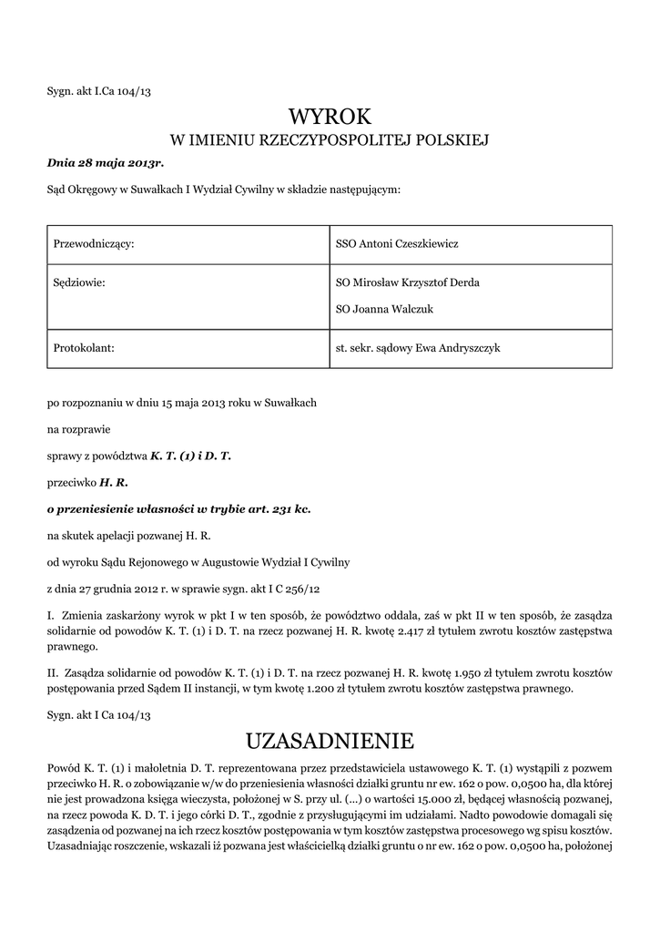 Sygn. akt I.Ca 104/13 WYROK W IMIENIU RZECZYPOSPOLITEJ POLSKIEJ Dnia 28 maja 2013r. Sąd Okręgowy w Suwałkach I Wydział Cywilny w składzie następującym: Przewodniczący: SSO Antoni Czeszkiewicz Sędziowie: SO Mirosław Krzysztof Derda SO Joanna Walczuk Protokolant: st. sekr. sądowy Ewa Andryszczyk po rozpoznaniu w dniu 15 maja 2013 roku w Suwałkach na rozprawie sprawy z powództwa K. T. (1) i D. T. przeciwko H. R. o przeniesienie własności w trybie art. 231 kc. na skutek apelacji pozwanej H. R. od wyroku Sądu Rejonowego w Augustowie Wydział I Cywilny z dnia 27 grudnia 2012 r. w sprawie sygn. akt I C 256/12 I. Zmienia zaskarżony wyrok w pkt I w ten sposób, że powództwo oddala, zaś w pkt II w ten sposób, że zasądza solidarnie od powodów K. T. (1) i D. T. na rzecz pozwanej H. R. kwotę 2.417 zł tytułem zwrotu kosztów zastępstwa prawnego. II. Zasądza solidarnie od powodów K. T. (1) i D. T. na rzecz pozwanej H. R. kwotę 1.950 zł tytułem zwrotu kosztów postępowania przed Sądem II instancji, w tym kwotę 1.200 zł tytułem zwrotu kosztów zastępstwa prawnego. Sygn. akt I Ca 104/13 UZASADNIENIE Powód K. T. (1) i małoletnia D. T. reprezentowana przez przedstawiciela ustawowego K. T. (1) wystąpili z pozwem przeciwko H. R. o zobowiązanie w/w do przeniesienia własności działki gruntu nr ew. 162 o pow. 0,0500 ha, dla której nie jest prowadzona księga wieczysta, położonej w S. przy ul. (...) o wartości 15.000 zł, będącej własnością pozwanej, na rzecz powoda K. D. T. i jego córki D. T., zgodnie z przysługującymi im udziałami. Nadto powodowie domagali się zasądzenia od pozwanej na ich rzecz kosztów postępowania w tym kosztów zastępstwa procesowego wg spisu kosztów. Uzasadniając roszczenie, wskazali iż pozwana jest właścicielką działki gruntu o nr ew. 162 o pow. 0,0500 ha, położonej w S.. Pozwana wyraziła zgodę, aby powód i jego żona K. T. (2), będąca córką pozwanej wznieśli na w/w działce budynek mieszkalny. Powód będąc samoistnym posiadaczem przedmiotowej działki w dobrej wierze wybudował na niej dom jednorodzinny, którego wartość znacznie przekroczyła wartość zajętego pod budowę gruntu. W toku postępowania pełnomocnik powodów w piśmie procesowym podniósł, iż powód oraz jego żona otrzymali sporną działkę od pozwanej w drodze nieformalnej darowizny na początku czerwca 2011 r., w związku z tym objęli przedmiotową działkę w posiadanie i wznieśli na niej jednorodzinny budynek mieszkalny. Od początku budowy, a także wcześniej przekazywali pozwanej pieniądze na opłacanie wszelkich należności z tytułu posiadania nieruchomości. Pozwana H. R. wniosła o oddalenie powództwa w całości. Domagała się także zasądzenia na swoją rzecz kosztów postępowania. Uzasadniając swoje stanowisko wskazała, iż powód posiadał wiedzę, że nie jest właścicielem gruntu, na którym został wzniesiony budynek mieszkalny. Był on świadomy, że wznosi budynek na cudzym gruncie. Mając wiedzę o rzeczywistym stanie prawnym gruntu zwrócił się do właściciela (pozwanej) o wyrażenie zgody na budowę na jej działce domu jednorodzinnego, a zatem w ocenie pozwanej nie miał woli władania nieruchomością jak dla siebie. Nadto pozwana wywiodła, iż pomiędzy powodem, jego zmarłą żoną, a pozwaną nigdy nie było ustaleń odnośnie formy władania nieruchomością przez powoda. Podała, iż nigdy nie wskazywała, że przekaże nieruchomość powodowi i jego żonie na własność. Ostatecznie wskazywała także, ze wszystkie środki na budowę domu pochodziły z jej oszczędności. Sąd Rejonowy w Augustowie wyrokiem z dnia 27 grudnia 2012 r. wydanym w sprawie sygn. akt I C 256/12 zobowiązał pozwaną H. R. do złożenia następującego oświadczenia woli: „Ja H. R. przenoszę własność działki gruntu o numerze ewidencyjnym (...) o pow. 0,05 ha położonej w S. przy ulicy (...), dla której nie ma urządzonej księgi wieczystej, na współwłasność K. T. (1) w udziale ¾ oraz jego córki D. T. w udziale ¼ za zapłatą wynagrodzenia w kwocie 15.000 zł (piętnaście tysięcy złotych)”. Zasądził od pozwanej H. R. na rzecz powoda K. T. (1) kwotę 3.167 zł tytułem zwrotu kosztów postępowania, w tym kwotę 2.417 zł tytułem zwrotu kosztów zastępstwa procesowego. Sąd Rejonowy ustalił, że w dniu 28.05.2011 r. H. R. złożyła pisemne oświadczenie o nazwie „uzgodnienie”, z którego treści wynikało, iż wyraża zgodę K. i K. D. T., aby wybudowali na jej działce o nr geodezyjnym 162 budynek mieszkalny jednorodzinny.Z wypisu z rejestru gruntów wynika, iż działka nr (...), położona w m. S. stanowi własność H. R.. Decyzją nr 199/11 z dnia 04.07.2011 r. Starosta (...) zatwierdził projekt budowlany i udzielił pozwolenia K. i K. T. (1) na budowę budynku mieszkalnego jednorodzinnego na działce nr ewid. 162, położonej w S. przy ul. (...). Postanowieniem z dnia 15.02.2012 r. Sąd Rejonowy w Augustowie w sprawie sygn. I Ns 26/12 stwierdził, że spadek po K. B. zm. dnia 21.10.2011 r. na podstawie ustawy z dobrodziejstwem inwentarza nabyli: mąż K. T. (1) i córka D. T. po ½ części każde z nich. Z zeznań S. R. (1) wynika, iż pomagał powodowi budować dom w S.. Rozmawiał z powodem na temat budowy domu. Powód mówił jaki ma być dom i z czego ma być wykonany. Świadek nie posiadał wiedzy czyją własnością była działka, sądził, że jest to działka tego, kto się buduje. Z pozwaną ustalał skąd wziąć materiały, natomiast o podstawowych rzeczach odnośnie budowy informował go powód. Miał z nim kontakt telefoniczny, gdyż był on za granicą. Powód przywiózł pieniądze na materiały. Powód dał świadkowi 7.000 zł zaliczki na pracowników, na żwir. Powód informował go, że przygotował teściowej kwotę dwadzieścia ileś tysięcy, by zanieść na skład budowlany, by było to na materiały budowlane. Świadek widział te pieniądze, gdyż p