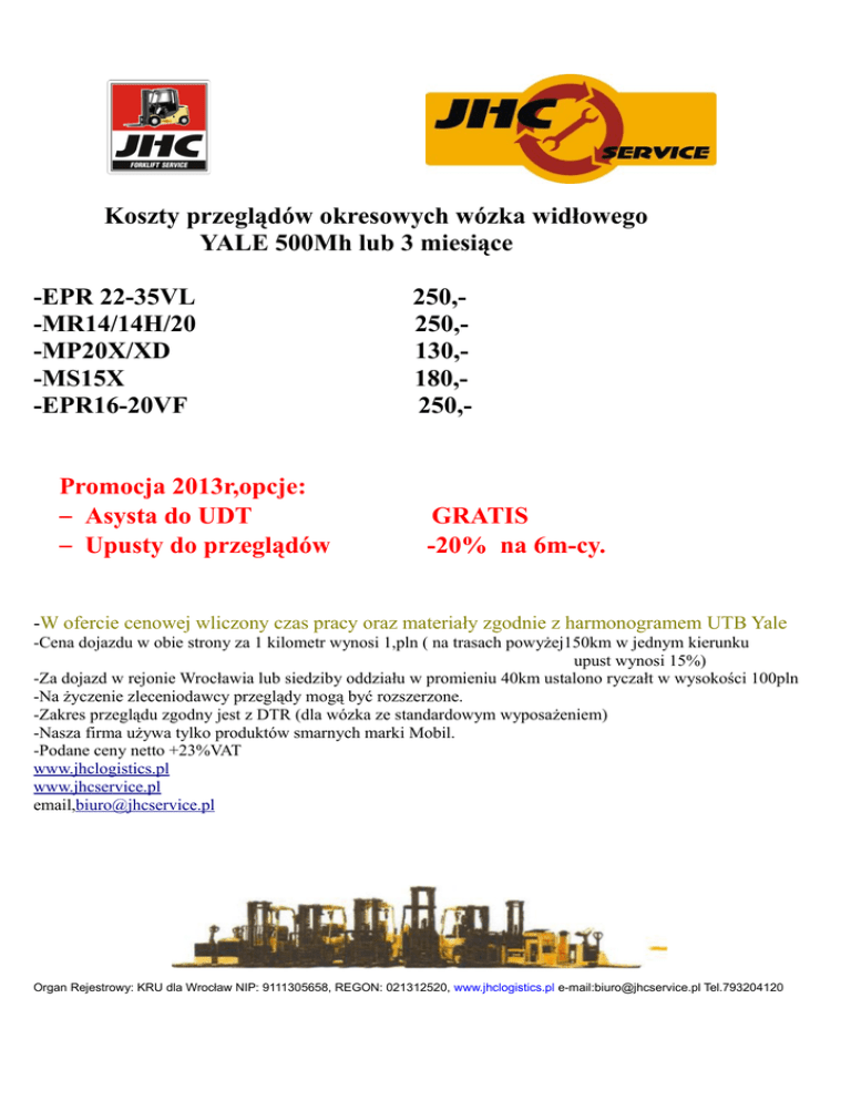 Koszty przeglądów okresowych wózka widłowego YALE 500Mh lub 3 miesiące -EPR 22-35VL -MR14/14H/20 -MP20X/XD -MS15X -EPR16-20VF Promocja 2013r,opcje: – Asysta do UDT – Upusty do przeglądów 250,250,130,180,250,- GRATIS -20% na 6m-cy. -W ofercie cenowej wliczony czas pracy oraz materiały zgodnie z harmonogramem UTB Yale -Cena dojazdu w obie strony za 1 kilometr wynosi 1,pln ( na trasach powyżej150km w jednym kierunku upust wynosi 15%) -Za dojazd w rejonie Wrocławia lub siedziby oddziału w promieniu 40km ustalono ryczałt w wysokości 100pln -Na życzenie zleceniodawcy przeglądy mogą być rozszerzone. -Zakres przeglądu zgodny jest z DTR (dla wózka ze standardowym wyposażeniem) -Nasza firma używa tylko produktów smarnych marki Mobil. -Podane ceny netto +23%VAT www.jhclogistics.pl www.jhcservice.pl email,[email protected] Organ Rejestrowy: KRU dla Wrocław NIP: 9111305658, REGON: 021312520, www.jhclogistics.pl e-mail:[email protected] Tel.793204120