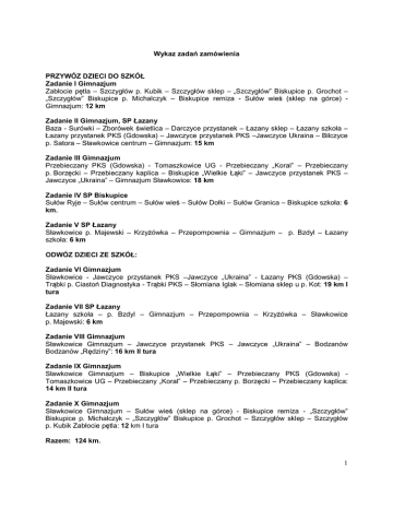 Wykaz zadań zamówienia PRZYWÓZ DZIECI DO SZKÓŁ Zadanie I Gimnazjum Zabłocie pętla – Szczygłów p. Kubik – Szczygłów sklep – „Szczygłów” Biskupice p. Grochot – „Szczygłów” Biskupice p. Michalczyk – Biskupice remiza - Sułów wieś (sklep na górce) Gimnazjum: 12 km Zadanie II Gimnazjum, SP Łazany Baza - Surówki – Zborówek świetlica – Darczyce przystanek – Łazany sklep – Łazany szkoła – Łazany przystanek PKS (Gdowska) – Jawczyce przystanek PKS –Jawczyce Ukraina – Bilczyce p. Satora – Sławkowice centrum – Gimnazjum: 15 km Zadanie III Gimnazjum Przebieczany PKS (Gdowska) - Tomaszkowice UG - Przebieczany „Koral” – Przebieczany p. Borzęcki – Przebieczany kaplica – Biskupice „Wielkie Łąki” – Jawczyce przystanek PKS – Jawczyce „Ukraina” – Gimnazjum Sławkowice: 18 km Zadanie IV SP Biskupice Sułów Ryje – Sułów centrum – Sułów wieś – Sułów Dołki – Sułów Granica – Biskupice szkoła: 6 km. Zadanie V SP Łazany Sławkowice p. Majewski – Krzyżówka – Przepompownia – Gimnazjum – p. Bzdyl – Łazany szkoła: 6 km ODWÓZ DZIECI ZE SZKÓŁ: Zadanie VI Gimnazjum Sławkowice - Jawczyce przystanek PKS –Jawczyce „Ukraina” - Łazany PKS (Gdowska) – Trąbki p. Ciastoń Diagnostyka - Trąbki PKS – Słomiana Iglak – Słomiana sklep u p. Kot: 19 km I tura Zadanie VII SP Łazany Łazany szkoła – p. Bzdyl – Gimnazjum – Przepompownia – Krzyżówka – Sławkowice p. Majewski: 6 km Zadanie VIII Gimnazjum Sławkowice Gimnazjum – Jawczyce przystanek PKS – Jawczyce „Ukraina” – Bodzanów Bodzanów „Rędziny”: 16 km II tura Zadanie IX Gimnazjum Sławkowice Gimnazjum – Biskupice „Wielkie Łąki” – Przebieczany PKS (Gdowska) Tomaszkowice UG – Przebieczany „Koral” – Przebieczany p. Borzęcki – Przebieczany kaplica: 14 km II tura Zadanie X Gimnazjum Sławkowice Gimnazjum – Sułów wieś (sklep na górce) - Biskupice remiza - „Szczygłów” Biskupice p. Michalczyk – „Szczygłów” Biskupice p. Grochot – Szczygłów sklep – Szczygłów p. Kubik Zabłocie pętla: 12 km I tura Razem: 124 km. 1 UWAGI: 1. W ciągu okresu realizacji usługi może nastąpić nieznaczna zmiana ilości dowożonych uczniów w stosunku do określonej w niniejszej specyfikacji z różnych powodów, których Zamawiający nie był w stanie przewidzieć w chwili sporządzania SIWZ. 2. Przebieg tras i ich długość mogą być modyfikowane w zależności od szczególnych potrzeb Zamawiającego wynikłych z przyczyn organizacyjnych, których nie można było przewidzieć w chwili sporządzania specyfikacji, jak np.: zmiany w planach lekcji, konieczność zorganizowania dodatkowych przejazdów wynikających z uczestnictwa uczniów w zajęciach nadobowiązkowych, zawodach sportowych, wycieczkach tematycznych lub imprezach okolicznościowych, itp. 3. Obowiązkiem Wykonawcy jest wcześniejsze zapoznanie się z warunkami drogowymi panującymi na terenie Gminy Biskupice. 4. Zadaniem Wykonawcy jest bezwzględne zapewnienie ciągłości usługi, tak więc: a) w przypadku wystąpienia okoliczności uniemożliwiających Wykonawcy realizację usługi jest on zobowiązany na własny koszt i ryzyko zapewnić zastępcze wykonanie usługi przez innego koncesjonowanego przewoźnika, który spełni podstawowe wymagania stawiane Wykonawcy; b) jeżeli Wykonawca nie dopełni obowiązków wskazanych w pkt a, Zamawiający zleci zastępcze wykonanie usługi innemu przewoźnikowi, a koszty tej usługi zostaną potrącone z wynagrodzenia wykonawcy ujętego w najbliższej fakturze; 5. Zadaniem po stronie Wykonawcy pozostaje zapewnienie opieki nad przewożonymi uczniami w czasie transportu (opieki nie może sprawować równocześnie kierowca). 2