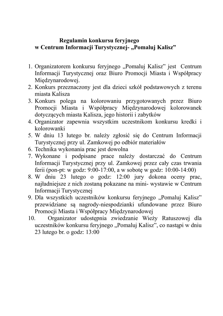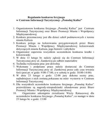 Regulamin konkursu feryjnego w Centrum Informacji Turystycznej- „Pomaluj Kalisz” 1. Organizatorem konkursu feryjnego „Pomaluj Kalisz” jest Centrum Informacji Turystycznej oraz Biuro Promocji Miasta i Współpracy Międzynarodowej. 2. Konkurs przeznaczony jest dla dzieci szkół podstawowych z terenu miasta Kalisza 3. Konkurs polega na kolorowaniu przygotowanych przez Biuro Promocji Miasta i Współpracy Międzynarodowej kolorowanek dotyczących miasta Kalisza, jego historii i zabytków 4. Organizator zapewnia wszystkim uczestnikom konkursu kredki i kolorowanki 5. W dniu 13 lutego br. należy zgłosić się do Centrum Informacji Turystycznej przy ul. Zamkowej po odbiór materiałów 6. Technika wykonania prac jest dowolna 7. Wykonane i podpisane prace należy dostarczać do Centrum Informacji Turystycznej przy ul. Zamkowej przez cały czas trwania ferii (pon-pt: w godz: 9:00-17:00, a w sobotę w godz: 10:00-14:00) 8. W dniu 23 lutego o godz: 12:00 jury dokona oceny prac, najładniejsze z nich zostaną pokazane na mini- wystawie w Centrum Informacji Turystycznej 9. Dla wszystkich uczestników konkursu feryjnego „Pomaluj Kalisz” przewidziane są nagrody-niespodzianki ufundowane przez Biuro Promocji Miasta i Współpracy Międzynarodowej 10. Organizator udostępnia zwiedzanie Wieży Ratuszowej dla uczestników konkursu feryjnego „Pomaluj Kalisz”, co nastąpi w dniu 23 lutego br. o godz: 13:00
