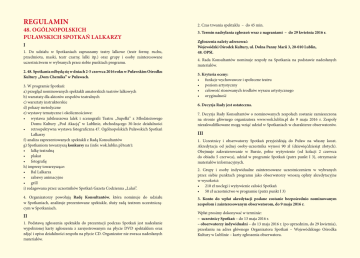 REGULAMIN 48. OGÓLNOPOLSKICH PUŁAWSKICH SPOTKAŃ LALKARZY I 1. Do udziału w Spotkaniach zapraszamy teatry lalkowe (teatr formy, ruchu, przedmiotu, maski, teatr czarny, lalki itp.) oraz grupy i osoby zainteresowane uczestnictwem w wybranych przez siebie punktach programu. 2. 48. Spotkania odbędą się w dniach 2-5 czerwca 2016 roku w Puławskim Ośrodku Kultury „Dom Chemika” w Puławach. 3. W programie Spotkań: a) przegląd nominowanych spektakli amatorskich teatrów lalkowych b) warsztaty dla aktorów zespołów teatralnych c) warsztaty instruktorskie d) pokazy metodyczne e) wystawy tematyczne i okolicznościowe: • wystawa jubileuszowa lalek i scenografii Teatru „Supełki” z Młodzieżowego Domu Kultury „Pod Akacją” w Lublinie, obchodzącego 30-lecie działalności • retrospektywna wystawa fotograficzna 47. Ogólnopolskich Puławskich Spotkań Lalkarzy f) analiza zaprezentowanych spektakli z Radą Konsultantów g) Spotkaniom towarzyszą konkursy na (info: wok.lublin.pl/teatr): • lalkę teatralną • plakat • fotografię h) imprezy towarzyszące: • Bal Lalkarza • zabawy animacyjne • grill i) redagowana przez uczestników Spotkań Gazeta Codzienna „Laluś”. 4. Organizatorzy powołują Radę Konsultantów, która nominuje do udziału w Spotkaniach, analizuje prezentowane spektakle, służy radą teatrom uczestniczącym w Spotkaniach. II 1. Podstawą zgłoszenia spektaklu do prezentacji podczas Spotkań jest nadesłanie wypełnionej karty zgłoszenia z zarejestrowanym na płycie DVD spektaklem oraz zdjęć i opisu działalności zespołu na płycie CD. Organizator nie zwraca nadesłanych materiałów. 2. Czas trwania spektaklu – do 45 min. 3. Termin nadsyłania zgłoszeń wraz z nagraniami – do 29 kwietnia 2016 r. Zgłoszenia należy adresować: Wojewódzki Ośrodek Kultury, ul. Dolna Panny Marii 3, 20-010 Lublin, 48. OPSL 4. Rada Konsultantów nominuje zespoły na Spotkania na podstawie nadesłanych materiałów. 5. Kryteria oceny: • funkcje wychowawcze i społeczne teatru • poziom artystyczny • celowość stosowanych środków wyrazu artystycznego • oryginalność 6. Decyzja Rady jest ostateczna. 7. Decyzja Rady Konsultantów o nominowanych zespołach zostanie zamieszczona na stronie głównego organizatora www.wok.lublin.pl do 9 maja 2016 r. Zespoły niezakwalifikowane mogą wziąć udział w Spotkaniach w charakterze obserwatorów. III 1. Uczestnicy i obserwatorzy Spotkań przyjeżdżają do Puław na własny koszt. Akredytacja od jednej osoby-uczestnika wynosi 90 zł (dziewięćdziesiąt złotych). Obejmuje zakwaterowanie w Bursie, pełne wyżywienie (od kolacji 2 czerwca do obiadu 5 czerwca), udział w programie Spotkań (patrz punkt I 3), otrzymanie materiałów informacyjnych. 2. Grupy i osoby indywidualne zainteresowane uczestniczeniem w wybranych przez siebie punktach programu jako obserwatorzy wnoszą opłaty akredytacyjne w wysokości: • 210 zł noclegi i wyżywienie całości Spotkań • 50 zł uczestnictwo w programie (patrz punkt I 3) 3. Konto do wpłat akredytacji podane zostanie bezpośrednio nominowanym zespołom i zainteresowanym obserwatorom, do 9 maja 2016 r. Wpłat prosimy dokonywać w terminie: – uczestnicy Spotkań – do 13 maja 2016 r. – obserwatorzy indywidualni – do 13 maja 2016 r. (po uprzednim, do 29 kwietnia), przesłaniu na adres głównego Organizatora Spotkań – Wojewódzkiego Ośrodka Kultury w Lublinie – karty zgłoszenia obserwatora.