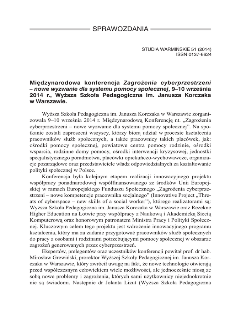 SPRAWOZDANIA STUDIA WARMIŃSKIE 51 (2014) ISSN 0137-6624 Międzynarodowa konferencja Zagrożenia cyberprzestrzeni – nowe wyzwanie dla systemu pomocy społecznej, 9–10 września 2014 r., Wyższa Szkoła Pedagogiczna im. Janusza Korczaka w Warszawie. Wy¿sza Szko³a Pedagogiczna im. Janusza Korczaka w Warszawie zorganizowa³a 910 wrzenia 2014 r. Miêdzynarodow¹ Konferencjê nt. Zagro¿enia cyberprzestrzeni nowe wyzwanie dla systemu pomocy spo³ecznej. Na spotkanie zostali zaproszeni wszyscy, którzy bior¹ udzia³ w procesie kszta³cenia pracowników s³u¿b spo³ecznych, a tak¿e pracownicy takich placówek, jak: orodki pomocy spo³ecznej, powiatowe centra pomocy rodzinie, orodki wsparcia, rodzinne domy pomocy, orodki interwencji kryzysowej, jednostki specjalistycznego poradnictwa, placówki opiekuñczo-wychowawcze, organizacje pozarz¹dowe oraz przedstawiciele w³adz odpowiedzialnych za kszta³towanie polityki spo³ecznej w Polsce. Konferencja by³a kolejnym etapem realizacji innowacyjnego projektu wspó³pracy ponadnarodowej wspó³finansowanego ze rodków Unii Europejskiej w ramach Europejskiego Funduszu Spo³ecznego Zagro¿enia cyberprzestrzeni nowe kompetencje pracownika socjalnego (Innovative Project Threats of cyberspace new skills of a social worker), którego realizatorami s¹: Wy¿sza Szko³a Pedagogiczna im. Janusza Korczaka w Warszawie oraz Rezekne Higher Education na £otwie przy wspó³pracy z Naukow¹ i Akademick¹ Sieci¹ Komputerow¹ oraz honorowym patronatem Ministra Pracy i Polityki Spo³ecznej. Kluczowym celem tego projektu jest wdro¿enie innowacyjnego programu kszta³cenia, który ma za zadanie przygotowaæ pracowników s³u¿b spo³ecznych do pracy z osobami i rodzinami potrzebuj¹cymi pomocy spo³ecznej w obszarze zagro¿eñ generowanych przez cyberprzestrzeñ. Ekspertów, prelegentów oraz uczestników konferencji powita³ prof. dr hab. Miros³aw Grewiñski, prorektor Wy¿szej Szko³y Pedagogicznej im. Janusza Korczaka w Warszawie, który zwróci³ uwagê na fakt, ¿e nowe technologie otwieraj¹ przed wspó³czesnym cz³owiekiem wiele mo¿liwoci, ale jednoczenie nios¹ ze sob¹ nowe problemy i zagro¿enia, których sami u¿ytkownicy niejednokrotnie nie s¹ wiadomi. Nastêpnie dr Jolanta Lizut (Wy¿sza Szko³a Pedagogiczna 354 Sprawozdania w Warszawie) zaprezentowa³a za³o¿enia projektu oraz produkt finalny, jakim jest publikacja programu pt. Zagro¿enia cyberprzestrzeni kompleksowy program dla pracowników s³u¿b spo³ecznych, który zostanie upowszechniony i w³¹czony do g³ównego nurtu polityki wród grup docelowych i decydentów. Redaktor publikacji podkreli³a, ¿e produkt finalny opiera siê na dowiadczeniu ekspertów i specjalistów bior¹cych udzia³ w projekcie, ich wiedzy merytorycznej, jak równie¿ uwagach zg³aszanych przez grupê docelow¹, dziêki czemu opracowany program mo¿na wykorzystaæ w praktyce. Cykl referatów rozpoczê³o wyst¹pienie prof. dr. hab. Miros³awa Grewiñskiego (Wy¿sza Szko³a Pedagogiczna w Warszawie) Zagro¿enia cyberprzestrzeni na tle innych wyzwañ s³u¿b spo³ecznych w Polsce. Autor podkreli³, ¿e tematyka zagro¿eñ powodowanych przez cyberprzestrzeñ, a szczególnie: cyberprzemocy, samobójstw z inspiracji sieci, stalkingu, hikikomori, sekstingu, wy³udzania informacji osobistych, uzale¿nieñ od komputera, telefonu, gier oraz wielu innych problemów wiata wirtualnego nie jest w wystarczaj¹cym stopniu nag³oniona, co sprawia, ¿e wiadomoæ spo³eczeñstwa w tym zakresie jest nadal bardzo niska. Niepokoj¹cym zjawiskiem jest równie¿ fakt, ¿e opiekunowie, rodzice, nauczyciele oraz osoby pe³ni¹ce wa¿ne role spo³eczne nie maj¹ odpowiedniej wiedzy, w jaki sposób rozpoznawaæ powy¿sze zagro¿enia. Nastêpnie prof. Velta Lubkina (Rezekne Higher Education Institution) w referacie Electronic treats in Lativa przedstawi³a skalê zjawiska e-zagro¿eñ na £otwie. Zwróci³a tak¿e uwagê na statystyki: o ile na £otwie, podobnie jak w Polsce 70% u¿ytkowników korzysta z Internetu codziennie, o tyle rednia dla ca³ego globu wynosi 60%. Analogiczna jest tak¿e tendencja wykorzystywania sieci do odwiedzania portali spo³ecznociowych (69% w obu krajach). £otwa jest krajem realizuj¹cym dokument Cybersecurity Strategy of the European Union: An Open, Safe and Secure Cyberspace, opracowany przez Komisjê Europejsk¹ i opublikowany 7 lutego 2013 r. W wyst¹pieniu Internet usage and digital skills, dr Svetlana Uèa (Personality and Socialization Research Institute) zauwa¿y³a, ¿e na £otwie rozpowszechnianie technologii informacyjno-telekomunikacyjnych postêpuje w du¿ym tempie. W 2004 r. w tym kraju 26% gospodarstw domowych posiada³o komputer, natomiast 15% mia³o pod³¹czenie do Internetu. W 2013 r. odsetek gospodarstw domowych posiadaj¹cych komputer wraz z pod³¹czeniem do Internetu zwiêkszy³ siê do 72%. Pomimo zajmowania przez d³u¿szy czas odleg³ych miejsc w rankingach pod wzglêdem dostêpnoci Internetu w poszczególnych krajach, £otwa zapewnia coraz wiêkszemu gronu obywateli dostêp do tego medium. Kolejny prelegent prof. Artis Teilans (Rezekne University of Applied Sciences) w referacie Internet security risk management zaznaczy³, ¿e poprawa Sprawozdania 355 bezpieczeñstwa w Internecie i zarz¹dzanie ryzykiem jest kluczowym zagadnieniem instytucji publicznych i prywatnych firm, które prowadz¹ walkê z zagro¿eniami wynikaj¹cymi z po³¹czenia coraz wiêkszej liczby u¿ytkowników z Internetem. Umiejêtnoæ w³aciwego korzystania z komputera i Internetu decydowaæ bêdzie o dalszej drodze przez wirtualny wiat, w którym jest wiele ró¿nego rodzaju niebezpieczeñstw: dla nas, np. w zakresie danych osobowych czy dóbr osobistych, jak równie¿ w odniesieniu do sprzêtu na którym pracujemy czy z którego korzystamy. Koncepcje wykorzystania portali spo³ecznociowych przez instytucje publiczne przedstawi³ prof. Gilberto Marzano (Università degli Studi di Trieste) w swoim wyst¹pieniu Risk