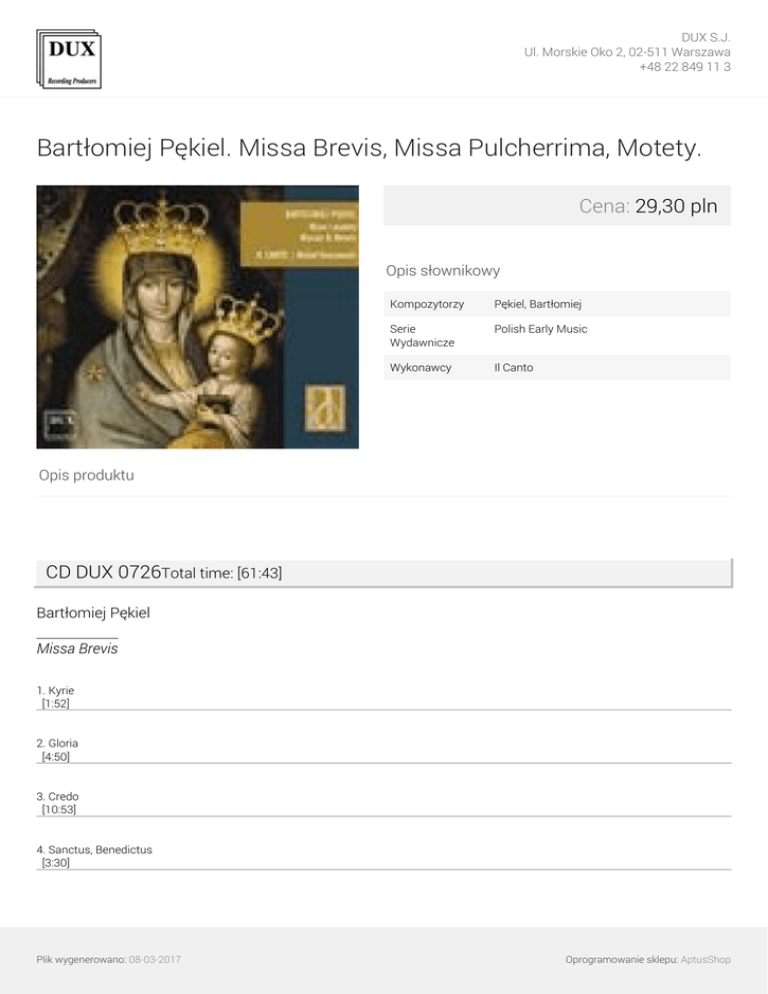 DUX S.J. Ul. Morskie Oko 2, 02-511 Warszawa +48 22 849 11 3 Bartłomiej Pękiel. Missa Brevis, Missa Pulcherrima, Motety. Cena: 29,30 pln Opis słownikowy Kompozytorzy Pękiel, Bartłomiej ∎ Serie Wydawnicze Polish Early Music Wykonawcy Il Canto ∎ Opis produktu CD DUX 0726Total time: [61:43] Bartłomiej Pękiel Missa Brevis 1. Kyrie [1:52] 2. Gloria [4:50] 3. Credo [10:53] 4. Sanctus, Benedictus [3:30] Plik wygenerowano: 08-03-2017 Oprogramowanie sklepu: AptusShop DUX S.J. Ul. Morskie Oko 2, 02-511 Warszawa +48 22 849 11 3 5. Agnus Dei [3:35] Bartłomiej Pękiel Missa Pulcherrima 6. Kyrie [3:23] 7. Gloria [5:14] 8. Credo [9:27] 9. Sanctus, Benedictus [4:49] 10. Agnus Dei [4:03] Bartłomiej Pękiel Sub Tuum praesidium 11. Sub tuum praesidium [1:45] Bartłomiej Pękiel Ave Maria 12. Ave Maria [2:48] Bartłomiej Pękiel Plik wygenerowano: 08-03-2017 Oprogramowanie sklepu: AptusShop DUX S.J. Ul. Morskie Oko 2, 02-511 Warszawa +48 22 849 11 3 Salvator orbis 13. Salvator orbis [2:43] Bartłomiej Pękiel Magnum nomen Domini 14. Magnum nomen Domini [1:29] Bartłomiej Pękiel Resonet in laudibus 15. Resonet in laudibus [1:26] Wykonawcy: Il Canto Plik wygenerowano: 08-03-2017 Powered by TCPDF (www.tcpdf.org) Oprogramowanie sklepu: AptusShop