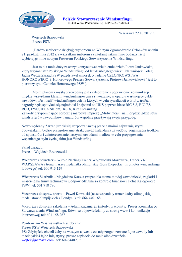 Polskie Stowarzyszenie Windsurfingu, 01-498 W-wa, Podmiejska 19; NIP: 522-27-98-024 Warszawa 22.10.2012 r. Wojciech Brzozowski Prezes PSW „Bardzo serdecznie dziękuję wyborcom na Walnym Zgromadzenie Członków w dniu 21. października 2012 r. i wszystkim surferom za zaufanie jakim mnie obdarzyliście wybierając mnie nowym Prezesem Polskiego Stowarzyszenia Windsurfingu Jest to dla mnie duży zaszczyt kontynuować wieloletnie dzieło Piotra Jankowiaka, który trzymał ster Polskiego Windsurfingu od lat 70 ubiegłego wieku. Na wniosek Kolegi Jacka Wróża Zarząd PSW przedstawił wniosek o nadanie CZŁONKOWSTWA HONOROWEGO i Honorowego Prezesa Stowarzyszenia, Piotrowi Jankowiakowi ( jest to pierwszy tytuł Członka Honorowego PSW ). . Moim planem i myślą przewodnią jest zjednoczenie i poprawienie komunikacji między wszystkimi klasami windsurfingowymi i stworzenie, w oparciu o istniejące cykle zawodów, „festiwali” windsurfingowych na których w celu rywalizacji o tytuły, trofea i nagrody będą spotykać się najmłodsi i najstarsi od UKS poprzez klasę BIC 5,8, BIC 7,8, RCB, FWC, IFCA Slalom, RS:X, Kita i Icesurfing. Zawody przypominające coroczną marcową imprezę „Midwinters” na Florydzie gdzie setki windsurferów zawodników i amatorów wspólnie przeżywają swoją przygodę. Nowo wybrany Zarząd już dzisiaj rozpoczął swoją pracę a moimi najważniejszymi obowiązkami będzie przygotowanie atrakcyjnego kalendarza zawodów, organizacja środków od sponsorów i zainteresowanie naszymi zawodami mediów w celu propagowania wspaniałego stylu życia jakim jest Windsurfing. Skład zarządu: Prezes - Wojciech Brzozowski Wiceprezes Sekretarz – Witold Nerling (Trener Wojewódzki Mazowsza, Trener YKP WARSZAWA i trener naszej medalistki olimpijskiej Zosi Klepackiej. Promotor windsurfingu lodowego) tel: 600 913 129 Wiceprezes Skarbnik – Magdalena Karska (wspaniała mama młodej zawodniczki, żeglarki i właścicielka firmy rachunkowej, odpowiedzialna za kontrolę finansów i Pełną Księgowość PSW) tel: 501 718 780 Viceprezes do spraw sportu – Paweł Kowalski (nasz wspaniały trener kadry olimpijskiej i medalistów olimpijskich z Londynu) tel: 664 440 168 Viceprezes do spraw szkolenia – Adam Kaczmarek (młody, pracowity, Prezes Koninskiego Stowarzyszenia Windsurfingu. Również odpowiedzialny za stronę www i komunikację internetową) tel: 601 158 267 Pozdrawiam Was wszystkich serdecznie Prezes PSW Wojciech Brzozowski PS: Gdybyście chcieli żeby na waszym akwenie zostały zorganizowane fajne zawody lub macie jakieś fajne inicjatywy, proszę napiszcie do mnie albo dzwońcie: [email protected] tel: 602644090.”