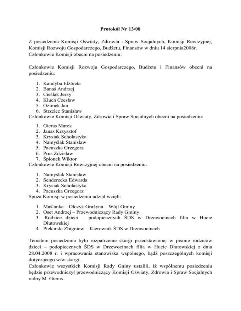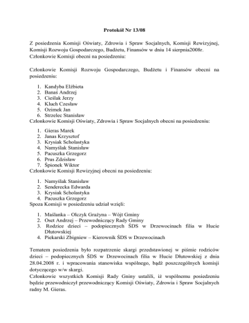 Protokół Nr 13/08 Z posiedzenia Komisji Oświaty, Zdrowia i Spraw Socjalnych, Komisji Rewizyjnej, Komisji Rozwoju Gospodarczego, Budżetu, Finansów w dniu 14 sierpnia2008r. Członkowie Komisji obecni na posiedzeniu: Członkowie Komisji Rozwoju Gospodarczego, Budżetu i Finansów obecni na posiedzeniu: 1. Kandyba Elżbieta 2. Banaś Andrzej 3. Cieślak Jerzy 4. Kluch Czesław 5. Ozimek Jan 6. Strzelec Stanisław Członkowie Komisji Oświaty, Zdrowia i Spraw Socjalnych obecni na posiedzeniu: 1. Gieras Marek 2. Janas Krzysztof 3. Krysiak Scholastyka 4. Namyślak Stanisław 5. Pacuszka Grzegorz 6. Prus Zdzisław 7. Śpionek Wiktor Członkowie Komisji Rewizyjnej obecni na posiedzeniu: 1. Namyślak Stanisław 2. Senderecka Edwarda 3. Krysiak Scholastyka 4. Pacuszka Grzegorz Spoza Komisji w posiedzeniu udział wzięli: 1. Maślanka – Olczyk Grażyna – Wójt Gminy 2. Oset Andrzej – Przewodniczący Rady Gminy 3. Rodzice dzieci – podopiecznych ŚDS w Drzewocinach filia w Hucie Dłutowskiej 4. Piekarski Zbigniew – Kierownik ŚDS w Drzewocinach Tematem posiedzenia było rozpatrzenie skargi przedstawionej w piśmie rodziców dzieci – podopiecznych ŚDS w Drzewocinach filia w Hucie Dłutowskiej z dnia 28.04.2008 r. i wpracowania stanowiska wspólnego, bądź poszczególnych komisji dotyczącego w/w skargi. Członkowie wszystkich Komisji Rady Gniny ustalili, iż wspólnemu posiedzeniu będzie przewodniczył przewodniczący Komisji Oświaty, Zdrowia i Spraw Socjalnych radny M. Gieras. Następnie podczas gorącej dyskusji, w której radni twierdzili, że na podstawie materiałów, które posiadają (tj. skarga z dnia 28.04.2008 r., pisma Wójta Gminy z dnia 15.05.2008 r., artykułami z „Ekspresu” i „Nowego Życia Pabianic”, notatki sporządzonej na okoliczność spotkania w ŚDS w Drzewocinach w dniu 23.07.2008 r., notatki sporządzonej na okoliczność spotkania w Filii ŚDS w Hucie Dłutowskiej w dniu 30.07.2008 r.) i do których na dzień dzisiejszy mieli dostęp nie są w stanie ocenić zarzutów przedstawianych w skardze. Radni przedstawiali różne propozycje przeprowadzenia komisji i rozpatrzenia sprawy. Radna S. Krysiak stwierdziła, że wójt gminy popełniła błąd nie rozmawiając z rodzicami wtedy, kiedy Pan Kierownik ŚDS był zatrudniony na okres trzech miesięcy. Radny M.Gieras stwierdził, że radni nie mają uprawnień do zwolnienia Kierownika ŚDS. Radny S. Namyślak stwierdził, iż należałoby zapytać, sprawdzić czy Pan Z. Piekarski został zwolniony z pracy czy się sam zwolnił, dlaczego zataił swoją niepełnosprawność i rozpatrzyć wszystkie zarzuty przedstawione w skardze. Radna E.Senderecka stwierdziła, że radni nie powinni podejmować decyzji na podstawie plotek tylko rozpatrzyć sprawy zasadnych zarzutów. Stwierdziła również, że wszystko zmierza do jednego tj., aby Pan Z. Piekarski nie pracował, jako Kierownik ŚDS w Drzewocinach. Radny J.Cieślak stwierdził, że zarzuty przedstawiane przez rodziców nie są zasadne. Radny A. Banaś zgłosił propozycję, aby wysłuchać rodziców dzieci – podopiecznych ŚDS w Drzewocinach filia w Hucie Dłutowskiej, którzy zostali zaproszeni na posiedzenie. Radny S. Namyślak potwierdził swoje wcześniejsze sugestie i uwagi, aby powołać 3 osobową komisję, która by zbadała sprawę, bo w tak dużym gronie członków komisji nie będzie możliwości wypracowania stanowiska w sprawie. Radny M.Gieras zaproponował, aby poprosić na obrady Komisji, jako pierwszych rodziców i wysłuchać ich racji, potem Pana Z. Piekarskiego, aby odniósł się do zarzutów przedstawianych w piśmie a następnie Komisja Rewizyjna zajmie się sprawą. Rodzice po wejściu na posiedzenie na ręce Przewodniczącego Rady Gminy A. Oset (obecnego na posiedzeniu) złożyli pismo, że w notatce sporządzonej na okoliczność spotkania w Filii ŚDS w Hucie Dłutowskiej w dniu 30.07.2008 r. zostały pominięte niektóre poruszane przez nich sprawy i przedstawiają je na piśmie. Pismo w załączeniu do protokołu. Radny M. Gieras zwrócił się z zapytaniem do rodziców przybyłych na posiedzenie czy są świadomi tego, że za słowa i stwierdzenia przedstawione w skardze mogą być pozwani do sądu przez kierownika ŚDS w Drzewocinach. Następnie zapytał czy rodzice znają jakieś fakty, sprawy bądź rzeczy, które zaistniały w placówce, o których chcą poinformować. Rodzice zaczęli przedstawiać swoje zarzuty do pracy Pana Z. Piekarskiego: 1) niezorganizowanie spotkania z rodzicami dzieci wkrótce po objęciu stanowiska kierownika ŚDS w Drzewocinach czego rodzice oczekiwali a następnie się domagali, 2) wyjaśnienie okoliczności zwolnienia Pana Zbigniewa Piekarskiego ze stanowiska zajmowanego w Łódzkim Urzędzie Wojewódzkim w Łodzi za seksualne molestowanie odległych mu pracownic mając na uwadze kontakt Kierownika z dziećmi przebywającymi w placówce, 3) brak logopedy i psychologa (logopedy od m-ca lutego br?), dzieci nie są właściwie rehabilitowane, 4) brak informacji o dzieciach o ich zachowaniu, zdrowiu podczas pobytu w ośrodku tj. nie ma możliwości uzyskania takiej informacji jak to miało miejsce dotychczas za poprzedniego kierownika, kiedy to opiekunki odwożąc dzieci do domu bądź sama Kierownik , udzielały informacji nie pytane nawet przez rodziców. Zdaniem rodziców w obecnej chwili opiekunki nie udzielają żadnych informacji nawet, kiedy są zapytane przez rodziców z uwagi na to, aby nie być posądzonym o donoszenie, 5) zdaniem rodziców Kierownik nie ma prawa przewozić swoim prywatnym samochodem dzieci bez zgody ich rodziców jak również pozostawienia ich bez właściwej opieki, 6) od m-ca kwietnia br. brak rozmów z pedagogiem szkolnym mających na celu wskazanie dzieci, które mogłyby uczestniczyć w zajęciach organizowanych w Hucie Dłutowskiej, 7) brak rehabilitanta z pełnymi kwalifikacjami, 8) brak zabezpieczenia środków na remont pieca co, 9) zatajenie orzeczenia lekarsk
