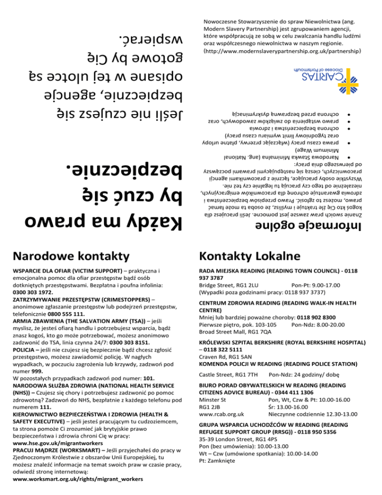 Nowoczesne Stowarzyszenie do spraw Niewolnictwa (ang. Modern Slavery Partnership) jest zgrupowaniem agencji, które współpracują ze sobą w celu zwalczania handlu ludźmi oraz współczesnego niewolnictwa w naszym regionie. (http://www.modernslaverypartnership.org.uk/partnership ) Znanie swoich praw zawsze jest pomocne. Jeśli pracujesz dla kogoś kto Cię źle traktuje i myślisz, że osoba ta może łamać prawo, możesz to zgłosić. Prawo przepisów bezpieczeństwa i zdrowia gwarantuje ochronę dla pracowników emigracyjnych, niezależnie od tego czy pracują tu legalnie czy też nie. Wszystkie osoby pracujące, łącznie z pracownikami agencji pracowniczych, cieszą się następującymi prawami począwszy od pierwszego dnia pracy: Narodowa Stawka Minimalna (ang. National Minimum Wage) prawa czasu pracy (włączając przerwy, płatne urlopy oraz tygodniowy limit wymiaru czasu pracy) ochrona bezpieczeństwa i zdrowia prawo wstąpienia do związków zawodowych, oraz ochrona przed bezprawną dyskryminacją Informacje ogólne Jeśli nie czujesz się bezpiecznie, agencje opisane w tej ulotce są gotowe by Cię wspierać. Każdy ma prawo by czuć się bezpiecznie. Narodowe kontakty Kontakty Lokalne WSPARCIE DLA OFIAR (VICTIM SUPPORT) – praktyczna i emocjonalna pomoc dla ofiar przestępstw bądź osób dotkniętych przestępstwami. Bezpłatna i poufna infolinia: 0300 303 1972. ZATRZYMYWANIE PRZESTĘPSTW (CRIMESTOPPERS) – anonimowe zgłaszanie przestępstw lub podejrzeń przestępstw, telefonicznie 0800 555 111. ARMIA ZBAWIENIA (THE SALVATION ARMY (TSA)) – jeśli myslisz, że jesteś ofiarą handlu i potrzebujesz wsparcia, bądż znasz kogoś, kto go może potrzebować, możesz anonimowo zadzwonić do TSA, linia czynna 24/7: 0300 303 8151. POLICJA – jeśli nie czujesz się bezpiecznie bądź chcesz zgłosić przestępstwo, możesz zawiadomić policję. W nagłych wypadkach, w poczuciu zagrożenia lub krzywdy, zadzwoń pod numer 999. W pozostałych przypadkach zadzwoń pod numer: 101. NARODOWA SŁUŻBA ZDROWIA (NATIONAL HEALTH SERVICE (NHS)) – Czujesz się chory i potrzebujesz zadzwonić po pomoc zdrowotną? Zadzwoń do NHS, bezpłatnie z każdego telefonu pod numerem 111. KIEROWNICTWO BEZPIECZEŃSTWA I ZDROWIA (HEALTH & SAFETY EXECUTIVE) – jeśli jesteś pracującym tu cudzoziemcem, ta strona pomoże Ci zrozumieć jak brytyjskie prawo bezpieczeństwa i zdrowia chroni Cię w pracy: www.hse.gov.uk/migrantworkers PRACUJ MĄDRZE (WORKSMART) – Jeśli przyjechałeś do pracy w Zjednoczonym Królestwie z obszarów Unii Europejskiej, tu możesz znaleźć informacje na temat swoich praw w czasie pracy, odwiedź stronę internetową: www.worksmart.org.uk/rights/migrant_workers RADA MIEJSKA READING (READING TOWN COUNCIL) - 0118 937 3787 Bridge Street, RG1 2LU Pon-Pt: 9.00-17.00 (Wypadki poza godzinami pracy: 0118 937 3737) CENTRUM ZDROWIA READING (READING WALK-IN HEALTH CENTRE) Mniej lub bardziej poważne choroby: 0118 902 8300 Pierwsze piętro, pok. 103-105 Pon-Ndz: 8.00-20.00 Broad Street Mall, RG1 7QA KRÓLEWSKI SZPITAL BERKSHIRE (ROYAL BERKSHIRE HOSPITAL) – 0118 322 5111 Craven Rd, RG1 5AN KOMENDA POLICJI W READING (READING POLICE STATION) Castle Street, RG1 7TH Pon-Ndz: 24 godziny/ dobę BIURO PORAD OBYWATELSKICH W READING (READING CITIZENS ADVICE BUREAU) - 0344 411 1306 Minster St Pon, Wt, Czw & Pt: 10.00-16.00 RG1 2JB Śr: 13.00-16.00 www.rcab.org.uk Nieczynne codziennie 12.30-13.00 GRUPA WSPARCIA UCHODŹCÓW W READING (READING REFUGEE SUPPORT GROUP (RRSG)) - 0118 950 5356 35-39 London Street, RG1 4PS Pon (bez umówienia): 10.00-13.00 Wt – Czw (umówione spotkania): 10.00-14.00 Pt: Zamknięte Centrum miasta Reading z położeniem lokalnych agencji i usług CENTRUM ZDROWIA KOMENDA POLICJI PORADY OBYWATELSKIE RADA MIASTA GRUPA WSPARCIA UCHODŹCÓW SZPITAL KRÓLEWSKI BERKS Produkcja i prawa autorskie przedstawionej mapy – Google Maps ((www.google.co.uk/maps). Dane mapy ©2015)