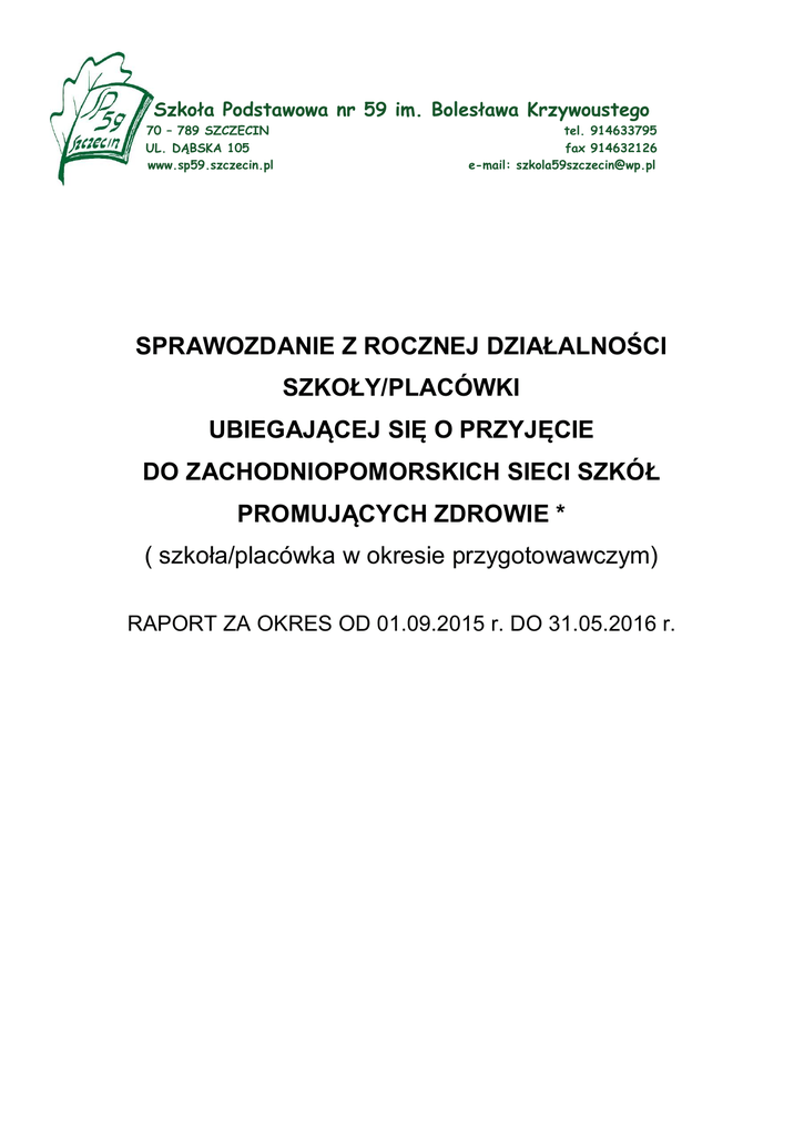 Szkoła Podstawowa nr 59 im. Bolesława Krzywoustego 70 – 789 SZCZECIN UL. DĄBSKA 105 www.sp59.szczecin.pl tel. 914633795 fax 914632126 e-mail: [email protected] SPRAWOZDANIE Z ROCZNEJ DZIAŁALNOŚCI SZKOŁY/PLACÓWKI UBIEGAJĄCEJ SIĘ O PRZYJĘCIE DO ZACHODNIOPOMORSKICH SIECI SZKÓŁ PROMUJĄCYCH ZDROWIE * ( szkoła/placówka w okresie przygotowawczym) RAPORT ZA OKRES OD 01.09.2015 r. DO 31.05.2016 r. SZKOŁA PODSTAWOWA NR 59 IM. BOLESŁAWA KRZYWOUSTEGO INFORMACJE PODSTAWOWE O SZKOLE/PLACÓWCE: Pełna nazwa szkoły/placówki Szkoła Podstawowa nr 59 im. Bolesława Krzywoustego w Szczecinie Szkoła jest w okresie: • przygotowawczym (właściwe podkreślić) • posiada certyfikat wojewódzki Adres • posiada certyfikat krajowy ul. Dąbska 105, 70-789, Szczecin (ulica, nr, kod pocztowy, miejscowość) Gmina Szczecin Powiat Szczecin Telefon 91 46 33 795 Adres mailowy szkoły [email protected] Adres mailowy koordynatora Strona www [email protected] Imię i nazwisko dyrektora Cecylia Baran Imię i nazwisko koordynatora Imiona i nazwiska członków szkolnego zespołu Izabela Misztal sp59.szczecin.pl nauczyciele: Iwona Sienkiewicz - nauczyciel przyrody Barbara Michalska – wychowawca świetlicy Edyta Michnik - bibliotekarz Katarzyna Szymczak - Kopka - nauczyciel wychowania fizycznego Elżbieta Wiśniewska - nauczyciel edukacji wczesnoszkolnej Agnieszka Skiba - nauczyciel techniki Edyta Hnat- nauczyciel edukacji wczesnoszkolnej Lucyna Grala - nauczyciel wychowania przedszkolnego Aleksandra Świerczewska- wychowawca świetlicy Dorota Politewicz – pedagog szkolny rodzice: Katarzyna Sapia pracownicy niepedagogiczni: Grażyna Potarska - pielęgniarka szkolna Data podjęcia uchwały o przystąpieniu do programu 24.04.2015r. SZKOŁA PODSTAWOWA NR 59 IM. BOLESŁAWA KRZYWOUSTEGO 1. Opis podjętych działań w zakresie diagnozowania potrzeb społeczności szkolnej. Opis powinien zawierać wyniki diagnozy oraz opis narzędzi za pomocą, których dokonano diagnozy. Diagnoza została przeprowadzona na podstawie: a) ankiety na temat stylu życia b) obserwacji uczniów w czasie lekcji i przerw oraz stołówce szkolnej c) obserwacji wyglądu zewnętrznego uczniów d) badań przeprowadzonych przez szkolną pielęgniarkę – analiza dokumentów Wyniki diagnozy – wyłonione problemy a) niewłaściwe nawyki żywieniowe b) niski poziom edukacji w zakresie wpływu stylu życia na zdrowie c) negatywny wpływ reklam na sposób odżywiania d) problem otyłości wśród dzieci 2. Plan działań w zakresie promocji zdrowia. Wpisać plan działań na dany rok wraz z listą osób odpowiedzialnych za realizację planu. Ten punkt można pominąć, jeśli dołączą Państwo do raportu plan w formie załącznika. Szkolny zespół Szkoły Promującej Zdrowie na podstawie diagnozy ustalił, że w roku szkolnym 2015/2016 podstawowym zadaniem szkoły będzie „Poprawa zachowań w zakresie zdrowego stylu życia poprzez: 1. Promowanie zdrowego odżywiania 2. Podniesienie świadomości na temat racjonalnego odżywiania wśród uczniów, rodziców i nauczycieli, 3. Zmiana nawyków żywieniowych dzieci - świadomy konsument, który zapobiega chorobom, promując zdrowe nawyki żywieniowe, 4. Zaangażowanie rodziców w zmiany żywieniowe, 5. Pozyskanie partnerów strategicznych, 6. Prowadzenie przez cały rok szkolny różnych akcji propagujących zdrowe odżywianie, zaangażowanie się w programy zewnętrzne, Zdrowie jest najważniejsze w życiu człowieka, to dzięki niemu możemy robić wiele ciekawych rzeczy. Należy, zatem wyposażyć uczniów w wiedzę i umiejętności sprzyjające dbaniu o swoje zdrowie i zdrowie innych ludzi oraz otaczające środowisko. SZKOŁA PODSTAWOWA NR 59 IM. BOLESŁAWA KRZYWOUSTEGO (Plan w załączniku) 3. Sprawozdanie z realizacji podjętych działań. Opisać krótko, w jaki sposób zostały zrealizowane poszczególne punkty planu działań z zakresu promocji zdrowia. STANDARD 1 Szkoła Promująca Zdrowie pomaga członkom społeczności szkolnej (w tym rodzicom) zrozumieć i zaakceptować koncepcję SzPZ. Wprowadzenie stałej zakładki „Szkoła Promująca Zdrowie” na stronie internetowej szkoły. Umieszczenie informacji o programie Szkoły Promującej Zdrowie oraz informacji o podejmowanych inicjatywach na stronie internetowej szkoły (zakładka) oraz publikowanie na łamach lokalnej gazety „Kurier szczeciński”, „Panorama 7” oraz” Prawobrzeże” artykułów o podejmowanych w szkole działaniach dotyczących promocji zdrowia. Przeprowadzenie lekcji z wychowawcą nawiązujących do tematyki prozdrowotnej. Przeprowadzenie zajęć dla uczniów z wykorzystaniem prezentacji na temat Szkoły Promującej Zdrowie oraz działań priorytetowych w zakresie promocji zdrowia. Ekspozycja na stałej gazetce prac, plakatów oraz informacji na temat podejmowanych działań. Przygotowanie przez poszczególne klasy tablic informujących o podejmowanych działaniach prozdrowotnych. Przedstawienie przez nauczycieli podczas zebrań z rodzicami informacji o podejmowanych działaniach, opracowanie folderu na temat Szkoły Promującej Zdrowie przekazywanych rodzicom podczas zebrań. Angażowanie rodziców w prozdrowotne inicjatywy klasowe i szkolne, np. zdrowe śniadania, wspólne wypieki, zajęcia kulinarne, festyn szkolny, realizacja projektów, przygotowanie do konkursów, imprezy klasowe. SZKOŁA PODSTAWOWA NR 59 IM. BOLESŁAWA KRZYWOUSTEGO STANDARD 3 Szkoła Promująca Zdrowie prowadzi edukację zdrowotną uczniów i pracowników oraz dąży do jej jakości i skuteczności. 1.Realizacja działań w ramach programów profilaktycznych: „Profilaktyka próchnicy zębów” „Bezpieczna droga do szkoły i ze szkoły” „Dzieci w sieci” „Zdrowa stópka, zdrowy kręgosłup” „Fit dzieciaki” „Między nami kobietkami” „Lekki tornister” 2.Realizacja programu „Matematyka ze smakiem” 3.Kontynuacja programów ogólnopolskich: „Owoce w szkole” „Szklanka mleka” „Mam kota n