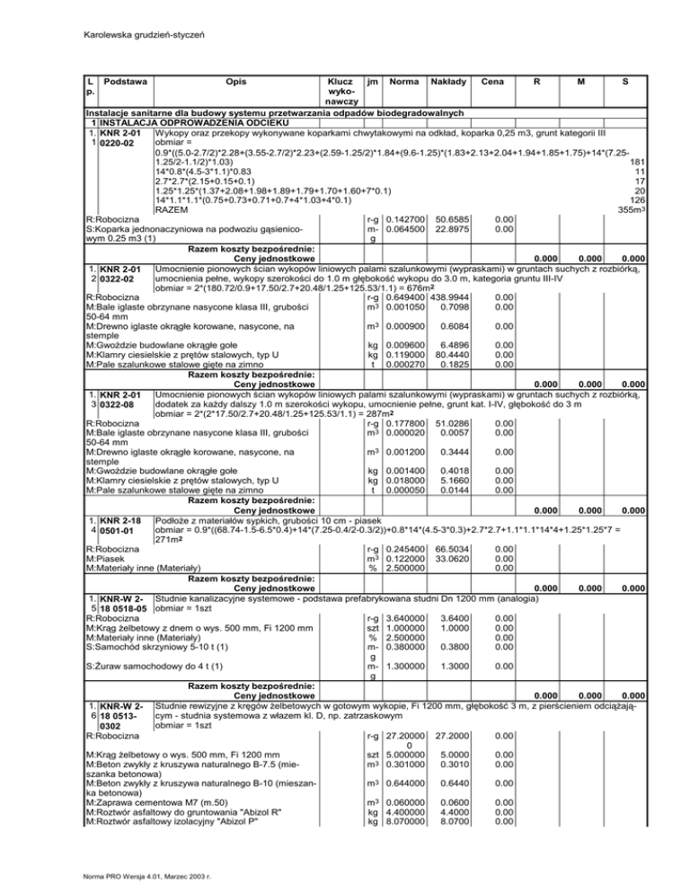 Karolewska grudzień-styczeń L Podstawa p. Klucz jm Norma Nakłady Cena R M S wykonawczy Instalacje sanitarne dla budowy systemu przetwarzania odpadów biodegradowalnych 1 INSTALACJA ODPROWADZENIA ODCIEKU 1. KNR 2-01 Wykopy oraz przekopy wykonywane koparkami chwytakowymi na odkład, koparka 0,25 m3, grunt kategorii III 1 0220-02 obmiar = 0.9*((5.0-2.7/2)*2.28+(3.55-2.7/2)*2.23+(2.59-1.25/2)*1.84+(9.6-1.25)*(1.83+2.13+2.04+1.94+1.85+1.75)+14*(7.251.25/2-1.1/2)*1.03) 181 14*0.8*(4.5-3*1.1)*0.83 11 2.7*2.7*(2.15+0.15+0.1) 17 1.25*1.25*(1.37+2.08+1.98+1.89+1.79+1.70+1.60+7*0.1) 20 14*1.1*1.1*(0.75+0.73+0.71+0.7+4*1.03+4*0.1) 126 RAZEM 355m3 R:Robocizna r-g 0.142700 50.6585 0.00 S:Koparka jednonaczyniowa na podwoziu gąsienicom- 0.064500 22.8975 0.00 wym 0.25 m3 (1) g Razem koszty bezpośrednie: Ceny jednostkowe 0.000 0.000 0.000 1. KNR 2-01 Umocnienie pionowych ścian wykopów liniowych palami szalunkowymi (wypraskami) w gruntach suchych z rozbiórką, 2 0322-02 umocnienia pełne, wykopy szerokości do 1.0 m głębokość wykopu do 3.0 m, kategoria gruntu III-IV obmiar = 2*(180.72/0.9+17.50/2.7+20.48/1.25+125.53/1.1) = 676m2 R:Robocizna r-g 0.649400 438.9944 0.00 M:Bale iglaste obrzynane nasycone klasa III, grubości m3 0.001050 0.7098 0.00 50-64 mm M:Drewno iglaste okrągłe korowane, nasycone, na m3 0.000900 0.6084 0.00 stemple M:Gwoździe budowlane okrągłe gołe kg 0.009600 6.4896 0.00 M:Klamry ciesielskie z prętów stalowych, typ U kg 0.119000 80.4440 0.00 M:Pale szalunkowe stalowe gięte na zimno t 0.000270 0.1825 0.00 Razem koszty bezpośrednie: Ceny jednostkowe 0.000 0.000 0.000 1. KNR 2-01 Umocnienie pionowych ścian wykopów liniowych palami szalunkowymi (wypraskami) w gruntach suchych z rozbiórką, 3 0322-08 dodatek za każdy dalszy 1.0 m szerokości wykopu, umocnienie pełne, grunt kat. I-IV, głębokość do 3 m obmiar = 2*(2*17.50/2.7+20.48/1.25+125.53/1.1) = 287m2 R:Robocizna r-g 0.177800 51.0286 0.00 M:Bale iglaste obrzynane nasycone klasa III, grubości m3 0.000020 0.0057 0.00 50-64 mm M:Drewno iglaste okrągłe korowane, nasycone, na m3 0.001200 0.3444 0.00 stemple M:Gwoździe budowlane okrągłe gołe kg 0.001400 0.4018 0.00 M:Klamry ciesielskie z prętów stalowych, typ U kg 0.018000 5.1660 0.00 M:Pale szalunkowe stalowe gięte na zimno t 0.000050 0.0144 0.00 Razem koszty bezpośrednie: Ceny jednostkowe 0.000 0.000 0.000 1. KNR 2-18 Podłoże z materiałów sypkich, grubości 10 cm - piasek 4 0501-01 obmiar = 0.9*((68.74-1.5-6.5*0.4)+14*(7.25-0.4/2-0.3/2))+0.8*14*(4.5-3*0.3)+2.7*2.7+1.1*1.1*14*4+1.25*1.25*7 = 271m2 R:Robocizna r-g 0.245400 66.5034 0.00 M:Piasek m3 0.122000 33.0620 0.00 M:Materiały inne (Materiały) % 2.500000 0.00 Razem koszty bezpośrednie: Ceny jednostkowe 0.000 0.000 0.000 1. KNR-W 2- Studnie kanalizacyjne systemowe - podstawa prefabrykowana studni Dn 1200 mm (analogia) 5 18 0518-05 obmiar = 1szt R:Robocizna r-g 3.640000 3.6400 0.00 M:Krąg żelbetowy z dnem o wys. 500 mm, Fi 1200 mm szt 1.000000 1.0000 0.00 M:Materiały inne (Materiały) % 2.500000 0.00 S:Samochód skrzyniowy 5-10 t (1) m- 0.380000 0.3800 0.00 g S:Żuraw samochodowy do 4 t (1) m- 1.300000 1.3000 0.00 g Razem koszty bezpośrednie: Ceny jednostkowe 0.000 0.000 0.000 1. KNR-W 2- Studnie rewizyjne z kręgów żelbetowych w gotowym wykopie, Fi 1200 mm, głębokość 3 m, z pierścieniem odciążają6 18 0513cym - studnia systemowa z włazem kl. D, np. zatrzaskowym obmiar = 1szt 0302 R:Robocizna r-g 27.20000 27.2000 0.00 0 M:Krąg żelbetowy o wys. 500 mm, Fi 1200 mm szt 5.000000 5.0000 0.00 M:Beton zwykły z kruszywa naturalnego B-7.5 (miem3 0.301000 0.3010 0.00 szanka betonowa) M:Beton zwykły z kruszywa naturalnego B-10 (mieszanm3 0.644000 0.6440 0.00 ka betonowa) M:Zaprawa cementowa M7 (m.50) m3 0.060000 0.0600 0.00 M:Roztwór asfaltowy do gruntowania "Abizol R" kg 4.400000 4.4000 0.00 M:Roztwór asfaltowy izolacyjny "Abizol P" kg 8.070000 8.0700 0.00 Norma PRO Wersja 4.01, Marzec 2003 r. Opis Karolewska grudzień-styczeń L Podstawa p. Opis M:Stopnie włazowe żeliwne M:Właz żeliwny kl. D400 z zamkiem zatrzaskowym, z amortyzatorem M:Pokrywa nadstudzienna żelbetowa Fi 1440/600 mm M:Pierścienie odciążające żelbetowe Fi 1200 M:Materiały inne (Materiały) S:Samochód skrzyniowy 5-10 t (1) S:Żuraw samochodowy do 4 t (1) Klucz jm Norma Nakłady wykonawczy szt 8.000000 8.0000 szt 1.000000 1.0000 szt szt % mg mg Cena R M S 0.00 0.00 1.000000 1.000000 2.500000 2.420000 1.0000 1.0000 2.4200 0.00 0.00 0.00 0.00 3.880000 3.8800 0.00 Razem koszty bezpośrednie: Ceny jednostkowe 0.000 0.000 0.000 1. KNR-W 2- Studnie rewizyjne z kręgów żelbetowych w gotowym wykopie, Fi 1200 mm, za każde 0,5 m różnicy głębokości 7 18 0513-04 obmiar = -2 0.5 m R:Robocizna r-g 2.260000 -4.5200 0.00 M:Krąg żelbetowy o wys. 500 mm, Fi 1200 mm szt 1.000000 -2.0000 0.00 M:Zaprawa cementowa M7 (m.50) m3 0.010000 -0.0200 0.00 M:Roztwór asfaltowy do gruntowania "Abizol R" kg 0.880000 -1.7600 0.00 M:Roztwór asfaltowy izolacyjny "Abizol P" kg 1.610000 -3.2200 0.00 M:Stopnie włazowe żeliwne szt 1.700000 -3.4000 0.00 M:Materiały inne (Materiały) % 2.500000 0.00 S:Samochód skrzyniowy 5-10 t (1) m- 0.240000 -0.4800 0.00 g S:Żuraw samochodowy do 4 t (1) m- 0.530000 -1.0600 0.00 g Razem koszty bezpośrednie: Ceny jednostkowe 0.000 0.000 0.000 1. KNR-W 2- Studzienki kanalizacyjne systemowe 425 mm, zamknięcie rurą teleskopową, kineta PP przepływowa 160 mm (rura 8 18 0517karbow. ok. 1,25 m) obmiar = 7szt 0202 R:Robocizna r-g 2.420000 16.9400 0.00 M:Kineta studni włazowej z PE 425 mm, przepływowa szt 1.000000 7.0000 0.00 160 mm pod kątem 0-15° M:Uszczelka do rur karbowanych fi 425 mm szt 2.000000 14.0000 0.00 M:Rura karbowana z tworzywa sztucznego na trzony m 1.312500 9.1875 0.00 studzien 425 mm M:Rura teleskopowa z tworzywa sztucznego na trzony szt 1.000000 7.0000 0.00 studzienne, 425x375 mm M:Właz żeliwny 40 t do rury teleskopowej 425 mm szt 1.000000 7.0000 0.00 M:Pospółka - uziarnienie 0-31