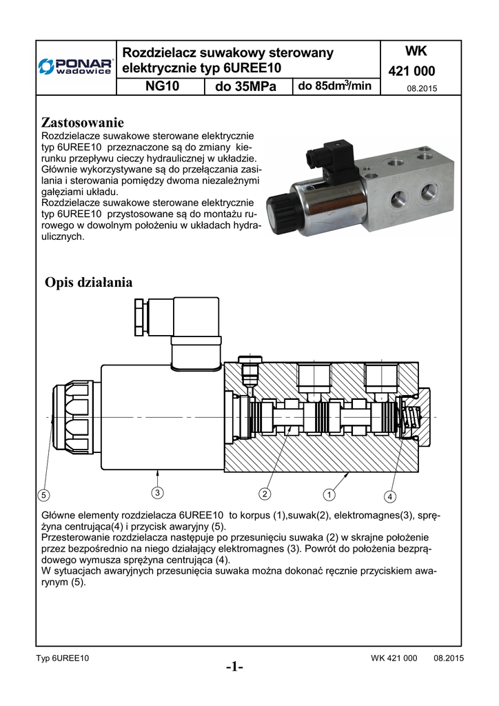 Rozdzielacz suwakowy sterowany elektrycznie typ 6UREE10 do 85dm3/min NG10 do 35MPa WK 421 000 08.2015 Zastosowanie Rozdzielacze suwakowe sterowane elektrycznie typ 6UREE10 przeznaczone są do zmiany kierunku przepływu cieczy hydraulicznej w układzie. Głównie wykorzystywane są do przełączania zasilania i sterowania pomiędzy dwoma niezależnymi gałęziami układu. Rozdzielacze suwakowe sterowane elektrycznie typ 6UREE10 przystosowane są do montażu rurowego w dowolnym położeniu w układach hydraulicznych. Opis działania 5 3 2 1 4 Główne elementy rozdzielacza 6UREE10 to korpus (1),suwak(2), elektromagnes(3), sprężyna centrująca(4) i przycisk awaryjny (5). Przesterowanie rozdzielacza następuje po przesunięciu suwaka (2) w skrajne położenie przez bezpośrednio na niego działający elektromagnes (3). Powrót do położenia bezprądowego wymusza sprężyna centrująca (4). W sytuacjach awaryjnych przesunięcia suwaka można dokonać ręcznie przyciskiem awarynym (5). Typ 6UREE10 -1- WK 421 000 08.2015 DANE TECHNICZNE Ciecz hydrauliczna olej mineralny Wymagana filtracja do 16 µm Zalecana filtracja do 10 µm Lepkość nominalna cieczy o 37 mm 2 /s w temperaturze 55 C Zakres temperatury otoczenia Max ciśnienie pracy Czas przesterowania o - 30o C do +50 C 21 MPa bez odprowadzenia przecieków 35 MPa z odprowadzeniem przecieków załączenie wyłączenie Max liczba przesterowań 15000 zał./h Masa max 5 kg Napięcie nominalne zasilania elektromagnesu Tolerancja napięcia zasilania DC DC ±10% Stopień ochrony Pobór mocy (prąd stały) IP 65 45 W do 60 ms do 40 ms 12V 24V max 150 o C Temperatura cewki elektromagnesu WYMAGANIA MONTAŻU I EKSPLOATACJI 1. Rozdzielacz sterowany elektrycznie należy użytkować tylko w pełni sprawny i prawidłowo przyłączony do instalacji elektrycznej. Przyłączanie lub odłączanie od instalacji elektrycznej musi być wykonywane przez wykwalifikowany personel. 2. Łączówka uziemiająca ( ) musi być połączona z przewodem ochronnym (PE ) w instalacji zasilającej zgodnie z odpowiednimi przepisami. 3. Zabrania się eksploatacji rozdzielacza jeżeli nie jest zapewniona szczelność i odpowiedni zacisk kabla zasilającego w dławnicy wtyczki. 4. Zabrania się użytkowania rozdzielacza, jeżeli wtyczka nie dolega dokładnie do gniazda elektromagnesu i nie jest zabezpieczona poprzez dokręcenie do oporu wkręta mocującego. 5. Ze względu na nagrzewanie się cewki elektromagnesu do wysokiej temperatury rozdzielacze powinny być umiejscowione tak,aby wyeliminować możliwość przypadkowego kontaktu z nim podczas eksploatacji lub należy przewidzieć odpowiednie osłony (zgodnie z wymaganiami norm europejskich: PN - EN ISO 13732-1 i PN - EN 982. SCHEMAT Odprowadzenie przecieków Typ 6UREE10 -2- WK 421 000 08.2015 WYMIARY GABARYTOWE I PRZYŁĄCZENIOWE 220 Wtyczka wg DIN43650-A/ISO4400 116,5 O 15 2 gniazda O 63 105 9 7 O 8,5 Przekrój A-A 26,5 67 66 46 ±0,1 10 Odprowadzenie przecieków G1/8 wg ISO1179-1 66 A 13 A 9 53,5 92 97 ±0,1 80,5 40 G1/ w g 2 -6 g ISO 117 niazd 9-1 Typ 6UREE10 -3- WK 421 000 08.2015 Wykres charakterystyki ∆ p(Q) dla rozdzielacza typ 6UREE10... Charakterystyka oporów przepływu 16 14 12 ∆p [bar] 10 8 P1->C1 6 P1->C4 4 2 0 10 20 30 40 50 60 70 80 90 Q [dm3/min] Sposób zamawiania 6UREE10-02/R -G12NZ4 * Nr serii 02 = 02 (01-10) niezmienne wym. przył.i zabudowy Przyłącza gwint rurowy G1/2" = R Napięcie zasilania elektromagnesu z przyciskiem awaryjnego przesterowania 12V DC = G12N 24V DC = G24N Wtyczka elektromagnesu wtyczka Z4 = Z4 wtyczka Z4L (z lampką ) = Z4L Rodzaj uszczelnienia NBR(dla cieczy na bazie olejów mineralnych) =bez oznaczenia FPM(dla cieczy na bazie estrów fosforanowych) =V Ewentualne dodatkowe wymagania określone w sposób opisowy (do uzgodnienia z producentem) Typ 6UREE10 -4- WK 421 000 08.2015 Przykład zastosowania w układzie hydraulicznym PONAR Wadowice S.A. ul. Wojska Polskiego 29 34-100 Wadowice tel. +48 33 823 44 41 - 45 fax.+48 33 823 41 69 www.ponar-wadowice.pl Typ 6UREE10 -5- WK 421 000 08.2015
