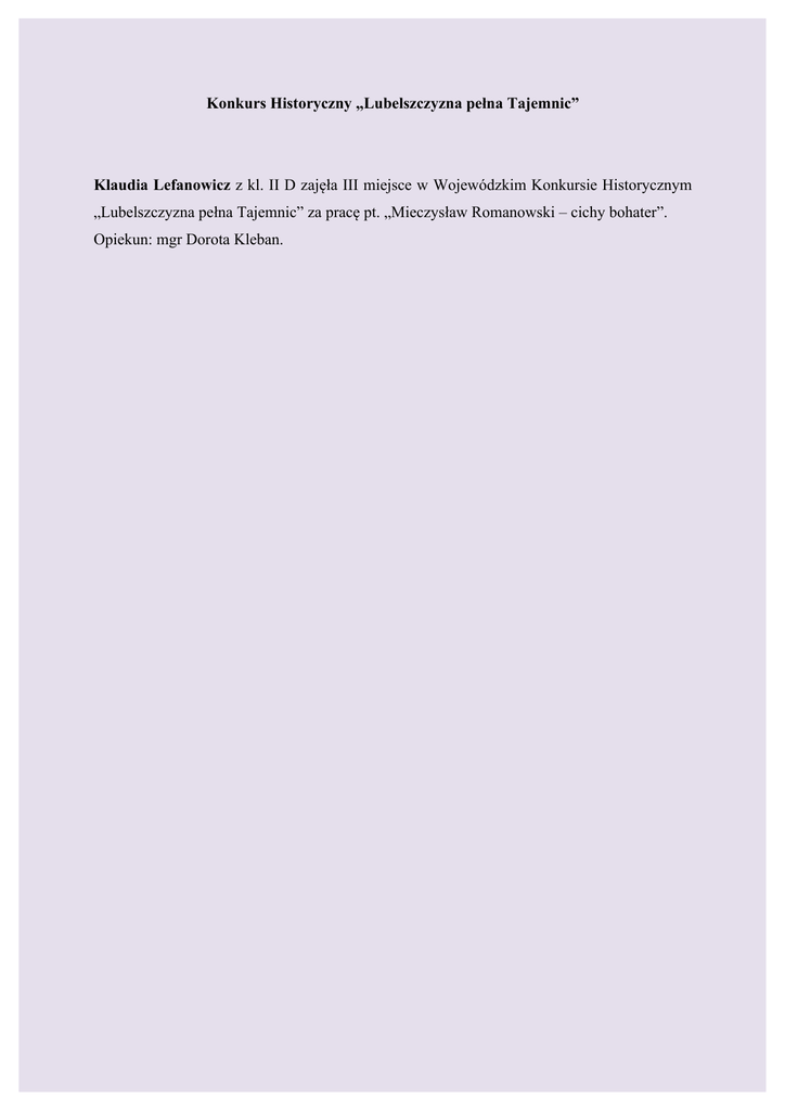 Konkurs Historyczny „Lubelszczyzna pełna Tajemnic” Klaudia Lefanowicz z kl. II D zajęła III miejsce w Wojewódzkim Konkursie Historycznym „Lubelszczyzna pełna Tajemnic” za pracę pt. „Mieczysław Romanowski – cichy bohater”. Opiekun: mgr Dorota Kleban.