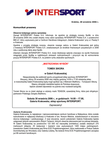 Kraków, 28 września 2006 r. Komunikat prasowy Otwarcie kolejnego salonu sprzedaży Zarząd INTERSPORT Polska S.A. informuje, że zgodnie ze strategią rozwoju Spółki, w dniu 28 września 2006 roku został otwarty nowy salon sprzedaży INTERSPORT Polska S.A. o powierzchni 869 m2, który usytuowany jest w Centrum Handlowo-Usługowym „Galeria Krakowska” przy ul. Pawiej 5 w Krakowie. Zgodnie z przyjętą strategią rozwoju, otwarcie nowego salonu w Galerii Krakowskiej jest jedną z inwestycji INTERSPORT Polska S.A. zrealizowanych ze środków finansowych pozyskanych w 2006 roku z publicznej oferty akcji Spółki. Zdaniem Zarządu INTERSPORT Polska S.A. nowa lokalizacja wpłynie znacząco na wyniki finansowe osiągnięte przez Spółkę w najbliższych okresach rozliczeniowych i przyczyni się do wzmocnienia pozycji INTERSPORT Polska S.A. na polskim rynku artykułów sportowych. „MISTRZOWSKI WYBÓR” TOMEK SIKORA w Galerii Krakowskiej Niespodziankę dla wielbicieli sportu przygotował sklep sportowy INTERSPORT. Wszyscy, którzy 30 września 2006 roku między godziną 14:00 a 17:00 odwiedzą sklep w nowootwartej Galerii Krakowskiej będą mogli spotkać się z Mistrzem Biathlonu - Tomaszem Sikorą. Sławny olimpijski medalista będzie do Państwa dyspozycji, będzie udzielał odpowiedzi na pytania oraz rozdawał autografy. Tomek Sikora na co dzień startuje w odzieży marki TENSON, szwedzkiej firmy, która jest oficjalnym partnerem Polskiego Związku Biathlonu. Sobota 30 września 2006 r., w godzinach: 14.00 – 17.00, Galeria Krakowska, sklep sportowy INTERSPORT. Zapraszamy! Galeria Krakowska Galeria Krakowska, to największe i najnowocześniejsze centrum handlowe w Małopolsce, które zostało wybudowane w najlepszej lokalizacji w Krakowie w tzw. Nowym Mieście, zlokalizowanym w otoczeniu dworca kolejowego i autobusowego. Z racji otoczenia, swoim położeniem Galeria Krakowska będzie ustępować jedynie warszawskim Złotym Tarasom, których otwarcie planowane jest na połowę listopada. W Galerii Krakowskiej na powierzchni 123 000 m2 niezwykłej architektury zostało otwartych 270 markowych sklepów, 25 restauracji i kawiarni oraz usytuowanych 1400 miejsc parkingowych. Inwestorem Galerii Krakowskiej jest firma ECE Projektmanagement, która realizowała w Polsce Galerie Dominikańską we Wrocławiu oraz Galerię Łódzką. Na świecie firma ECE Projektmanagement zarządza już 89 centrami handlowymi. INTERSPORT Polska S.A. Działalność INTERSPORT Polska polega na sprzedaży detalicznej markowego sprzętu sportowego w specjalistycznych sklepach o dużej powierzchni, zlokalizowanych w wybranych, prestiżowych centrach handlowych dużych miast. Spółka prowadzi sprzedaż w 13 salonach: czterech w Krakowie oraz po jednym salonie w Bielsku-Białej, Bytomiu, Gdańsku, Katowicach, Łodzi, Poznaniu, Sosnowcu, Warszawie i Wrocławiu, o łącznej powierzchni prawie 11.000 m2.. W planach Spółka ma otwarcie kolejnych 9 sklepów, tak aby do końca 2008 roku prowadzić sprzedaż w 22 slepach. Spółka oferuje około 10.000 artykułów do uprawiania 40 popularnych wśród Polaków dyscyplin sportu. Rosnące na polskim rynku artykułów sportowych znaczenie Spółki, wzbudziło uznanie największego na świecie gracza w tej branży – Grupy INTERSPORT. 24 października 2005 roku Spółka podpisała umowy licencyjne oraz nawiązała strategiczną współpracę z Grupą INTERSPORT. W wyniku zawartej umowy inwestycyjnej, INTERSPORT Deutschland eG, podmiot Grupy IINTERSPORT objął 25 proc. akcji Spółki, co zapewniło firmie dodatkową stabilizację finansową. Jednocześnie nowy akcjonariusz zadeklarował wolę pozostania akcjonariuszem mniejszościowym na poziomie 25 proc., a tym samym zapewnił, że nie zamierza zwiększać kontroli nad INTERSPORT Polska S.A., co zostało zapisane i zagwarantowane w statucie firmy. Spółka od kilku lat systematycznie zwiększała zarówno poziom przychodów ze sprzedaży, jak i wyniku netto. W 2005 roku Spółka zanotowała wzrost przychodów o 43,4% w stosunku do 2004 roku, wcześniej zaś o 60,8% w stosunku do roku 2003. Sprzedaż towarów i usług wyniosła w latach 2005 – 2003 odpowiednio: 86,5 mln zł, 60,4 mln zł oraz 37,6 mln zł. Tak dynamiczny wzrost przychodów wynikał przede wszystkim ze znacznego powiększenia sieci sprzedaży, wzrostu efektywności poszczególnych sklepów oraz z odpowiedniego poszerzenia i pogłębienia asortymentu. W efekcie zysk netto w okresie 2003 – 2005 zwiększył się ponad czterokrotnie z 0,6 mln zł w roku 2003 do 2,5 mln zł w roku 2005. Po dwóch kwartałach 2006, narastająco przychód netto ze sprzedaży wyniósł 50 972 tys. zł, a zysk netto 733 tys. zł. Przychody Spółki ze sprzedaży towarów i usług wyniosły 16,9 mln zł, czyli o 31 % więcej niż w analogicznym okresie roku ubiegłego (12,9 mln zł). W 2008 roku Spółka planuje sprzedawać towary za kwotę 250 mln zł i osiągnąć zysk netto w wysokości 12 mln zł. Dodatkowych informacji udzielają: Relacje inwestorskie Agnieszka Wąsik Dyrektor Marketingu i PR INTERSPORT Polska S.A. Tel. (012) 258 84 09, 602 615 731 E-mail: [email protected] Mirosław Gruca Dyrektor Pionu Relacji Inwestorskich Agencja Informacyjna PENETRATOR Sp. z o.o. Tel. (012) 429 47 77, 602 721 204 E-mail: [email protected] Iwona Książek Dział Informacji INTERSPORT Polska S.A. Tel. (012) 258 84 36, 600 401 271 E-mail: [email protected]
