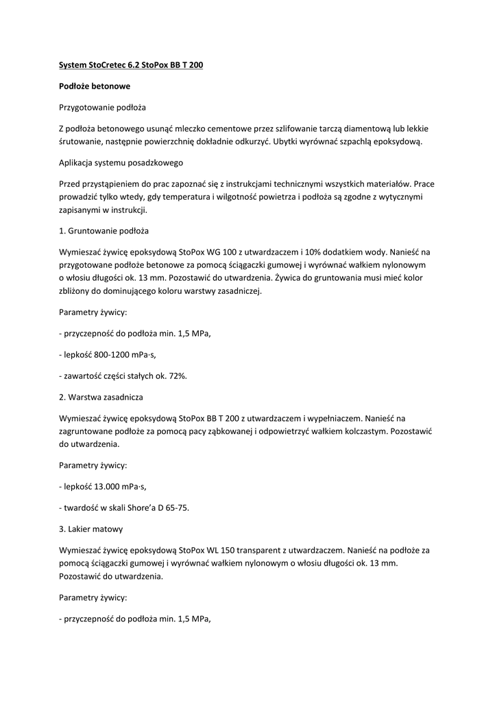 System StoCretec 6.2 StoPox BB T 200 Podłoże betonowe Przygotowanie podłoża Z podłoża betonowego usunąć mleczko cementowe przez szlifowanie tarczą diamentową lub lekkie śrutowanie, następnie powierzchnię dokładnie odkurzyć. Ubytki wyrównać szpachlą epoksydową. Aplikacja systemu posadzkowego Przed przystąpieniem do prac zapoznać się z instrukcjami technicznymi wszystkich materiałów. Prace prowadzić tylko wtedy, gdy temperatura i wilgotność powietrza i podłoża są zgodne z wytycznymi zapisanymi w instrukcji. 1. Gruntowanie podłoża Wymieszać żywicę epoksydową StoPox WG 100 z utwardzaczem i 10% dodatkiem wody. Nanieść na przygotowane podłoże betonowe za pomocą ściągaczki gumowej i wyrównać wałkiem nylonowym o włosiu długości ok. 13 mm. Pozostawić do utwardzenia. Żywica do gruntowania musi mieć kolor zbliżony do dominującego koloru warstwy zasadniczej. Parametry żywicy: - przyczepność do podłoża min. 1,5 MPa, - lepkość 800-1200 mPa∙s, - zawartość części stałych ok. 72%. 2. Warstwa zasadnicza Wymieszać żywicę epoksydową StoPox BB T 200 z utwardzaczem i wypełniaczem. Nanieść na zagruntowane podłoże za pomocą pacy ząbkowanej i odpowietrzyć wałkiem kolczastym. Pozostawić do utwardzenia. Parametry żywicy: - lepkość 13.000 mPa∙s, - twardość w skali Shore’a D 65-75. 3. Lakier matowy Wymieszać żywicę epoksydową StoPox WL 150 transparent z utwardzaczem. Nanieść na podłoże za pomocą ściągaczki gumowej i wyrównać wałkiem nylonowym o włosiu długości ok. 13 mm. Pozostawić do utwardzenia. Parametry żywicy: - przyczepność do podłoża min. 1,5 MPa, - lepkość 250-450 mPa∙s, - ścieralność w teście Taber do 29 mg (CS10/1000U/1000g).