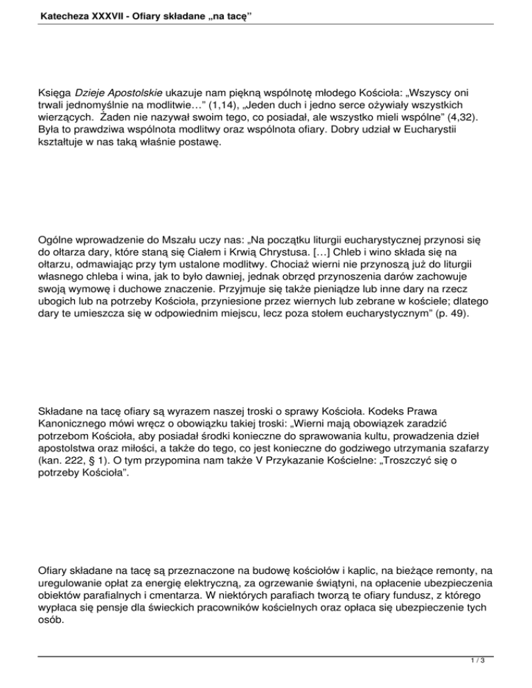 Katecheza XXXVII - Ofiary składane „na tacę” Księga Dzieje Apostolskie ukazuje nam piękną wspólnotę młodego Kościoła: „Wszyscy oni trwali jednomyślnie na modlitwie…” (1,14), „Jeden duch i jedno serce ożywiały wszystkich wierzących. Żaden nie nazywał swoim tego, co posiadał, ale wszystko mieli wspólne” (4,32). Była to prawdziwa wspólnota modlitwy oraz wspólnota ofiary. Dobry udział w Eucharystii kształtuje w nas taką właśnie postawę. Ogólne wprowadzenie do Mszału uczy nas: „Na początku liturgii eucharystycznej przynosi się do ołtarza dary, które staną się Ciałem i Krwią Chrystusa. […] Chleb i wino składa się na ołtarzu, odmawiając przy tym ustalone modlitwy. Chociaż wierni nie przynoszą już do liturgii własnego chleba i wina, jak to było dawniej, jednak obrzęd przynoszenia darów zachowuje swoją wymowę i duchowe znaczenie. Przyjmuje się także pieniądze lub inne dary na rzecz ubogich lub na potrzeby Kościoła, przyniesione przez wiernych lub zebrane w kościele; dlatego dary te umieszcza się w odpowiednim miejscu, lecz poza stołem eucharystycznym” (p. 49). Składane na tacę ofiary są wyrazem naszej troski o sprawy Kościoła. Kodeks Prawa Kanonicznego mówi wręcz o obowiązku takiej troski: „Wierni mają obowiązek zaradzić potrzebom Kościoła, aby posiadał środki konieczne do sprawowania kultu, prowadzenia dzieł apostolstwa oraz miłości, a także do tego, co jest konieczne do godziwego utrzymania szafarzy (kan. 222, § 1). O tym przypomina nam także V Przykazanie Kościelne: „Troszczyć się o potrzeby Kościoła”. Ofiary składane na tacę są przeznaczone na budowę kościołów i kaplic, na bieżące remonty, na uregulowanie opłat za energię elektryczną, za ogrzewanie świątyni, na opłacenie ubezpieczenia obiektów parafialnych i cmentarza. W niektórych parafiach tworzą te ofiary fundusz, z którego wypłaca się pensje dla świeckich pracowników kościelnych oraz opłaca się ubezpieczenie tych osób. 1/3 Katecheza XXXVII - Ofiary składane „na tacę” Ofiary składane na tacę nie są przeznaczone na utrzymanie duszpasterzy. Nie mogą być przeznaczone na pensje dla kapłanów. Z tego funduszu nie mogą duszpasterze opłacać osobistych podatków. Księża pracujący w duszpasterstwie parafialnym płacą podatek do Urzędu Skarbowego w zależności od ilości osób zamieszkałych na terenie parafii. Na opłacenie tego podatku nie mogą księża korzystać z ofiar złożonych na tacę. Ofiary składana na tacę są przeznaczane także na cele ogólnokościelne: na misje, na utrzymanie Seminarium Duchownego, na instytucje kościelne, na uczelnie i media katolickie oraz na cele charytatywne. Ksiądz Jan Twardowski w humorystycznym wierszu pisał: Lubię chodzić w kościele z dużą, srebrną tacą, słuchać, jak dziwnie pieniądz o dno głuche stuka, (…) Gdy ktoś pobożny cicho posądzi o chciwość, a pani z parasolem obmówi, że żebrzę nareszcie mogę widzieć swą twarz nieszczęśliwą odbitą z kolorami na tackowym srebrze. A czasem marzę sobie: z tego wzrosną wieże, kaplica, którą pięknie przebudować trzeba, a oni sądzą dalej, że proboszcz z wikarym za chodzenie z tacami nie pójdą do nieba. 2/3 Katecheza XXXVII - Ofiary składane „na tacę” Ofiary, które składamy na tacę wyrażają poczucie odpowiedzialności wiernych za naszą parafię, diecezję i sprawy całego Kościoła. 3/3