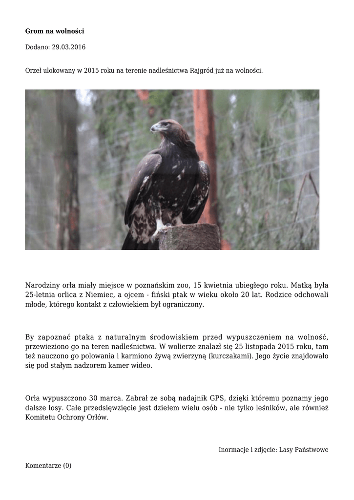 Grom na wolności Dodano: 29.03.2016 Orzeł ulokowany w 2015 roku na terenie nadleśnictwa Rajgród już na wolności. Narodziny orła miały miejsce w poznańskim zoo, 15 kwietnia ubiegłego roku. Matką była 25-letnia orlica z Niemiec, a ojcem - fiński ptak w wieku około 20 lat. Rodzice odchowali młode, którego kontakt z człowiekiem był ograniczony. By zapoznać ptaka z naturalnym środowiskiem przed wypuszczeniem na wolność, przewieziono go na teren nadleśnictwa. W wolierze znalazł się 25 listopada 2015 roku, tam też nauczono go polowania i karmiono żywą zwierzyną (kurczakami). Jego życie znajdowało się pod stałym nadzorem kamer wideo. Orła wypuszczono 30 marca. Zabrał ze sobą nadajnik GPS, dzięki któremu poznamy jego dalsze losy. Całe przedsięwzięcie jest dziełem wielu osób - nie tylko leśników, ale również Komitetu Ochrony Orłów. Inormacje i zdjęcie: Lasy Państwowe Komentarze (0) Nie dodano jeszcze żadnego komentarza.