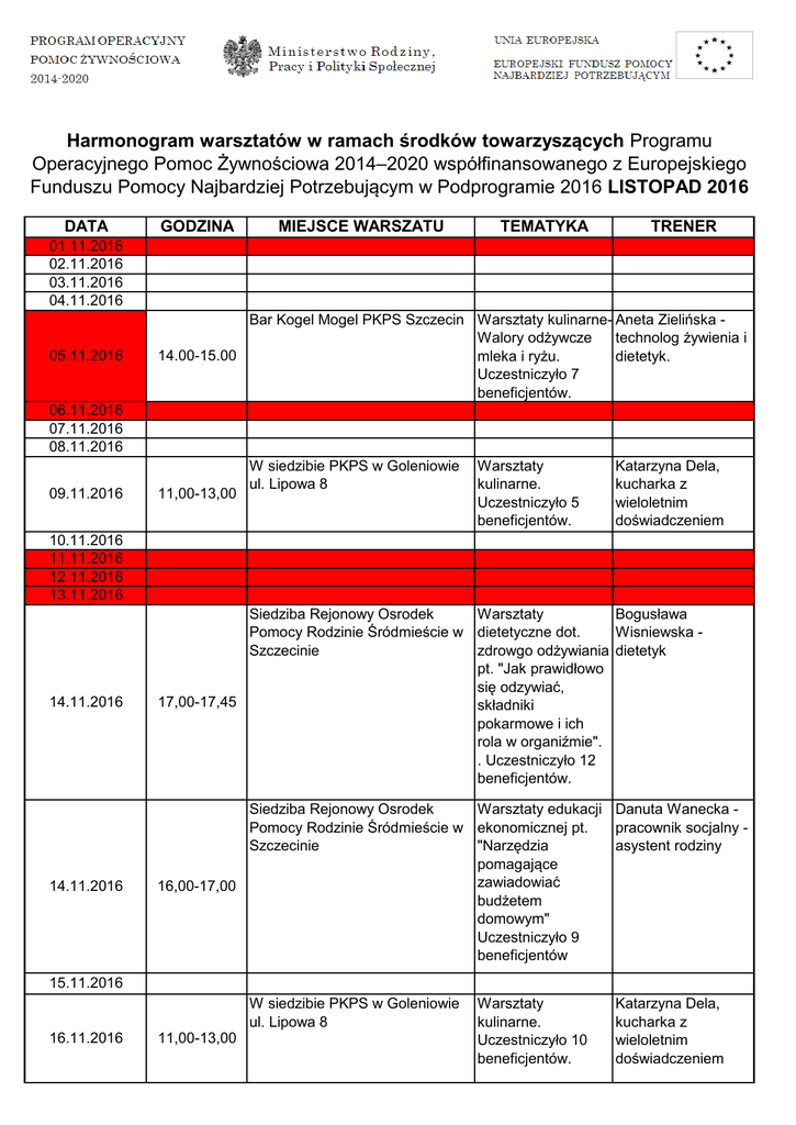 Harmonogram warsztatów w ramach środków towarzyszących Programu Operacyjnego Pomoc Żywnościowa 2014–2020 współfinansowanego z Europejskiego Funduszu Pomocy Najbardziej Potrzebującym w Podprogramie 2016 LISTOPAD 2016 DATA GODZINA MIEJSCE WARSZATU TEMATYKA TRENER 01.11.2016 02.11.2016 03.11.2016 04.11.2016 05.11.2016 Bar Kogel Mogel PKPS Szczecin Warsztaty kulinarne- Aneta Zielińska Walory odżywcze technolog żywienia i 14.00-15.00 mleka i ryżu. dietetyk. Uczestniczyło 7 beneficjentów. 06.11.2016 07.11.2016 08.11.2016 09.11.2016 11,00-13,00 W siedzibie PKPS w Goleniowie ul. Lipowa 8 Warsztaty kulinarne. Uczestniczyło 5 beneficjentów. Katarzyna Dela, kucharka z wieloletnim doświadczeniem 10.11.2016 11.11.2016 12.11.2016 13.11.2016 14.11.2016 Siedziba Rejonowy Osrodek Warsztaty Bogusława Pomocy Rodzinie Śródmieście w dietetyczne dot. Wisniewska Szczecinie zdrowgo odżywiania dietetyk pt. "Jak prawidłowo się odzywiać, 17,00-17,45 składniki pokarmowe i ich rola w organiźmie". . Uczestniczyło 12 beneficjentów. 14.11.2016 Siedziba Rejonowy Osrodek Warsztaty edukacji Danuta Wanecka Pomocy Rodzinie Śródmieście w ekonomicznej pt. pracownik socjalny Szczecinie "Narzędzia asystent rodziny pomagające zawiadowiać 16,00-17,00 budżetem domowym" Uczestniczyło 9 beneficjentów 15.11.2016 W siedzibie PKPS w Goleniowie ul. Lipowa 8 16.11.2016 11,00-13,00 Warsztaty kulinarne. Uczestniczyło 10 beneficjentów. Katarzyna Dela, kucharka z wieloletnim doświadczeniem 17.11.2016 Siedziba PKPS w Myśliborzu ul. Łużycka 4 Warsztaty dietetyczne dot. zdrowgo odżywiania. Uczestniczyło 40 beneficjentów. Zofia Jakubiszyn W siedzibie PKPS w Goleniowie ul. Lipowa 8 Warsztaty kulinarne. Uczestniczyło 10 beneficjentów. Katarzyna Dela, kucharka z wieloletnim doświadczeniem W siedziebie OPS Barlinek ul. Strzelecka 29 Warsztay edukacji ekonomicznej pt."Tworzymy budżet rodzinny". Uczestniuczyło 10 beneficjentów. Karolina Kulak dietetyk 9,00-9,30 18.11.2016 19.11.2016 20.11.2016 21.11.2016 22.11.2016 23.11.2016 24.11.2016 10,00-12,00 10,00-11,30 25.11.2016 26.11.2016 27.11.2016 28.11.2016 29.11.2016 30.11.2016 Program Operacyjny Pomoc Żywnościowa 2014-2020 jest współfinansowany ze środków Unii Europejskiej w ramach Europejskiego Funduszu Pomocy Najbardziej Potrzebującym