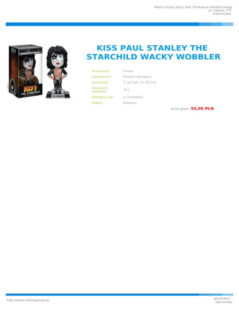Aliens Group Jerzy Stec Produkcja-Handel-Usługi ul. Lipowa 17C Inowrocław KISS PAUL STANLEY THE STARCHILD WACKY WOBBLER Producent: Funko Dostępność: Produkt dostępny Wysokość: 7 cali (ok. 17,78 cm) Kategoria wiekowa: 14+ Dostępny od*: w sprzedaży Status: Nowości price gross: http://www.aliensgroup.eu 55,00 PLN generator: aptusshop