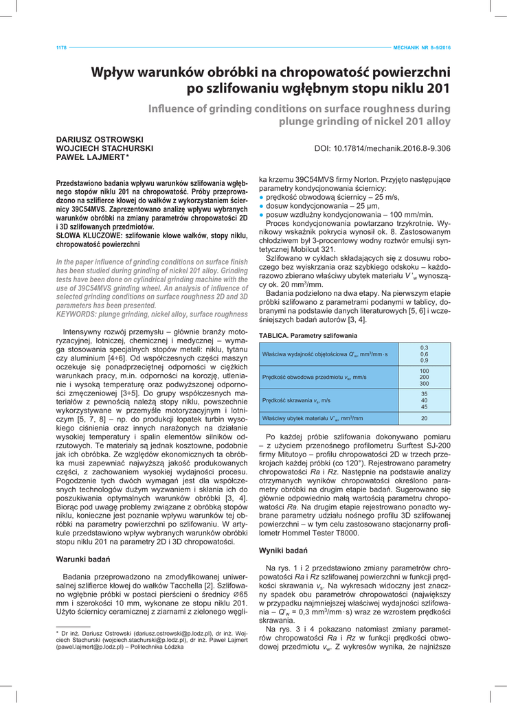1178 MECHANIK NR 8–9/2016 Wpływ warunków obróbki na chropowatość powierzchni po szlifowaniu wgłębnym stopu niklu 201 Influence of grinding conditions on surface roughness during plunge grinding of nickel 201 alloy DARIUSZ OSTROWSKI WOJCIECH STACHURSKI PAWEŁ LAJMERT * Przedstawiono badania wpływu warunków szlifowania wgłębnego stopów niklu 201 na chropowatość. Próby przeprowadzono na szlifierce kłowej do wałków z wykorzystaniem ściernicy 39C54MVS. Zaprezentowano analizę wpływu wybranych warunków obróbki na zmiany parametrów chropowatości 2D i 3D szlifowanych przedmiotów. SŁOWA KLUCZOWE: szlifowanie kłowe wałków, stopy niklu, chropowatość powierzchni In the paper influence of grinding conditions on surface finish has been studied during grinding of nickel 201 alloy. Grinding tests have been done on cylindrical grinding machine with the use of 39C54MVS grinding wheel. An analysis of influence of selected grinding conditions on surface roughness 2D and 3D parameters has been presented. KEYWORDS: plunge grinding, nickel alloy, surface roughness Intensywny rozwój przemysłu – głównie branży motoryzacyjnej, lotniczej, chemicznej i medycznej – wymaga stosowania specjalnych stopów metali: niklu, tytanu czy aluminium [4÷6]. Od współczesnych części maszyn oczekuje się ponadprzeciętnej odporności w ciężkich warunkach pracy, m.in. odporności na korozję, utlenianie i wysoką temperaturę oraz podwyższonej odporności zmęczeniowej [3÷5]. Do grupy współczesnych materiałów z pewnością należą stopy niklu, powszechnie wykorzystywane w przemyśle motoryzacyjnym i lotniczym [5, 7, 8] – np. do produkcji łopatek turbin wysokiego ciśnienia oraz innych narażonych na działanie wysokiej temperatury i spalin elementów silników odrzutowych. Te materiały są jednak kosztowne, podobnie jak ich obróbka. Ze względów ekonomicznych ta obróbka musi zapewniać najwyższą jakość produkowanych części, z zachowaniem wysokiej wydajności procesu. Pogodzenie tych dwóch wymagań jest dla współczesnych technologów dużym wyzwaniem i skłania ich do poszukiwania optymalnych warunków obróbki [3, 4]. Biorąc pod uwagę problemy związane z obróbką stopów niklu, konieczne jest poznanie wpływu warunków tej obróbki na parametry powierzchni po szlifowaniu. W artykule przedstawiono wpływ wybranych warunków obróbki stopu niklu 201 na parametry 2D i 3D chropowatości. Warunki badań Badania przeprowadzono na zmodyfikowanej uniwersalnej szlifierce kłowej do wałków Tacchella [2]. Szlifowano wgłębnie próbki w postaci pierścieni o średnicy ⌀65 mm i szerokości 10 mm, wykonane ze stopu niklu 201. Użyto ściernicy ceramicznej z ziarnami z zielonego węgli* Dr inż. Dariusz Ostrowski ([email protected]), dr inż. Wojciech Stachurski ([email protected]), dr inż. Paweł Lajmert ([email protected]) – Politechnika Łódzka DOI: 10.17814/mechanik.2016.8-9.306 ka krzemu 39C54MVS firmy Norton. Przyjęto następujące parametry kondycjonowania ściernicy: ● prędkość obwodową ściernicy – 25 m/s, ● dosuw kondycjonowania – 25 µm, ● posuw wzdłużny kondycjonowania – 100 mm/min. Proces kondycjonowania powtarzano trzykrotnie. Wynikowy wskaźnik pokrycia wynosił ok. 8. Zastosowanym chłodziwem był 3-procentowy wodny roztwór emulsji syntetycznej Mobilcut 321. Szlifowano w cyklach składających się z dosuwu roboczego bez wyiskrzania oraz szybkiego odskoku – każdorazowo zbierano właściwy ubytek materiału V ’w wynoszący ok. 20 mm3/mm. Badania podzielono na dwa etapy. Na pierwszym etapie próbki szlifowano z parametrami podanymi w tablicy, dobranymi na podstawie danych literaturowych [5, 6] i wcześniejszych badań autorów [3, 4]. TABLICA. Parametry szlifowania Właściwa wydajność objętościowa Q’w, mm3/mm ⋅ s 0,3 0,6 0,9 Prędkość obwodowa przedmiotu vw, mm/s 100 200 300 Prędkość skrawania vs, m/s 35 40 45 Właściwy ubytek materiału V ’w, mm3/mm 20 Po każdej próbie szlifowania dokonywano pomiaru – z użyciem przenośnego profilometru Surftest SJ-200 firmy Mitutoyo – profilu chropowatości 2D w trzech przekrojach każdej próbki (co 120°). Rejestrowano parametry chropowatości Ra i Rz. Następnie na podstawie analizy otrzymanych wyników chropowatości określono parametry obróbki na drugim etapie badań. Sugerowano się głównie odpowiednio małą wartością parametru chropowatości Ra. Na drugim etapie rejestrowano ponadto wybrane parametry udziału nośnego profilu 3D szlifowanej powierzchni – w tym celu zastosowano stacjonarny profilometr Hommel Tester T8000. Wyniki badań Na rys. 1 i 2 przedstawiono zmiany parametrów chropowatości Ra i Rz szlifowanej powierzchni w funkcji prędkości skrawania vs. Na wykresach widoczny jest znaczny spadek obu parametrów chropowatości (największy w przypadku najmniejszej właściwej wydajności szlifowania – Q’w = 0,3 mm3/mm ∙ s) wraz ze wzrostem prędkości skrawania. Na rys. 3 i 4 pokazano natomiast zmiany parametrów chropowatości Ra i Rz w funkcji prędkości obwodowej przedmiotu vw. Z wykresów wynika, że najniższe MECHANIK NR 8–9/2016 1179 Rys. 1. Zmiany parametru chropowatości Ra w funkcji prędkości skrawania vs (vw = 200 mm/s) Rys. 4. Zmiany parametru chropowatości Rz w funkcji prędkości obwodowej przedmiotu vw (vs = 45 m/s) Rys. 2. Zmiany parametru chropowatości Rz w funkcji prędkości skrawania vs (vw = 200 mm/s) Rys. 5. Zmiany parametrów stereometrii 3D szlifowanej powierzchni w funkcji prędkości skrawania vs (vw = 200 mm/s, Q’w = 0,3 mm3/mm⋅s) parametry chropowatości uzyskano dla prędkości obwodowej przedmiotu vw = 200 mm/s. W przypadku niskich prędkości obwodowych zaobserwowano wzrost obu parametrów chropowatości, co można wytłumaczyć pracą w strefie uszkodzeń cieplnych obrabianego przedmiotu. W przypadku wysokich prędkości obwodowych – rzędu 300 mm/s – wzrost parametrów chropowatości można 