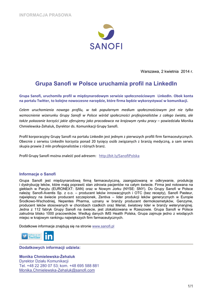 INFORMACJA PRASOWA Warszawa, 2 kwietnia 2014 r. Grupa Sanofi w Polsce uruchamia profil na LinkedIn Grupa Sanofi, uruchomiła profil w międzynarodowym serwisie społecznościowym LinkedIn. Obok konta na portalu Twitter, to kolejne nowoczesne narzędzie, które firma będzie wykorzystywać w komunikacji. Celem uruchomienia nowego profilu, w tak popularnym medium społecznościowym jest nie tylko wzmocnienie wizerunku Grupy Sanofi w Polsce wśród społeczności profesjonalistów z całego świata, ale także pokazanie korzyści jakie oferujemy jako pracodawca na krajowym rynku pracy – powiedziała Monika Chmielewska-Żehaluk, Dyrektor ds. Komunikacji Grupy Sanofi. Profil korporacyjny Grupy Sanofi na portalu Linkedin jest jednym z pierwszych profili firm farmaceutycznych. Obecnie z serwisu LinkedIn korzysta ponad 20 tysięcy osób związanych z branżą medyczną, a sam serwis skupia prawie 2 mln profesjonalistów z różnych branż. Profil Grupy Sanofi można znaleźć pod adresem: http://bit.ly/SanofiPolska Informacje o Sanofi Grupa Sanofi jest międzynarodową firmą farmaceutyczną, zaangażowaną w odkrywanie, produkcję i dystrybucję leków, które mają poprawić stan zdrowia pacjentów na całym świecie. Firma jest notowana na giełdach w Paryżu (EURONEXT: SAN) oraz w Nowym Jorku (NYSE: SNY). Do Grupy Sanofi w Polsce należą: Sanofi-Aventis Sp. z o.o. – producent leków innowacyjnych i OTC (bez recepty), Sanofi Pasteur, największy na świecie producent szczepionek, Zentiva – lider produkcji leków generycznych w Europie Środkowo-Wschodniej, Nepentes Pharma, uznany w branży producent dermokosmetyków, Genzyme, producent leków stosowanych w chorobach rzadkich oraz Merial, światowy lider w branży weterynaryjnej. Jedna z 112 fabryk Grupy Sanofi na świecie, jest zlokalizowana w Rzeszowie. Grupa Sanofi w Polsce zatrudnia blisko 1000 pracowników. Według danych IMS Health Polska, Grupa zajmuje jedno z wiodących miejsc w krajowym rankingu największych firm farmaceutycznych. Dodatkowe informacje znajdują się na stronie www.sanofi.pl Dodatkowych informacji udziela: Monika Chmielewska-Żehaluk Dyrektor Działu Komunikacji Tel. +48 22 280 07 53; kom. +48 695 588 881 [email protected] 1/1