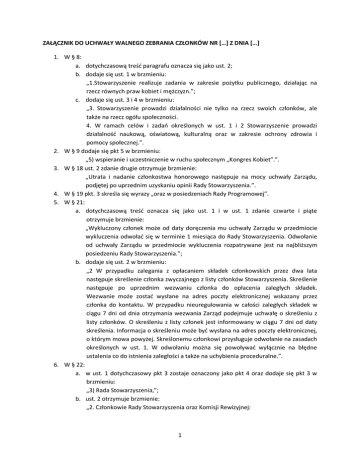 ZAŁĄCZNIK DO UCHWAŁY WALNEGO ZEBRANIA CZŁONKÓW NR […] Z DNIA […] 1. W § 8: a. dotychczasową treść paragrafu oznacza się jako ust. 2; b. dodaje się ust. 1 w brzmieniu: „1.Stowarzyszenie realizuje zadania w zakresie pożytku publicznego, działając na rzecz równych praw kobiet i mężczyzn.”; c. dodaje się ust. 3 i 4 w brzmieniu: „3. Stowarzyszenie prowadzi działalności nie tylko na rzecz swoich członków, ale także na rzecz ogółu społeczności. 4. W ramach celów i zadań określonych w ust. 1 i 2 Stowarzyszenie prowadzi działalność naukową, oświatową, kulturalną oraz w zakresie ochrony zdrowia i pomocy społecznej.”. 2. W § 9 dodaje się pkt 5 w brzmieniu: „5) wspieranie i uczestniczenie w ruchu społecznym „Kongres Kobiet”.”. 3. W § 18 ust. 2 zdanie drugie otrzymuje brzmienie: „Utrata i nadanie członkostwa honorowego następuje na mocy uchwały Zarządu, podjętej po uprzednim uzyskaniu opinii Rady Stowarzyszenia.”. 4. W § 19 pkt. 3 skreśla się wyrazy „oraz w posiedzeniach Rady Programowej”. 5. W § 21: a. dotychczasową treść oznacza się jako ust. 1 i w ust. 1 zdanie czwarte i piąte otrzymuje brzmienie: „Wykluczony członek może od daty doręczenia mu uchwały Zarządu w przedmiocie wykluczenia odwołać się w terminie 1 miesiąca do Rady Stowarzyszenia. Odwołanie od uchwały Zarządu w przedmiocie wykluczenia rozpatrywane jest na najbliższym posiedzeniu Rady Stowarzyszenia.”; b. dodaje się ust. 2 w brzmieniu: „2 W przypadku zalegania z opłacaniem składek członkowskich przez dwa lata następuje skreślenie członka zwyczajnego z listy członków Stowarzyszenia. Skreślenie następuje po uprzednim wezwaniu członka do opłacenia zaległych składek. Wezwanie może zostać wysłane na adres poczty elektronicznej wskazany przez członka do kontaktu. W przypadku nieuregulowania w całości zaległych składek w ciągu 7 dni od dnia otrzymania wezwania Zarząd podejmuje uchwałę o skreśleniu z listy członków. O skreśleniu z listy członek jest informowany w ciągu 7 dni od daty skreślenia. Informacja o skreśleniu może być wysłana na adres poczty elektronicznej, o którym mowa powyżej. Skreślonemu członkowi przysługuje odwołanie na zasadach określonych w ust. 1. W odwołaniu można się powoływać wyłącznie na błędne ustalenia co do istnienia zaległości a także na uchybienia proceduralne.”. 6. W § 22: a. w ust. 1 dotychczasowy pkt 3 zostaje oznaczony jako pkt 4 oraz dodaje się pkt 3 w brzmieniu: „3) Rada Stowarzyszenia,”; b. ust. 2 otrzymuje brzmienie: „2. Członkowie Rady Stowarzyszenia oraz Komisji Rewizyjnej: 1 7. 8. 9. 10. 1) nie mogą być członkami Zarządu ani pozostawać z nimi w związku małżeńskim, we wspólnym pożyciu, w stosunku pokrewieństwa, powinowactwa lub podległości służbowej, 2) nie byli skazani prawomocnym wyrokiem za przestępstwo umyślne ścigane z oskarżenia publicznego lub przestępstwo skarbowe.”; c. w ust. 3 wyraz „Zarządu” zastępuje się wyrazami „Rady Stowarzyszenia” (trzykrotnie) oraz dodaje na końcu pierwszego zdania, po wyrazie „Rewizyjnej” wyrazy „, z zastrzeżeniem ust. 4.”; d. dodaje się ust. 4 i 5 w brzmieniu: „4. W wyniku uzupełnienia składu Rady Stowarzyszenia zgodnie z ust. 3, liczba członków Rady nie może przekroczyć liczby członków powołanych do Rady przez Walne Zebranie Członków przed uzupełnieniem. 5. W przypadku gdy członek organu Stowarzyszenia zostanie powołany do drugiego organu Stowarzyszenia, mandat członka w tym pierwszym organie wygasa w momencie powołania do drugiego organu.”. W § 24: a. dotychczasową treść oznacza się jako ust. 1 i dodaje się na końcu po wyrazie „społecznie” wyrazy „, z zastrzeżeniem ust. 2”; b. dodaje się ust. 2 w brzmieniu: „2. Rada Stowarzyszenia może w uzasadnionych przypadkach, w szczególności w sytuacji o której mowa w § 48 ust. 2, wyrazić zgodę na wypłatę wynagrodzenia lub zwrot kosztów wszystkim lub niektórym członkom Zarządu a także określić formę ich zatrudnienia.”. W § 27: a. pkt 1 i 2 otrzymują brzmienie: „1) rozpatrzenie i zatwierdzenie sprawozdania Zarządu z działalności Stowarzyszenia za ubiegły rok obrotowy a także sprawozdań Rady Stowarzyszenia oraz Komisji Rewizyjnej, 2) rozpatrzenie i zatwierdzenie sprawozdania finansowego Stowarzyszenia za ubiegły rok obrotowy oraz innych sprawozdań przewidzianych w przepisach prawa,”; b. skreśla się pkt 5; c. dotychczasowe pkt 6-8 oznacza się odpowiednio jako pkt 5-7 oraz zastępuje się wyrazy „Zarządu” wyrazami „Rady Stowarzyszenia” (dwukrotnie) a także dodaje się w pkt 5 przed wyrazem „oraz” wyrazy „, Przewodniczącego Rady Stowarzyszenia”. W § 29 ust. 2: a. pkt 1 otrzymuje brzmienie: „1) rozpatrzenie i zatwierdzenie sprawozdania Zarządu z działalności Stowarzyszenia za ubiegły rok obrotowy a także sprawozdań Rady Stowarzyszenia oraz Komisji Rewizyjnej,”; b. w pkt 3 wyrazy „Zarządu” zastępuje się wyrazami „Rady Stowarzyszenia”. W § 30: a. ust. 2 otrzymuje brzmienie: „2. Nadzwyczajne Walne Zebranie Członków zwołuje Zarząd z własnej inicjatywy, na wniosek Rady Stowarzyszenia lub Komisji Rewizyjnej albo na wniosek co najmniej 10% (dziesięć procent) członków zwyczajnych Stowarzyszenia.”; 2 11. 12. 13. 14. 15. 16. 17. b. w ust. 3 wyrazy „Komisji Rewizyjnej” zastępuje się wyrazami „Radzie Stowarzyszenia”. W § 32 ust. 2 otrzymuje brzmienie: „2. Walne Zebranie Członków rozpatruje sprawy uwzględnione w porządku obrad. Członkowie Stowarzyszenia reprezentujący co najmniej 5% ogółu członków Stowarzyszenia mają prawo zgłosić sprawę do porządku obrad wraz z załączonym projektem uchwały lub projekt zmiany treści uchwały przewidzianej w porządku obrad najpóźniej na 14 dni przed terminem zwołania Walnego Zebrania Członków. Zarząd może dopuścić z ważnych powodów nowe