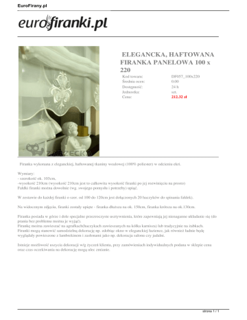 EuroFirany.pl ELEGANCKA, HAFTOWANA FIRANKA PANELOWA 100 x 220 Kod towaru: Średnia ocen: Dostępność: Jednostka: Cena: DF057_100x220 0.00 24 h szt. 212.32 zł Firanka wykonana z eleganckiej, haftowanej tkaniny woalowej (100% poliester) w odcieniu ekri. Wymiary: - szerokość ok. 103cm, -wysokość 210cm (wysokość 210cm jest to całkowita wysokość firanki po jej rozwinięciu na prosto) Fałdki firanki można dowolnie (wg. swojego pomysłu i potrzeby) upiąć. W zestawie do każdej firanki o szer. od 100 do 120cm jest dołączonych 20 haczyków do spinania fałdek). Na widocznym zdjęciu, firanki zostały upięte - firanka dłuższa na ok. 150cm, firanka krótsza na ok.130cm. Firanka posiada w górze i dole specjalne przezroczyste usztywnienia, które zapewniają jej nienaganne układanie się (do prania bez problemu można je wyjąć). Firankę można zawieszać na agrafkach(haczykach zawieszanych na kółka karnisza) lub tradycyjnie na żabkach. Firanki mogą stanowić samodzielną dekorację np. zdobiąc okno w eleganckiej łazience, jak również ładnie będę wyglądały powieszone z lambrekinem i zasłonami jako np. dekoracja salonu czy jadalni. Istnieje możliwość uszycia dekoracji w/g życzeń klienta, przy zamówieniach indywidualnych podana w sklepie cena oraz czas oczekiwania na dekorację mogą ulec zmianie. strona 1 / 1 Powered by TCPDF (www.tcpdf.org)