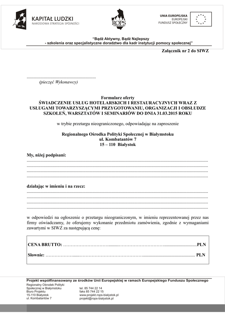 Załącznik nr 2 do SIWZ ............................................................. (pieczęć Wykonawcy) Formularz oferty ŚWIADCZENIE USŁUG HOTELARSKICH I RESTAURACYJNYCH WRAZ Z USŁUGAMI TOWARZYSZĄCYMI PRZYGOTOWANIU, ORGANIZACJI I OBSŁUDZE SZKOLEŃ, WARSZTATÓW I SEMINARIÓW DO DNIA 31.03.2015 ROKU w trybie przetargu nieograniczonego, odpowiadając na zaproszenie Regionalnego Ośrodka Polityki Społecznej w Białymstoku ul. Kombatantów 7 15 – 110 Białystok My, niżej podpisani: ................................................................................................................................................................ ................................................................................................................................................................ ................................................................................................................................................................ ................................................................................................................................................................ działając w imieniu i na rzecz: ................................................................................................................................................................ ................................................................................................................................................................ ................................................................................................................................................................ ................................................................................................................................................................ w odpowiedzi na ogłoszenie o przetargu nieograniczonym, w imieniu reprezentowanej przez nas firmy oświadczamy, że oferujemy wykonanie przedmiotu zamówienia, zgodnie z wymaganiami zawartymi w SIWZ za następującą cenę: CENA BRUTTO: ………………………….........………………………….............................PLN Słownie: ………………......…………………………………….............................................. PLN ZAKRES ZAMÓWIENIA LICZBA USŁUG JEDNOSTKOWA CENA BRUTTO I. Szkolenia A. Szkolenia jednodniowe pierwszy poczęstunek kawowy drugi poczęstunek kawowy obiad Szkolenia jednostkowe, 84 Szkolenia jednostkowe 84 Szkolenia jednostkowe, 84 sala szkoleniowa Szkolenia jednostkowe, 4 Szkolenia jednostkowe, SUMA B. Szkolenia dwudniowe pierwszy poczęstunek kawowy drugi poczęstunek kawowy Szkolenia jednostkowe, dla pup i ops; Osoby niepełnosprawne, Szkolenia jednostkowe, dla pup i ops; Osoby niepełnosprawne, 756 obiad Szkolenia jednostkowe, dla pup i ops; Osoby niepełnosprawne, Szkolenia jednostkowe, dla pup i ops; Osoby niepełnosprawne, Szkolenia jednostkowe, dla pup i ops; Osoby niepełnosprawne, Szkolenia jednostkowe, dla pup i ops; Osoby niepełnosprawne, Szkolenia jednostkowe, dla pup i ops; Osoby niepełnosprawne, Szkolenia jednostkowe, dla pup i ops; Osoby niepełnosprawne, 756 śniadanie kolacja pokój jednoosobowy pokój dwuosobowy sala szkoleniowa 756 234 234 54 90 36 Szkolenia jednostkowe, SUMA dla pup i ops; Osoby niepełnosprawne, C. Szkolenia trzydniowe pierwszy poczęstunek kawowy drugi poczęstunek kawowy Szkolenia jednostkowe; Osoby niepełnosprawne, 315 Szkolenia jednostkowe; Osoby niepełnosprawne, 315 obiad Szkolenia jednostkowe; Osoby niepełnosprawne, 315 śniadanie Szkolenia jednostkowe; Osoby niepełnosprawne, Szkolenia jednostkowe; 130 kolacja 130 CENA BRUTTO ŁĄCZNIE pokój jednoosobowy Osoby niepełnosprawne, Szkolenia jednostkowe; Osoby niepełnosprawne, 30 pokój dwuosobowy Szkolenia jednostkowe; Osoby niepełnosprawne, 50 sala szkoleniowa Szkolenia jednostkowe; Osoby niepełnosprawne, 15 Szkolenia jednostkowe; SUMA Osoby niepełnosprawne, II. Szkolenia/kursy specjalistyczne A. Szkolenia/kursy specjalistyczne dwudniowe pierwszy 592 poczęstunek kawowy drugi poczęstunek kawowy 592 obiad śniadanie kolacja pokój jednoosobowy 592 188 188 48 pokój dwuosobowy 70 sala szkoleniowa 32 SUMA B. Szkolenia/kursy specjalistyczne trzydniowe 948 pierwszy poczęstunek kawowy drugi poczęstunek kawowy obiad 948 948 śniadanie 396 kolacja 396 pokój jednoosobowy pokój dwuosobowy sala szkoleniowa 96 150 48 SUMA C. Szkolenia/kursy specjalistyczne czterodniowe 440 pierwszy poczęstunek kawowy drugi poczęstunek kawowy 440 obiad śniadanie kolacja pokój jednoosobowy 440 210 210 54 pokój dwuosobowy 78 sala szkoleniowa 24 SUMA III. Seminarium, spotkanie A. Seminaria/spotkanie jednodniowe pierwszy poczęstunek kawowy PWD DP ES WPRES drugi poczęstunek kawowy PWD DP ES WPRES obiad (bufet szwedzki) PWD DP ES WPRES sala seminaryjna PWD DP ES WPRES 70 140 50 20 70 140 50 20 70 140 50 20 1 2 1 1 PWD DP SUMA ES WPRES Razem I (A+B+C+D) + II (A+B) + III (A+B) Hotel, w którym zostaną świadczone usługi (nazwa hotelu, dokładny adres): …............................................................................................................................................................ …............................................................................................................................................................ …............................................................................................................................................................ ................................................................................................................................................................ Oświadczamy, że w cenie oferty zostały uwzględnione wszystkie koszty wykonania zamówienia i realizacji przyszłego świadczenia umownego. Oświadczamy, że zapoznaliśmy się z udostępnioną przez zamawiającego Specyfikacją Istotnych Warunków Zamówienia i nie wnosimy do niej żadn