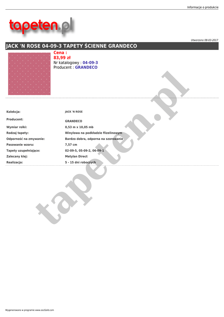 Informacje o produkcie Utworzono 08-03-2017 JACK 'N ROSE 04-09-3 TAPETY ŚCIENNE GRANDECO Cena : 83,99 zł Kolekcja: JACK 'N ROSE Producent: Rodzaj tapety: pe te n Wymiar rolki: GRANDECO .p l Nr katalogowy : 04-09-3 Producent : GRANDECO 0,53 m x 10,05 mb Winylowa na podkładzie flizelinowym Odporność na zmywanie: Bardzo dobra, odporna na szorowanie Pasowanie wzoru: 7,57 cm Tapety uzupełniające: Zalecany klej: Metylan Direct 5 - 15 dni roboczych ta Realizacja: 02-09-5, 05-09-2, 06-09-1 Wygenerowano w programie www.oscGold.com