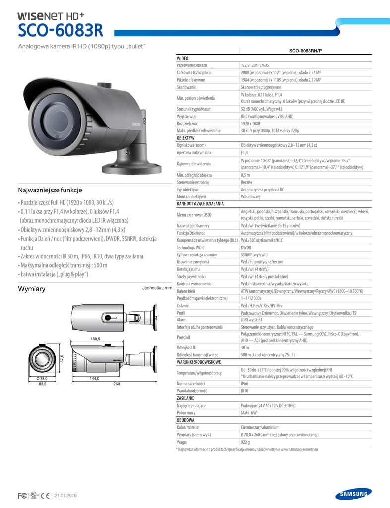 SCO-6083R Analogowa kamera IR HD (1080p) typu „bullet” SCO-6083RN/P Wideo Przetwornik obrazu Całkowita liczba pikseli Piksele efektywne Skanowanie Min. poziom oświetlenia Stosunek sygnał/szum Wyjście wizji Rozdzielczość Maks. prędkość odświeżania Obiektyw Ogniskowa (zoom) Apertura maksymalna Kątowe pole widzenia Najważniejsze funkcje • Rozdzielczość Full HD (1920 x 1080, 30 kl./s) • 0,11 luksa przy F1,4 (w kolorze), 0 luksów F1,4 (obraz monochromatyczny: dioda LED IR włączona) • Obiektyw zmiennoogniskowy 2,8–12 mm (4,3 x) • Funkcja Dzień / noc (filtr podczerwieni), DWDR, SSNRIV, detekcja ruchu • Zakres widoczności IR 30 m, IP66, IK10, dwa typy zasilania • Maksymalna odległość transmisji: 500 m • Łatwa instalacja („plug & play”) Min. odległość obiektu Sterowanie ostrością Typ obiektywu Montaż obiektywu Dane dotyczące działania Menu ekranowe (OSD) Nazwa (opis) kamery Funkcja Dzień/noc Kompensacja oświetlenia tylnego (BLC) Technologia WDR Cyfrowa redukcja szumów Usuwanie zamglenia Detekcja ruchu Strefy prywatności Kontrola wzmocnienia Jednostka: mm Balans bieli Prędkość migawki elektronicznej Cofanie Profil Alarm Interfejs zdalnego sterowania Wymiary 160.5 160,5(6.32") Protokół 87.0 (3.43") 87,0 Odległość IR Odległość transmisji wideo Warunki środowiskowe Temperatura/wilgotność pracy Ø80.0 (3.15") Ø 78,0 144.0 (5.67") 144,0 83.2 (3.28") 83,2 259.8260 (10.23") Norma szczelności Wandaloodporność Zasilanie Napięcie zasilające Pobór mocy Obudowa Kolor/materiał Wymiary (szer. x wys.) Waga 1/2,9" 2 MP CMOS 2000 (w poziomie) x 1121 (w pionie), około 2,24 MP 1984 (w poziomie) x 1105 (w pionie), około 2,19 MP Skanowanie progresywne W kolorze: 0,11 luksa, F1,4 Obraz monochromatyczny: 0 luksów (przy włączonej diodzie LED IR) 52 dB (AGC wył., Waga wł.) BNC (konfigurowalne: CVBS, AHD) 1920 x 1080 30 kl./s przy 1080p, 30 kl./s przy 720p Obiektyw zmiennoogniskowy 2,8–12 mm (4,3 x) F1,4 W poziomie: 103,8° (panorama)–32,4° (teleobiektyw)/w pionie: 53,7° (panorama)–18,4° (teleobiektyw) G: 121,9° (panorama)–37,1° (teleobiektyw) 0,5 m Ręczne Automatyczna przysłona DC Wbudowany Angielski, japoński, hiszpański, francuski, portugalski, koreański, niemiecki, włoski, rosyjski, polski, czeski, rumuński, serbski, szwedzki, duński, turecki Wył./wł. (wyświetlanie do 15 znaków) Automatyczna (filtr podczerwieni)/w kolorze/obraz monochromatyczny Wył./BLC użytkownika/HLC DWDR SSNRIV (wył./wł.) Wył./automatyczne/ręczne Wył./wł. (4 strefy) Wył./wł. (4 strefy prostokątne) Wył./niska/średnia/wysoka/bardzo wysoka ATW (automatyczny)/Zewnętrzny/Wewnętrzny/Ręczny/AWC (1800–10 500°K) 1–1/12 000 s Wył./H-Rev/V-Rev/HV-Rev Podstawowy, Dzień/noc, Oświetlenie tylne, Wewnętrzny, Użytkownika, ITS (DR) wyjście 1 Sterowanie przy użyciu kabla koncentrycznego Połączenie koncentryczne: NTSC/PAL — Samsung CCVC, Pelco-C (Coaxitron), AHD — ACP (protokół koncentryczny AHD) 30 m 500 m (kabel koncentryczny 75–5) Od -30 do +55°C / poniżej 90% wilgotności względnej (RH) *Uruchamianie należy przeprowadzać w temperaturze wyższej niż -10°C IP66 IK10 Podwójne (24 V AC i 12 V DC ±10%) Maks. 6 W Ciemnoszary/aluminium Ø 78,0 x 260,0 mm (bez osłony przeciwsłonecznej) 922 g * Najnowsze informacje o produktach/specyfikacje można znaleźć w witrynie www.samsung-security.eu 21.01.2016