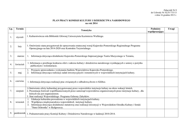 Załącznik Nr 8 do Uchwały Nr XLIV/733/13 z dnia 16 grudnia 2013 r. PLAN PRACY KOMISJI KULTURY I DZIEDZICTWA NARODOWEGO na rok 2014 Lp. Termin 1. styczeń 2. luty 1. Omówienie stanu przygotowań do opracowania ostatecznej wersji Kujawsko-Pomorskiego Regionalnego Programu Operacyjnego na lata 2014-2020 oraz Kontraktu Terytorialnego. 3. marzec 1. Informacja dotycząca działalności Kujawsko-Pomorskiego Impresaryjnego Teatru Muzycznego w Toruniu, 4. kwiecień 5. maj 6. czerwiec 7. sierpień 8. wrzesień Tematyka 1. Kulturotwórcza rola Biblioteki Głównej Uniwersytetu Kazimierza Wielkiego. 1. Informacja o przebiegu konkursu ofert z zakresu kultury i dziedzictwa narodowego wynikających z ustawy o pożytku publicznym i wolontariacie. 1. Przyjęcie sprawozdania z wykonania budżetu Województwa Kujawsko-Pomorskiego. 2. Informacja dotycząca realizacji zadań inwestycyjnych i remontowych w wojewódzkich instytucjach kultury. 1. Informacja dotycząca realizacji prac związanych z odbudową dworu w Kłóbce. 1.Omówienie oferty kulturalnej przygotowanej przez wojewódzkie instytucje kultury na okres wakacji letnich. 2. Prezentacja festiwali współfinansowanych przez samorząd województwa organizowanych przez instytucje kultury , dla których nie jest organizatorem. 3. Stan realizacji Wojewódzkiego Programu Ochrony Zabytków. 1. Edukacja kulturalna prowadzona w wojewódzkich instytucjach kultury. 2. Współpraca międzynarodowa wojewódzkich instytucji kultury. 3. Informacja dotycząca działalności statutowej oraz realizacji inwestycji w Wojewódzkim Ośrodku Kultury i Sztuki "Stara Ochronka" w Bydgoszczy. 9. październik 1. Podsumowanie pracy Komisji Kultury i Dziedzictwa Narodowego w kadencji 2010-2014. Podmioty współpracujące Uwagi