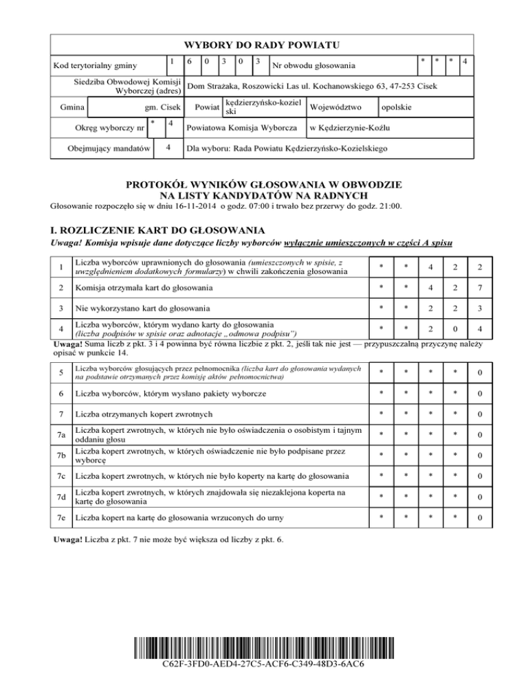 WYBORY DO RADY POWIATU Kod terytorialny gminy 1 6 0 3 0 3 * Nr obwodu głosowania * * 4 Siedziba Obwodowej Komisji Dom Strażaka, Roszowicki Las ul. Kochanowskiego 63, 47-253 Cisek Wyborczej (adres) kędzierzyńsko-koziel Gmina gm. Cisek Powiat Województwo opolskie ski * 4 Okręg wyborczy nr Powiatowa Komisja Wyborcza w Kędzierzynie-Koźlu Obejmujący mandatów 4 Dla wyboru: Rada Powiatu Kędzierzyńsko-Kozielskiego PROTOKÓŁ WYNIKÓW GŁOSOWANIA W OBWODZIE NA LISTY KANDYDATÓW NA RADNYCH Głosowanie rozpoczęło się w dniu 16-11-2014 o godz. 07:00 i trwało bez przerwy do godz. 21:00. I. ROZLICZENIE KART DO GŁOSOWANIA Uwaga! Komisja wpisuje dane dotyczące liczby wyborców wyłącznie umieszczonych w części A spisu 1 Liczba wyborców uprawnionych do głosowania (umieszczonych w spisie, z uwzględnieniem dodatkowych formularzy) w chwili zakończenia głosowania * * 4 2 2 2 Komisja otrzymała kart do głosowania * * 4 2 7 3 Nie wykorzystano kart do głosowania * * 2 2 3 Liczba wyborców, którym wydano karty do głosowania * * 2 0 4 (liczba podpisów w spisie oraz adnotacje „odmowa podpisu”) Uwaga! Suma liczb z pkt. 3 i 4 powinna być równa liczbie z pkt. 2, jeśli tak nie jest — przypuszczalną przyczynę należy opisać w punkcie 14. 4 5 Liczba wyborców głosujących przez pełnomocnika (liczba kart do głosowania wydanych na podstawie otrzymanych przez komisję aktów pełnomocnictwa) * * * * 0 6 Liczba wyborców, którym wysłano pakiety wyborcze * * * * 0 7 Liczba otrzymanych kopert zwrotnych * * * * 0 * * * * 0 * * * * 0 7a 7b Liczba kopert zwrotnych, w których nie było oświadczenia o osobistym i tajnym oddaniu głosu Liczba kopert zwrotnych, w których oświadczenie nie było podpisane przez wyborcę 7c Liczba kopert zwrotnych, w których nie było koperty na kartę do głosowania * * * * 0 7d Liczba kopert zwrotnych, w których znajdowała się niezaklejona koperta na kartę do głosowania * * * * 0 7e Liczba kopert na kartę do głosowania wrzuconych do urny * * * * 0 Uwaga! Liczba z pkt. 7 nie może być większa od liczby z pkt. 6. C62F-3FD0-AED4-27C5-ACF6-C349-48D3-6AC6 II. USTALENIE WYNIKÓW GŁOSOWANIA Komisja stwierdziła, że pieczęcie na urnie pozostały nienaruszone. Po wyjęciu kart z urny Komisja ustaliła na ich podstawie następujące wyniki głosowania: 8 Liczba kart wyjętych z urny 8a w tym liczba kart wyjętych z kopert na karty do głosowania Uwaga! 10 Liczba kart ważnych Liczba głosów ważnych oddanych łącznie na wszystkie listy kandydatów (z kart ważnych) Uwaga! 13. 2 0 4 * * * * 0 * * * * 0 * * 2 0 4 * * * 4 8 * * 1 5 6 Suma liczb z pkt. 9 i 10 musi być równa liczbie z pkt. 8. Jeśli w pkt. 9 liczba jest większa niż 0, przyczynę należy opisać w pkt. 16. 11 Liczba głosów nieważnych (z kart ważnych) 12 * Liczba z pkt. 8 pomniejszona o liczbę z pkt. 8a powinna być równa liczbie z pkt. 4. Dodatkowo liczba z pkt. 8a nie może być większa od liczby z pkt. 7e; jeśli tak nie jest — przypuszczalną przyczynę należy opisać w punkcie 15. Liczba kart nieważnych (innych niż urzędowo ustalone lub nieopatrzonych 9 pieczęcią obwodowej komisji wyborczej) Uwaga! * Suma liczb z pkt. 11 i 12 musi być równa liczbie z pkt. 10. Na poszczególne listy kandydatów i umieszczonych na nich kandydatów oddano następujące liczby głosów ważnych: Lista nr 3 — KW Prawo i Sprawiedliwość * Liczba głosów ważnych oddanych na listę: * * 2 5 * * * * * * * * * * * * * * * * * * * * * * * * 1 * * * * * * * 1 2 2 3 1 3 0 3 * * * 2 5 Na poszczególnych kandydatów z tej listy oddano następujące liczby głosów ważnych: 1. 2. 3. 4. 5. 6. 7. 8. PECZKIS Elżbieta Anna PROJZNER Jolanta Alina WIŚNIEWSKI Kamil Bogdan GRUND Małgorzata BERNAŚ Adam Andrzej KULESZA Justyna Jolanta WAŚKIEWICZ Krzysztof LECHICKI Paweł Razem Suma głosów oddanych na wszystkich kandydatów z danej listy (rubryka „Razem”) równa się liczbie Uwaga! głosów ważnych oddanych na tę listę. Wyjątek od tej zasady może dotyczyć listy, na której znajduje się nazwisko kandydata skreślonego z listy. Lista nr 4 — KW Platforma Obywatelska RP Liczba głosów ważnych oddanych na listę: * * * 1 3 * * * * * * 8 1 Na poszczególnych kandydatów z tej listy oddano następujące liczby głosów ważnych: 1. CHROMIK Henryk 2. ANDREJCZUK Mirosław C62F-3FD0-AED4-27C5-ACF6-C349-48D3-6AC6 * * 3. 4. 5. 6. 7. 8. KORNAS Dominika Zuzanna LOREK Andrzej Jerzy MUSIOŁ Barbara Maria KUKIECIAK Iwona Katarzyna KUDELLA Robert Joachim WESOŁOWSKI Marian Razem * * * * * * * * * * * * * * * * * * * * * * * * 0 0 0 0 2 2 * * * 1 3 Suma głosów oddanych na wszystkich kandydatów z danej listy (rubryka „Razem”) równa się liczbie Uwaga! głosów ważnych oddanych na tę listę. Wyjątek od tej zasady może dotyczyć listy, na której znajduje się nazwisko kandydata skreślonego z listy. Lista nr 13 — KWW Mniejszość Niemiecka * Liczba głosów ważnych oddanych na listę: * * 9 5 * * * * * * * * * * * * * * * * * * * * * * * * * 1 6 * * * * * 3 5 9 0 5 0 1 2 * * * 9 5 Na poszczególnych kandydatów z tej listy oddano następujące liczby głosów ważnych: 1. 2. 3. 4. 5. 6. 7. 8. WRÓBEL Danuta Maria RYBORZ Paweł Alojzy FRISCHKO Rajmund Jan SMAL Ireneusz KOWAŚ Ewelina Maria KAMUZELA Krystyna NIKEL Lidia HAŁAS Tomasz Piotr Razem Suma głosów oddanych na wszystkich kandydatów z danej listy (rubryka „Razem”) równa się liczbie Uwaga! głosów ważnych oddanych na tę listę. Wyjątek od tej zasady może dotyczyć listy, na której znajduje się nazwisko kandydata skreślonego z listy. Lista nr 15 — KWW Tomasza Wantuły * Liczba głosów ważnych oddanych na listę: * * 2 1 * * * * * * * * * * * * * * * * * * * * * * * * 1 * * * * * * * 2 2 0 2 0 5 0 0 * * * 2 1 Na poszczególnych kandydatów z tej listy oddano następujące liczby głosów ważnych: 1. 2. 3. 4. 5. 6. 7. 8. PIĄTEK Marek Stanisław DZIUDA Elżbieta Jadwiga HALAMODA Tadeusz Adam ŻYDZIAK Krysty