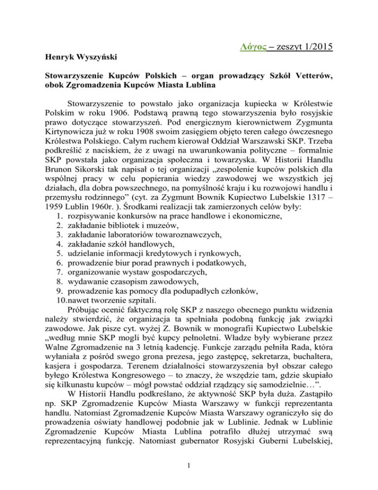Λόγος – zeszyt 1/2015 Henryk Wyszyński Stowarzyszenie Kupców Polskich – organ prowadzący Szkół Vetterów, obok Zgromadzenia Kupców Miasta Lublina Stowarzyszenie to powstało jako organizacja kupiecka w Królestwie Polskim w roku 1906. Podstawą prawną tego stowarzyszenia było rosyjskie prawo dotyczące stowarzyszeń. Pod energicznym kierownictwem Zygmunta Kirtynowicza już w roku 1908 swoim zasięgiem objęto teren całego ówczesnego Królestwa Polskiego. Całym ruchem kierował Oddział Warszawski SKP. Trzeba podkreślić z naciskiem, że z uwagi na uwarunkowania polityczne – formalnie SKP powstała jako organizacja społeczna i towarzyska. W Historii Handlu Brunon Sikorski tak napisał o tej organizacji „zespolenie kupców polskich dla wspólnej pracy w celu popierania wiedzy zawodowej we wszystkich jej działach, dla dobra powszechnego, na pomyślność kraju i ku rozwojowi handlu i przemysłu rodzinnego” (cyt. za Zygmunt Bownik Kupiectwo Lubelskie 1317 – 1959 Lublin 1960r. ). Środkami realizacji tak zamierzonych celów były: 1. rozpisywanie konkursów na prace handlowe i ekonomiczne, 2. zakładanie bibliotek i muzeów, 3. zakładanie laboratoriów towaroznawczych, 4. zakładanie szkół handlowych, 5. udzielanie informacji kredytowych i rynkowych, 6. prowadzenie biur porad prawnych i podatkowych, 7. organizowanie wystaw gospodarczych, 8. wydawanie czasopism zawodowych, 9. prowadzenie kas pomocy dla podupadłych członków, 10.nawet tworzenie szpitali. Próbując ocenić faktyczną rolę SKP z naszego obecnego punktu widzenia należy stwierdzić, że organizacja ta spełniała podobną funkcję jak związki zawodowe. Jak pisze cyt. wyżej Z. Bownik w monografii Kupiectwo Lubelskie „według mnie SKP mogli być kupcy pełnoletni. Władze były wybierane przez Walne Zgromadzenie na 3 letnią kadencję. Funkcje zarządu pełniła Rada, która wyłaniała z pośród swego grona prezesa, jego zastępcę, sekretarza, buchaltera, kasjera i gospodarza. Terenem działalności stowarzyszenia był obszar całego byłego Królestwa Kongresowego – to znaczy, że wszędzie tam, gdzie skupiało się kilkunastu kupców – mógł powstać oddział rządzący się samodzielnie…”. W Historii Handlu podkreślano, że aktywność SKP była duża. Zastąpiło np. SKP Zgromadzenie Kupców Miasta Warszawy w funkcji reprezentanta handlu. Natomiast Zgromadzenie Kupców Miasta Warszawy ograniczyło się do prowadzenia oświaty handlowej podobnie jak w Lublinie. Jednak w Lublinie Zgromadzenie Kupców Miasta Lublina potrafiło dłużej utrzymać swą reprezentacyjną funkcję. Natomiast gubernator Rosyjski Guberni Lubelskiej, 1 założone w Lublinie SKP w roku 1908 w tym samym roku rozwiązał pod zarzutem braku inicjatywy i aktywności ze strony SKP. O wpływie natomiast Warszawskiego Stowarzyszenia na środowisko lubelskie tak pisze Z. Bownik „Niewątpliwie pod tym względem zrodziła się myśl założenia w Lublinie Towarzystwa Pomocy Szkole Handlowej, a później Stowarzyszenia Wychowańców Szkoły Handlowej Zgromadzenia Kupców m. Lublina”. Jak podają cyt. źródła w czasie I Wojny Światowej znów aktywność rozwinęło Zgromadzenie Kupców m. Lublina. Aktywność ta polegała przede wszystkim na: 1. poszukiwaniu źródeł zakupu towarów, 2. przeciwdziałało spekulacji wojennej, 3. wpływało na regulację cen, 4. załatwiało sprawy rekwizycji przez wojska okupacyjne, 5. ułatwiało zdobywanie przepustek na podróże handlowe, 6. dostarczało informacji o zdolności kredytowej kupców i ich kontrahentów, 7. interweniowało w sprawach podatkowych i występowało w obronie interesów kupiectwa przed okupantem. W uzupełnieniu działalności Zgromadzenia Kupców m. Lublina SKP organizowało cele towarzyskie poprzez: 1. organizowanie zabaw 2. organizowanie koncertów, kiermaszy, widowisk, odczytów i spotkań towarzyskich w RESURSIE KUPIECKIEJ. Trzeba tutaj podkreślić, że RESURSA KUPIECKA istniała również w Lublinie „Resursa Kupiecka – jak pisze Z. Bownik – stała się czynnikiem nieoficjalnej myśli gospodarczej i organizacyjno związkowej”. Dla współczesnego czytelnika trzeba wyjaśnić czym była Resursa Kupiecka – w historii Polski i w historii Lublina. Resursa Kupiecka została założona w roku 1820 w Warszawie jeszcze za czasów Stanisława Staszica. Taka Resursa Kupiecka została założona również w Lublinie przez M. Wolskiego, Laśkiewicza, W. Moritza, W. Hesza, Zonbirta i I. Ignaszewskiego. Z. Bownik pisze na ten temat w sposób następujący: „Lubelska Resursa Kupiecka mieściła się w Pałacu (Parysów) przy ulicy Bernardyńskiej, w dzisiejszym lokalu gospody „Promień” (aktualnie jest nieistniejąca przypis H.W.), zaś w roku 1923 przy ulicy Krakowskie Przedmieście 68 naprzeciw ówczesnego Klubu Obywatelskiego i Towarzystwa Kredytowego Ziemskiego i księgarni Św. Wojciecha (dziś gmachu Sądu Okręgowego).” Bardzo ważną datą w rozwoju Stowarzyszenia Kupców Polskich w Kraju był Zjazd Kupiectwa Polskiego b. Królestwa Polskiego w Warszawie, który odbył się 16 – 17 września 1918r. W zjeździe tym wzięli między innymi tacy działacze ruchu kupieckiego jak Bogusław Hers i Henryk Bruno. Istotne zmiany w SKP zostały wprowadzone w roku 1920. Zastosowano wówczas do SKP przepisy Polskiego Prawa o Stowarzyszeniach z roku 1919. Na gruncie 2 lubelskim w roku 1921 założono również SKP, które wprost nawiązywało do tradycji SKP założonego i rozwiązanego w Lublinie w roku 1908. Inicjatywę w tej sprawie podjęli tacy działacze kupiectwa jak Tomasz Żurek, Antoni Krychowski i Badowski. W roku 1927 do istniejących już obecnie Zgromadzenia Kupców Miasta Lublina, Stowarzyszenia Kupców Polskich powołano również Izbę Przemysłowo Handlową w Lublinie. Izba ta swoim przestrzennym zasięgiem działania obejmowała także ówczesne Województwo Wołyńskie. Po formalnym powołaniu tej organizacji w roku 1927 d