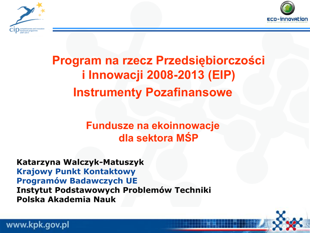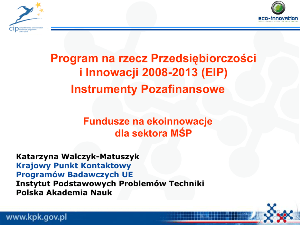 Program na rzecz Przedsiębiorczości i Innowacji 2008-2013 (EIP) Instrumenty Pozafinansowe Fundusze na ekoinnowacje dla sektora MŚP Katarzyna Walczyk-Matuszyk Krajowy Punkt Kontaktowy Programów Badawczych UE Instytut Podstawowych Problemów Techniki Polska Akademia Nauk Eko-innowacje w Programie EIP Projekty pilotażowe i powielania rynkowego: • Pierwsze zastosowanie lub powielanie rynkowe ekoinnowacyjnych technik, produktów i praktyk; nie dotyczą projektów ze sfery B+R; • Obszary priorytetowe: recycling materiałów, budownictwo, sektor spożywczy, ekologiczny biznes i inteligentne zakupy •Budżet: na lata 2008-2013 budżet inicjatywy wynosi 195 mln euro Eko-innowacje – zasady konkursów Podstawowe zasady konkursów: • • • • • • Jeden konkurs w ciągu roku (otwarty od kwietnia do września) Budżet konkursu: do 30 mln euro Dofinansowane wnioski/budżet: do 40 / 800 tys. euro Poziom dofinansowania KE: 50% Długość projektu: do 36 miesięcy Zarządzanie projektami: Agencja Wykonawcza ds. Konkurencyjności i Innowacji (EACI) we współpracy z DG Środowisko Eko-innowacje – zasady konkursów Kto może aplikować? • Pojedyncze małe lub średnie przedsiębiorstwo • Konsorcjum narodowe skupiające MŚP, duże przedsiębiorstwa, klastry, jednostki badawcze, instytucje publiczne itp…. • Konsorcjum międzynarodowe skupiające MŚP, duże przedsiębiorstwa, klastry, jednostki badawcze, instytucje publiczne itp… • Państwa biorące udział w inicjatywie: 27 Państw Członkowskich UE, Norwegia, Lichtenstein, Islandia, kraje Bałkanów Zachodnich, Turcja, Izrael; Eko-innowacje – zasady konkursów Kategorie kosztów kwalifikowanych: • Koszty osobowe – na podstawie karty pracy; • Sprzęt i infrastruktura – amortyzacja, jedynie na czas trwania projektu; • Podwykonawstwo – do 35% całkowitych kosztów kwalifikowanych; nie dotyczy zadań głównych (core task); • Spotkania i podróże – niezbędne do realizacji projektu; • Inne koszty – nie obejmują kosztów elektryczności i gazu; • Koszty pośrednie – narzut do 7% całkowitych kosztów kwalifikowanych; Projekt nie może generować zysku. Projekt nie może finansować badań! Eko-innowacje – zasady konkursów Rezultaty / oddziaływanie projektu: Wskaźnik „SMART”: Specific, Measurable, Achievable, Realistic, Timely Przykłady: • Redukcja emisji CO₂w stosunku do istniejących rozwiązań; • Redukcja zużycia wody o 6000 m² w stosunku do rozwiązania wiodącego na rynku; • Oszczędność energii do 35% w procesie produkcyjnym; Eko-innowacje – zasady konkursów Jak przebiega ewaluacja wniosku? Ewaluacja na etapie formalnym dokonywana jest przez pracowników Agencji, oceny merytorycznej dokonują eksperci zewnętrzni. Kryteria oceny wniosków: 1. Eligibility criteria (yes/no) 2. Exclusion criteria (yes/no) 3. Selection criteria (yes/no) 4. Award criteria (score) Eko-innowacje – zasady konkursów Kiedy będę mógł zacząć realizować projekt? luty/marzec wrzesień Otwarcie konkursu kwiecień Ewaluacja wniosków Negocjacje styczeń/luty Realizacja projektu Eko-innowacje – zasady konkursów Jak złożyć wniosek? 1. Zapoznaj się z dokumentami konkursowymi: zaproszenie do składania wniosków (Call for Proposals), model umowy (Model Grant Agreement), przewodnik dla beneficjenta (Guide for Proposers), przewodnik po systemie EPSS (EPSS user guide), formularze wniosku (Application Form) oraz FAQ 2. Elektroniczne składanie wniosków w systemie EPSS (Electronic Proposal Sumbission Service) http://ec.europa.eu/environment/eco-innovation/index_en.htm Eko-innowacje – przykład projektu Przykład I: Zintegrowana instalacja do recyclingu tworzyw sztucznych wykorzystywanych w rolnictwie Cele projektu: • opracowanie instalacji do recyclingu tworzyw sztucznych wykorzystywanych w rolnictwie; • wykorzystanie instalacji jako wzorca dla innych instalacji – replikacja; • redukcja negatywnego oddziaływania na środowisko naturalne generowanego przez składowanie lub utylizację tworzyw sztucznych: zanieczyszczenia gleby, skażenia wód powierzchniowych i gruntowych. Korzyści dla środowiska naturalnego: • przetwarzanie 7 tys. ton odpadów w postaci tworzyw sztucznych rocznie; • redukcja negatywnego wpływu na środowisko związanego z transportem tworzyw sztucznych (np.: emisja spalin, hałas); • redukcja zanieczyszczenia środowiska naturalnego: brak konieczności utylizacji i składowania tworzyw sztucznych. Eko-innowacje – konkurs 2008 wyniki… Uczestnicy projektów wg kraju (konkurs 2008) Bułgaria Czechy Grecja Izrael Luksemburg F.Y.R.O. M. Malta Cypr Estonia Finlandia Izrael Czarnogóra Polska Węgry Portugalia Słowenia Dania Belgia Austria Francja Wielka Brytania Holandia Niemcy Włochy Hiszpania 1 1 1 1 1 1 1 •42 dofinansowane wnioski spośród 134 2 2 2 2 2 •175 uczestników z 25 państw •75% udział MŚP 3 4 4 •90% udział sektora prywatnego 4 7 8 9 10 10 18 26 27 0 5 10 15 20 25 28 30 Eko-innowacje a polskie przedsiębiorstwa Dofinansowane projekty z polskim uczestnictwem: RECTYRE: • przebadanie oraz zastosowanie surowca pochodzącego z recyclingu, jako wypełnienia nasypów drogowych. Materiał, który ma być przetestowany to guma otrzymywana poprzez zmielenie zużytych opon; • uczestnik Mostostal Warszawa S.A. (duże przedsiębiorstwo) WASTERED: • redukcja odpadów w przemyśle mięsnym i spożywczym poprzez zastosowanie metody ograniczającej powstawanie szlamu, oczyszczającej wodę oraz stabilizującej proces biologicznego oczyszczania wody; • uczestnik firma Prowater (podmiot z sektora MŚP). Eko-innowacje - synergia funduszy… STRUCTURAL FUNDS FP7 + CIP 67 billion euro 58 billion euro EBI research technology development RESEARCH UNITS training, social fund investments SMEs, INDUSTRY TECHNOLOGY CLUSTERS Eko-innowacje - synergia funduszy… Modele finansowania przedsięwzięć: Współfinansowanie: - zgodnie z artykułem 54(5) Regu